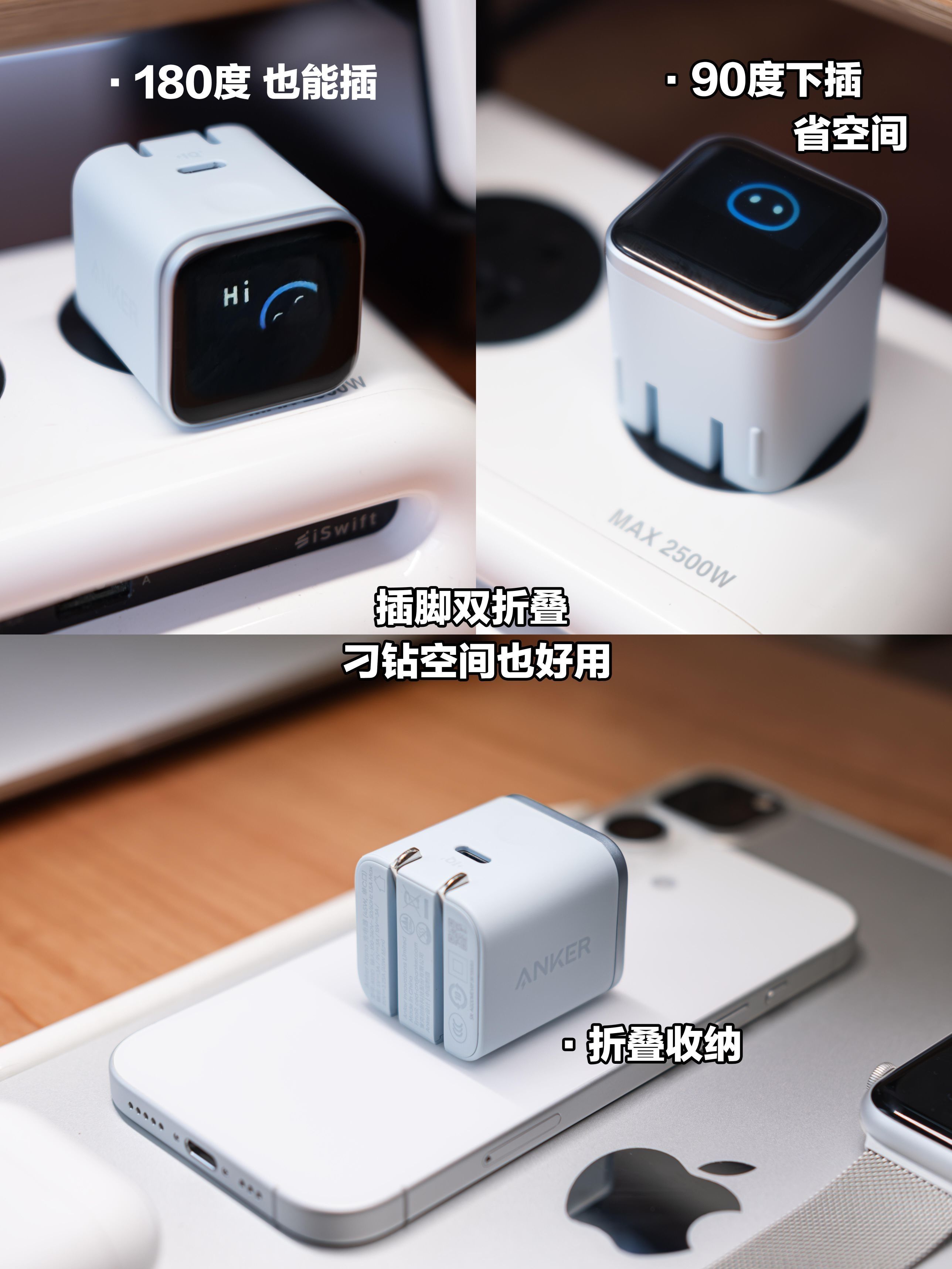 安克这款安心充Smart真的戳中果粉心巴!作为能进Apple Store的国产品牌,用着比原装还放心,关键智能屏显+萌宠彩蛋+精准控机,太懂强迫症+颜控了~ 核心配置直接拉满:45W Max氮化镓功率,体积比原装小30%,方块造型配橙、白、蓝等配色,磨砂机身+隐藏式屏幕质感绝了。专利双折叠插脚能90°+180°调节,出差塞口袋毫无压力,全球通100-240V电压去哪都能用。 最惊艳的是智能...