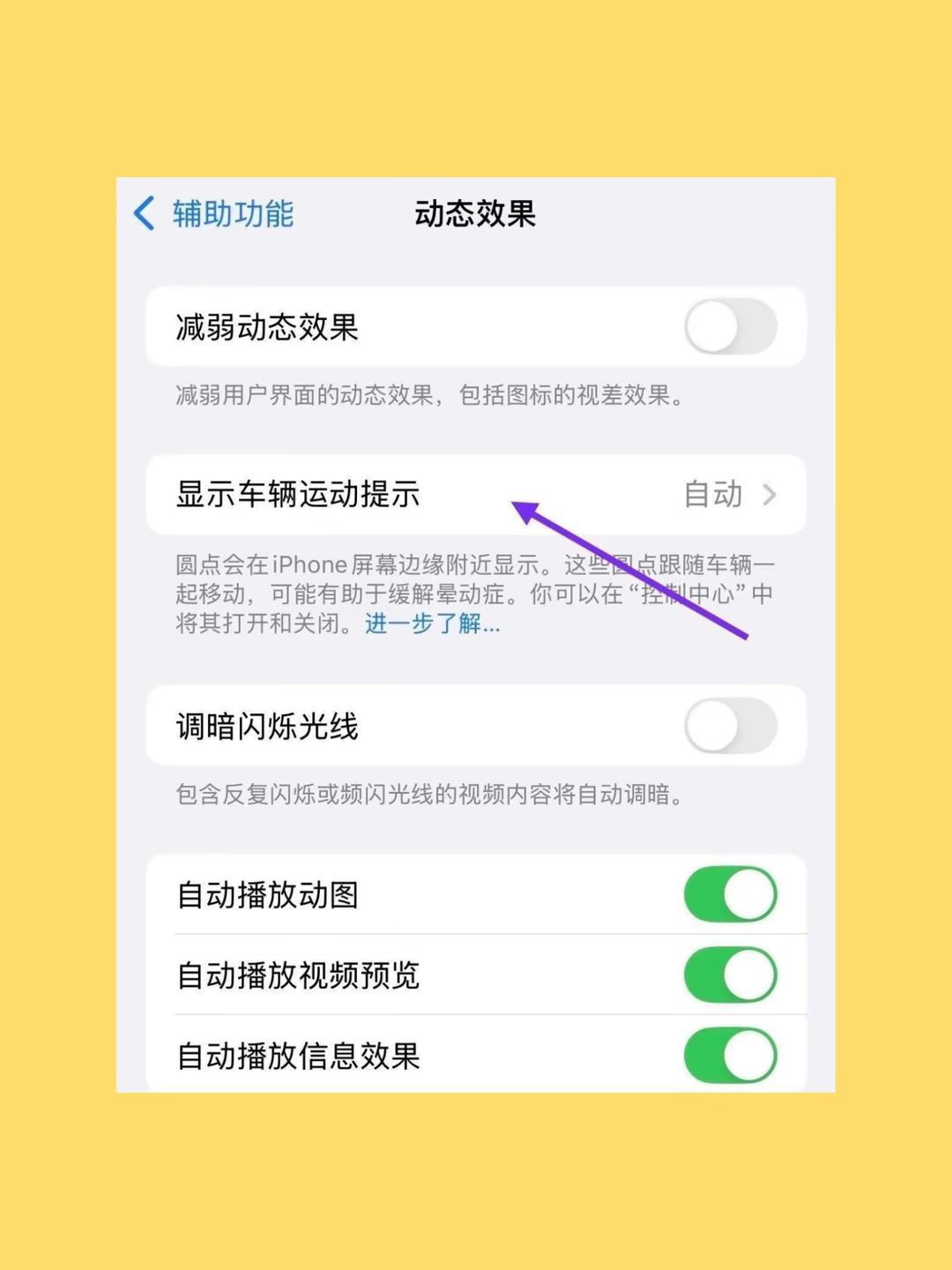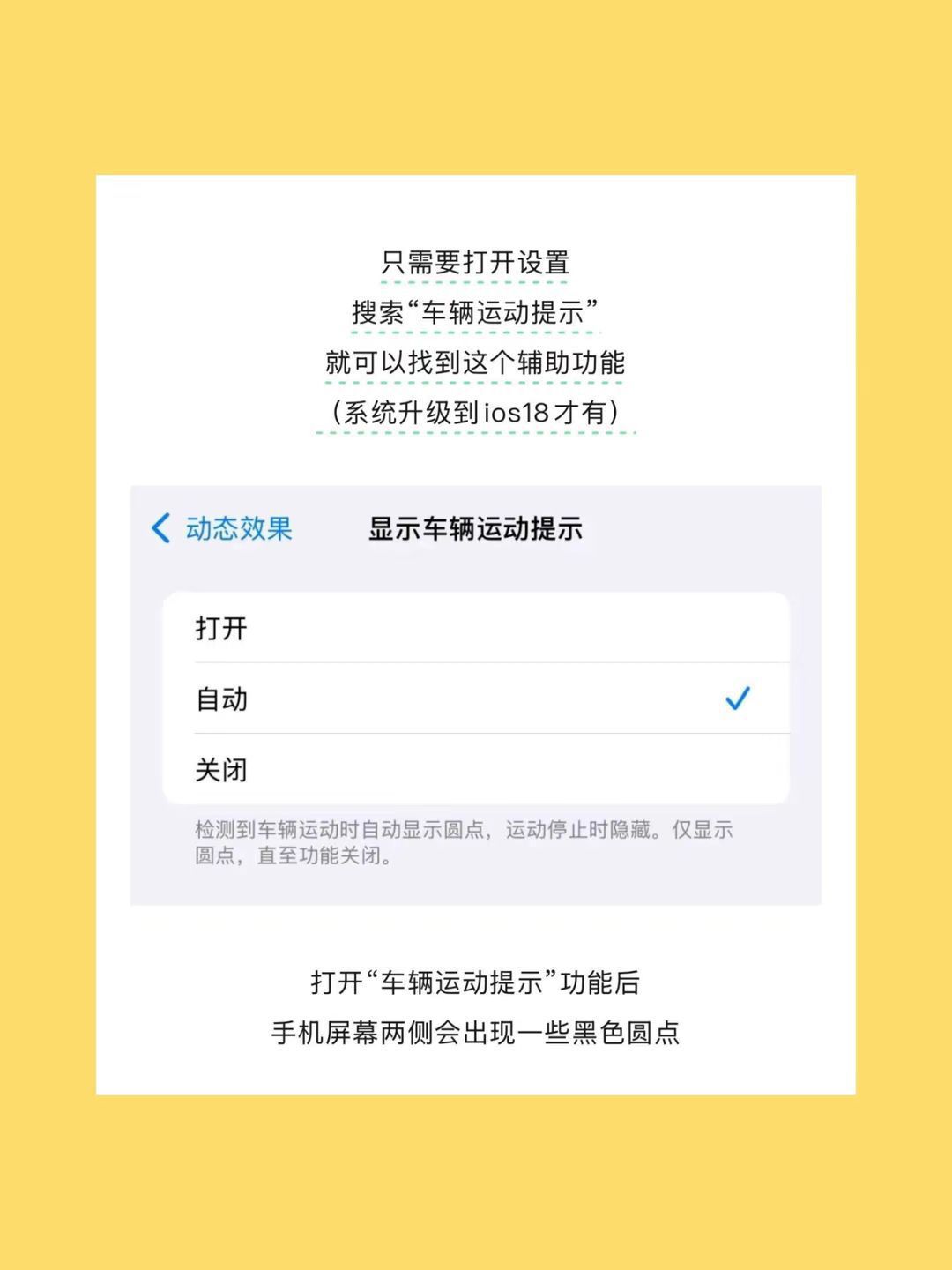 谁懂啊!每次坐车看手机/低头看导航,不到10分钟必头晕恶心,朋友告知苹果手机居然有自带晕车buff 原理超简单:屏幕会跳出个小圆点,跟车的加速、减速、转弯完全同步动。之前晕车是眼睛看手机(觉得静止)但内耳感知在动,大脑直接乱套;现在圆点帮眼睛“看见”运动,感官不打架,恶心头晕直接退退退! ⚠️先划重点: • 系统必须更到iOS18及以上 • 机型要iPhone XR或之后(老机型家人们先哭哭)...
