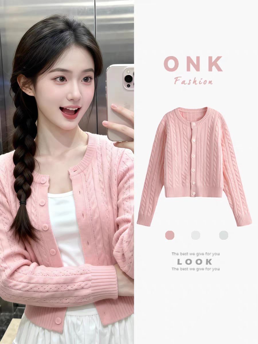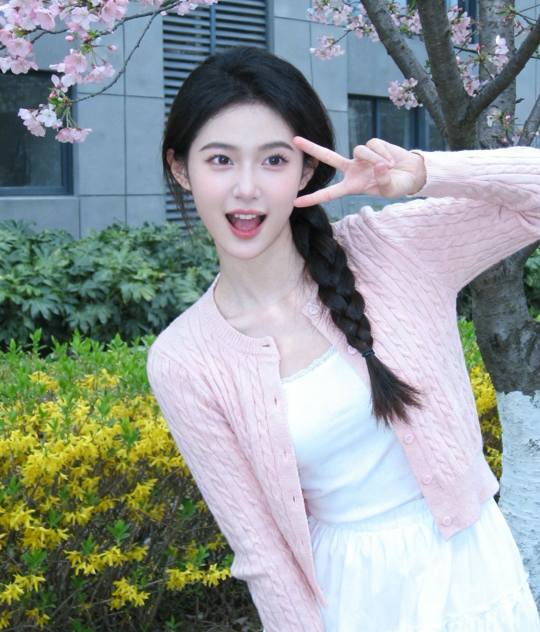 淡粉色麻花针织开衫+白色蕾丝内搭+白色百褶裙,搭配侧边麻花辫,把春日的温柔与甜美穿在身上,一整个青春灵动,谁看了不喊句“春日甜妹”!