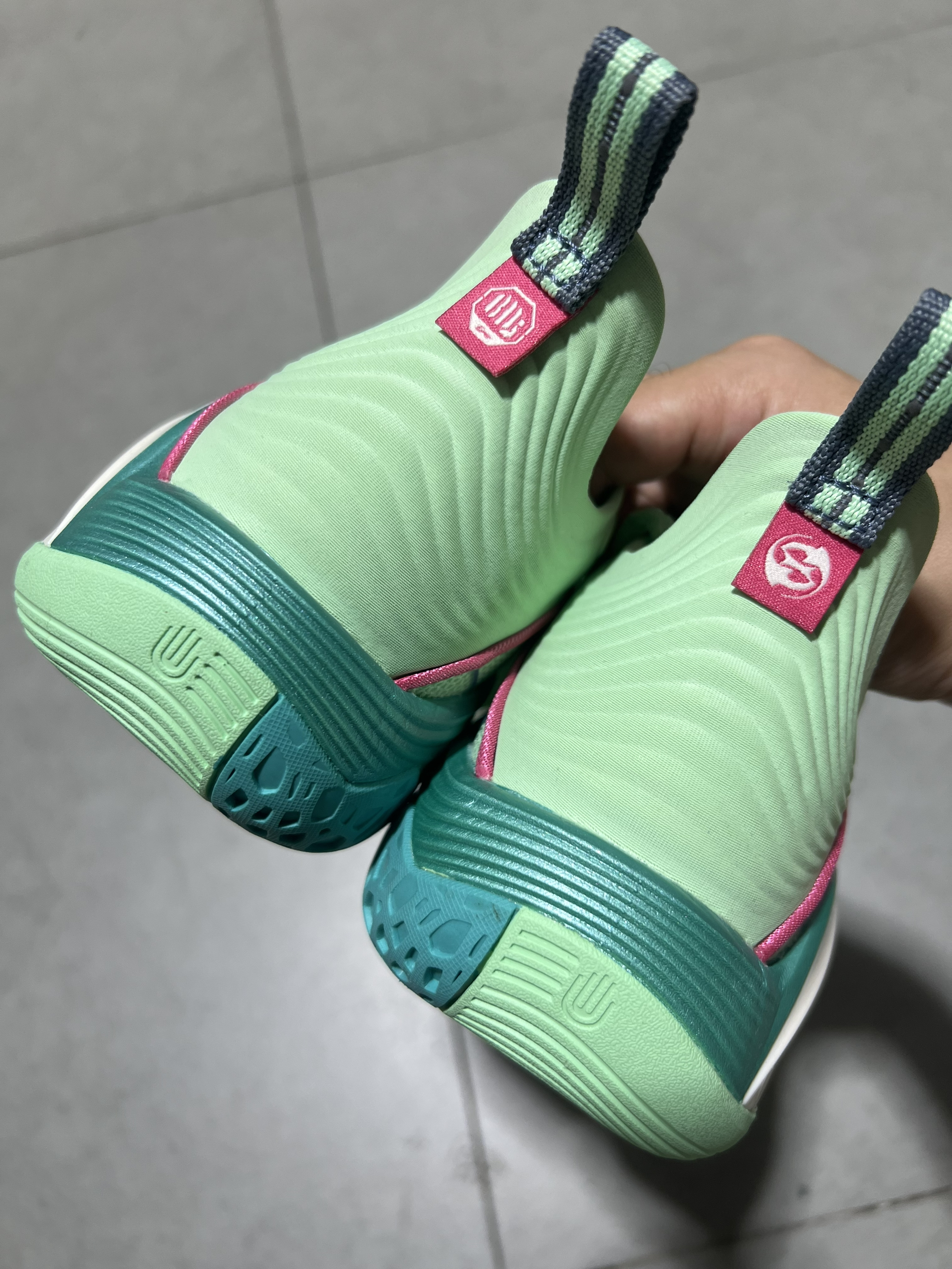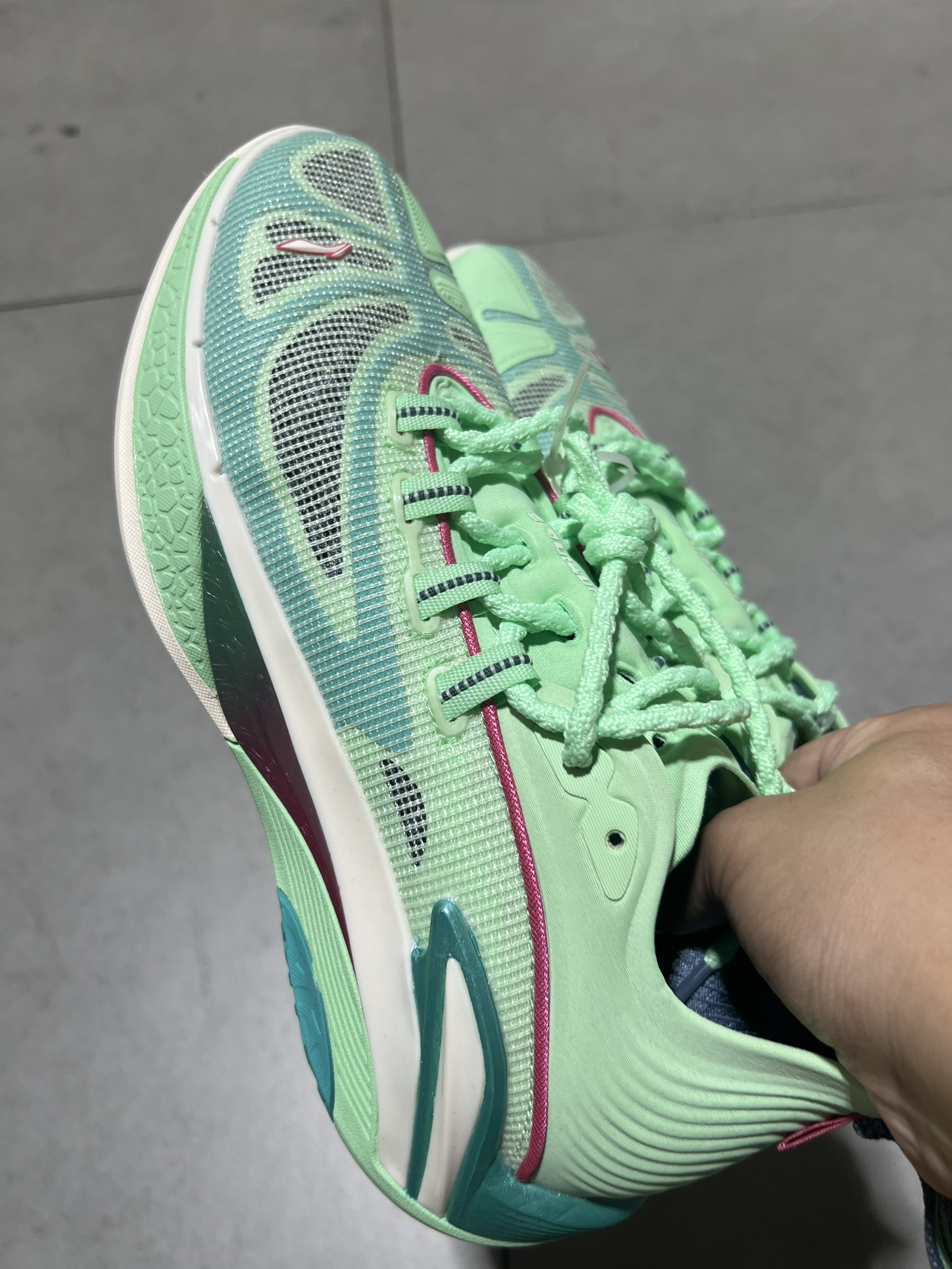 追猎一代这个颜色,好像是上了金属漆一样,跟我的万代模型有点像 实测一个月,说点大实话 作为常年打外场的突破党,这双追猎一代绿色我穿了一整个月。外底颜值是真没得说,全掌分段超䨻脚感偏软弹,落地缓震够用,膝盖确实没酸过,但前掌Lightfoam Plus框架包裹太紧,我初穿甚至有点夹脚,不过感觉磨合三场可以适应。 外场耐磨扛造,但细节我是真忍不了 TUFF OS橡胶底是真的狠,水泥地急停抓地稳,但纹路...