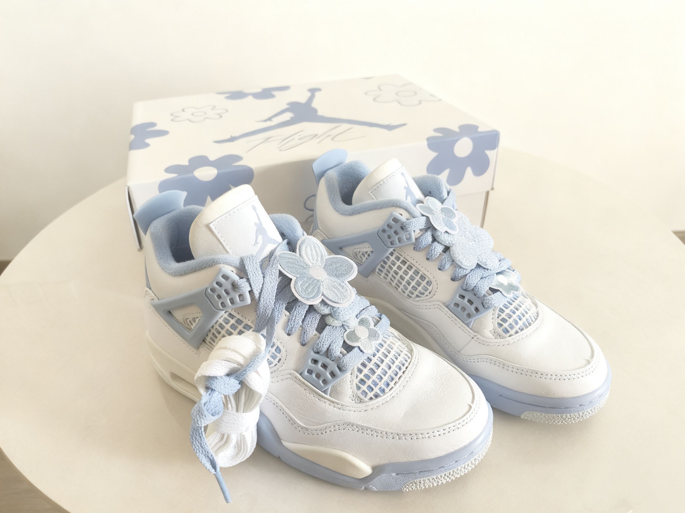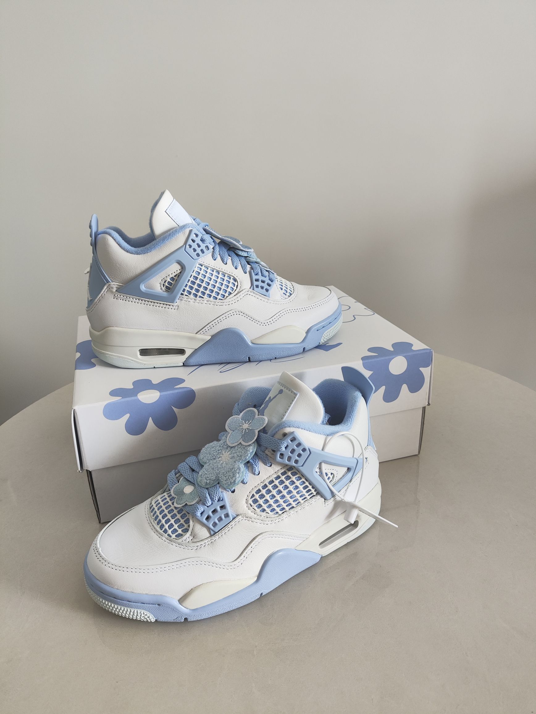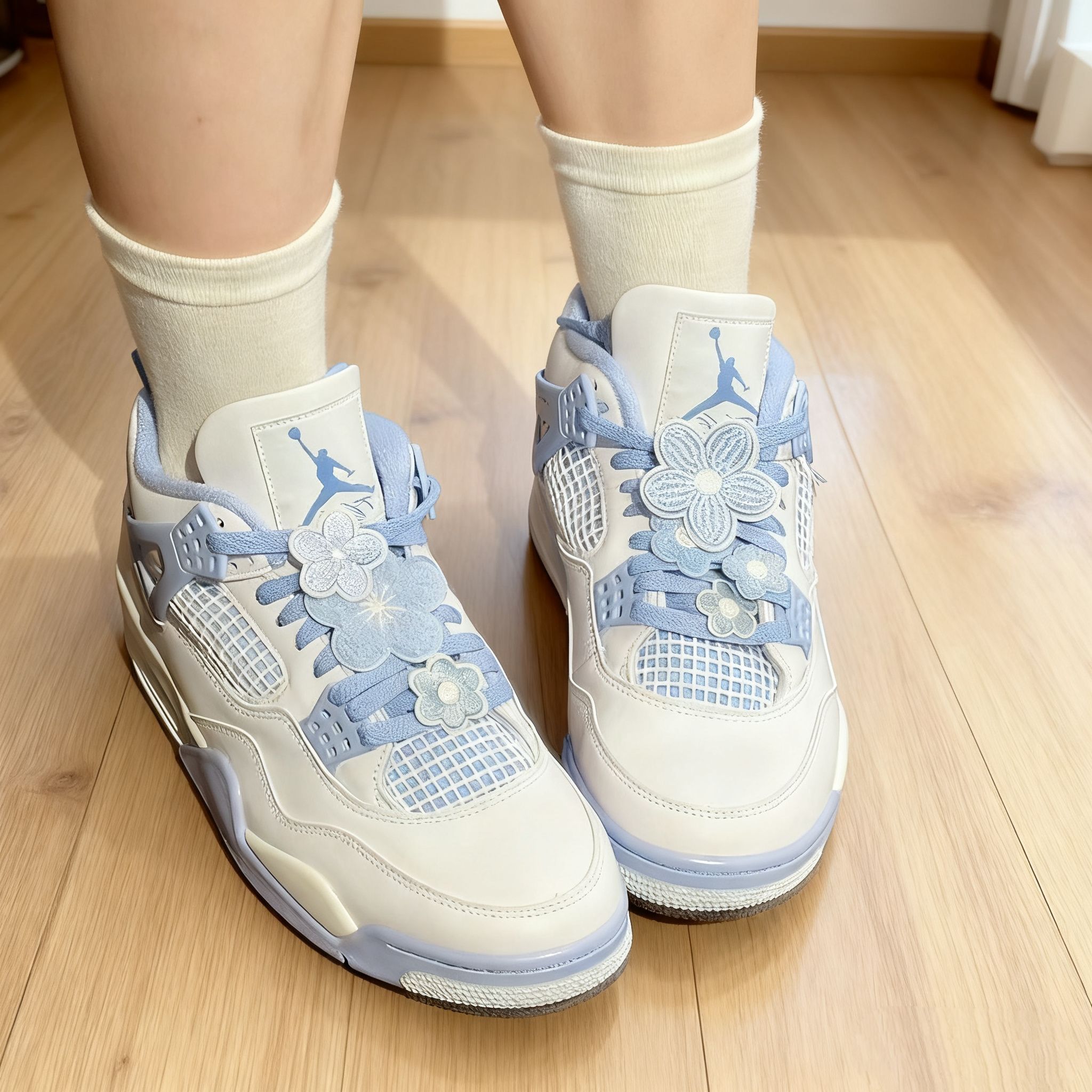 家人们!谁能拒绝这么软萌的AJ4啊🥺淡奶白+ Baby蓝的组合,像把马卡龙穿在脚上,春夏氛围感直接拉满~ ✨细节控狂喜: 鞋身皮质细腻到能掐出水,淡蓝色包边、鞋舌飞人标都透着精致感;鞋带上的小花装饰是点睛之笔,软乎乎的布艺质感,甜妹属性直接拉满,连鞋带都能玩出“花系穿搭”小心思~ 👟上脚体验&搭配: AJ4的缓震脚感不用多说,日常逛一天街也不累!搭配白色中筒袜+短裙,是学院风甜妹;配ove...