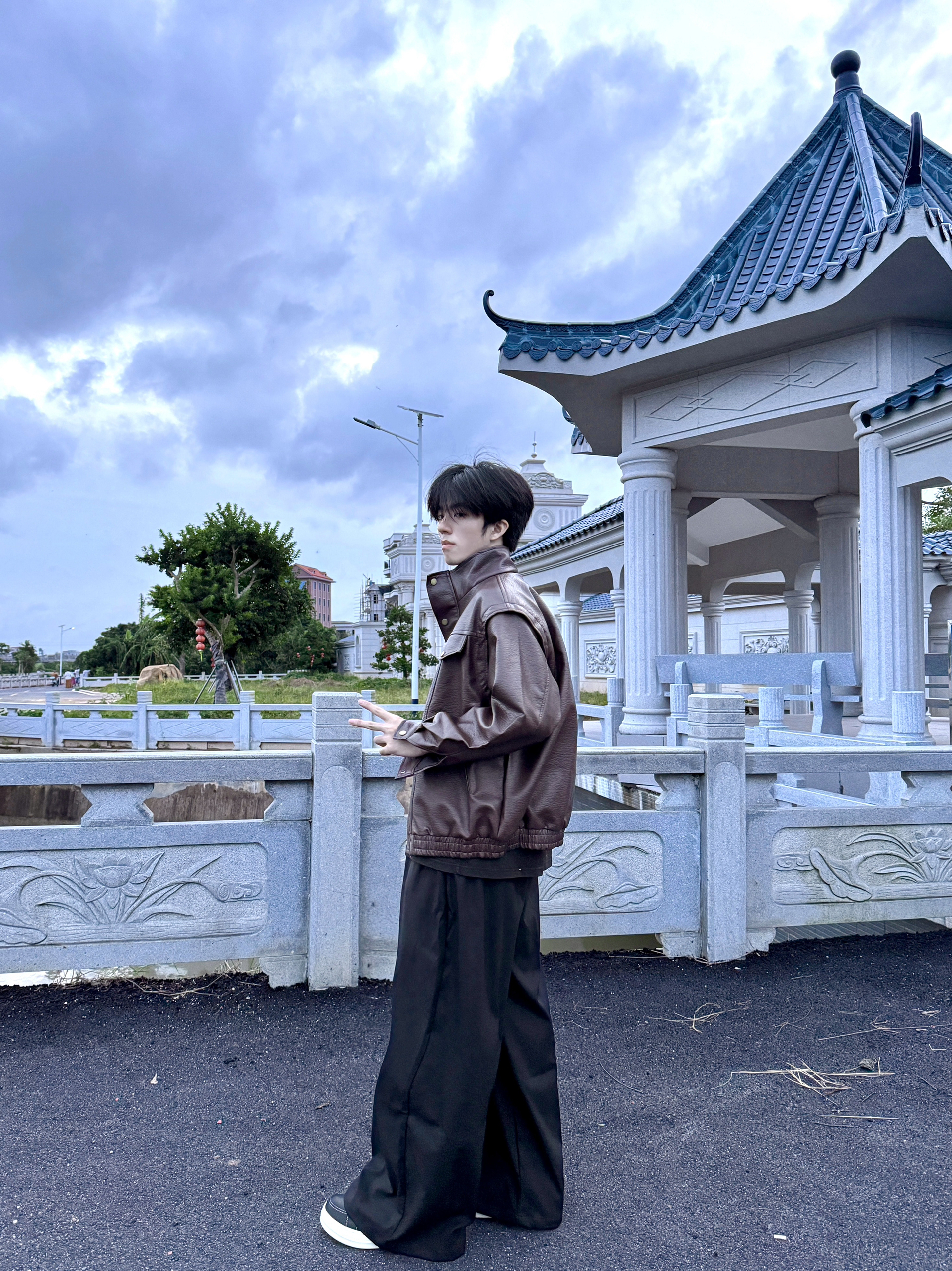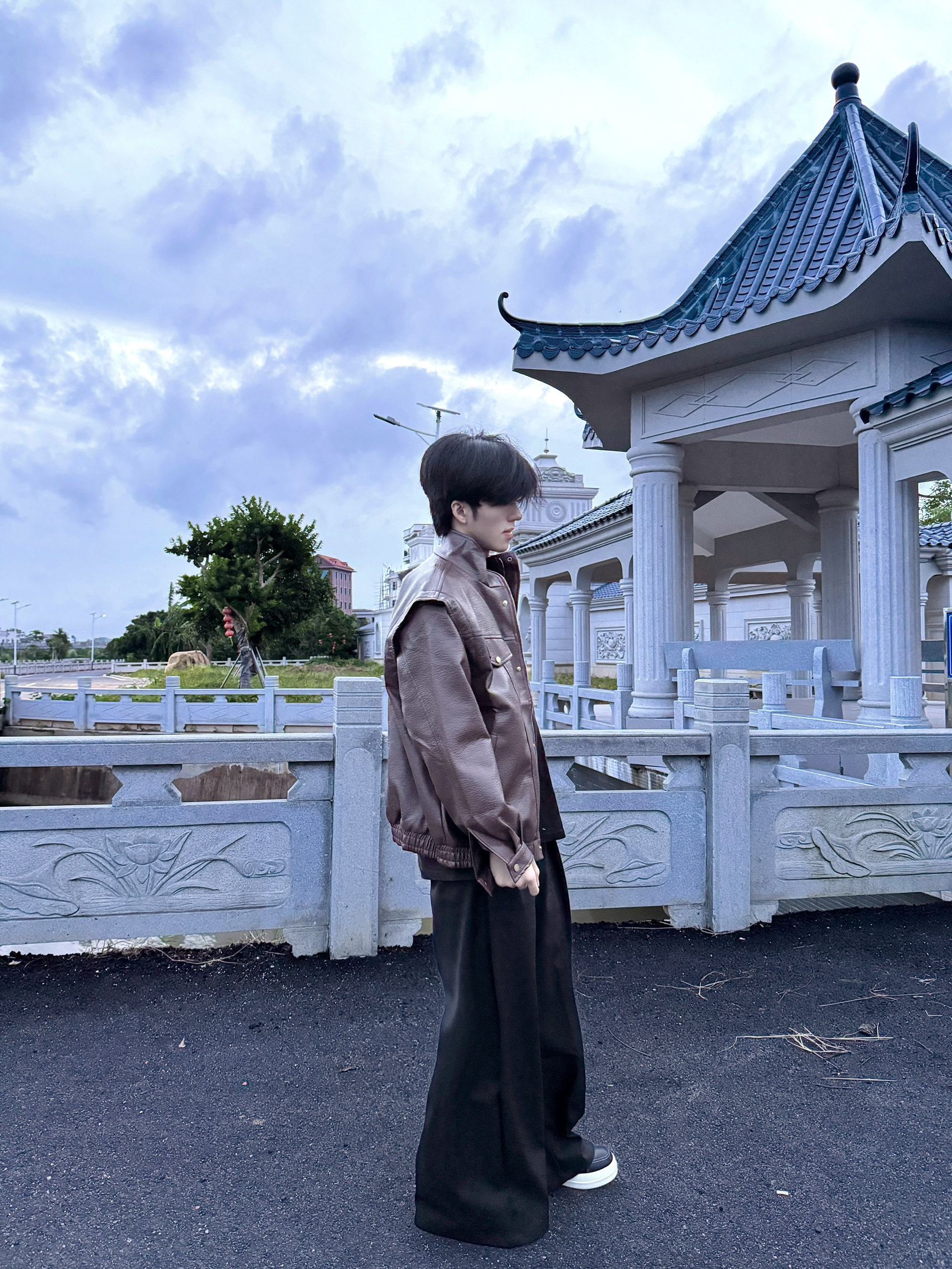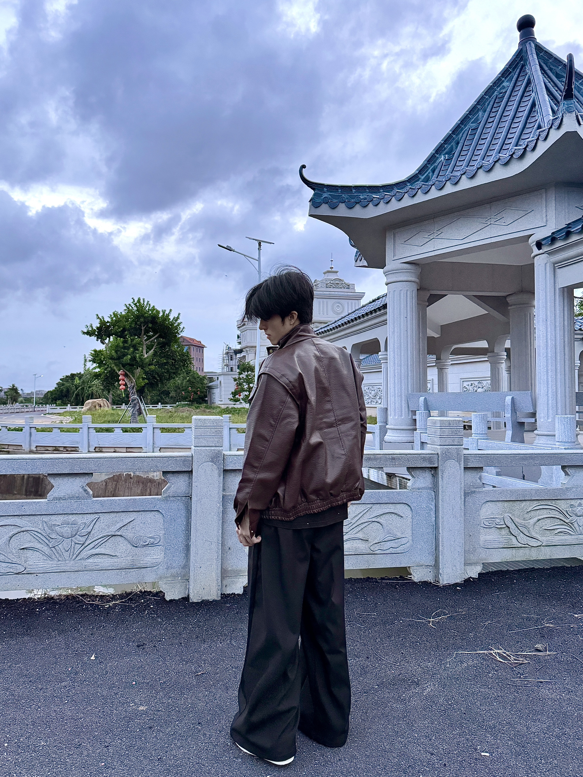 那天天气有点阴,我穿着这件棕色皮衣,配着黑裤子,在村里的古亭边上待了会儿。这皮衣看着挺有质感,版型宽松但不拖沓,站在雕着花的石栏旁,和旁边古色古香的亭子莫名和谐。风一吹,皮衣的料子软软的,也不闷。平时我不太爱搞复杂穿搭,这种简单的搭配,在这种有点古韵的地方,倒显得挺自在,也没觉得和环境突兀,就很舒服地拍了几张。