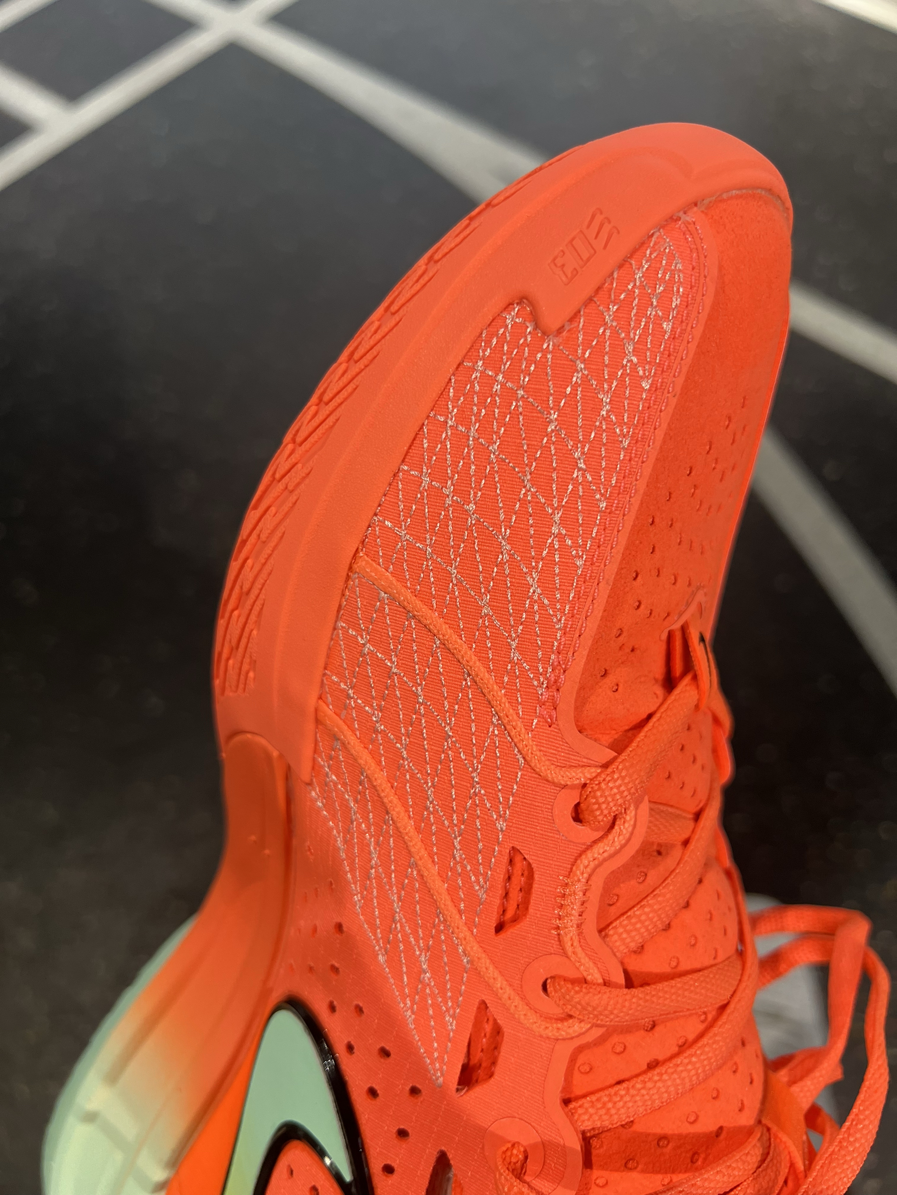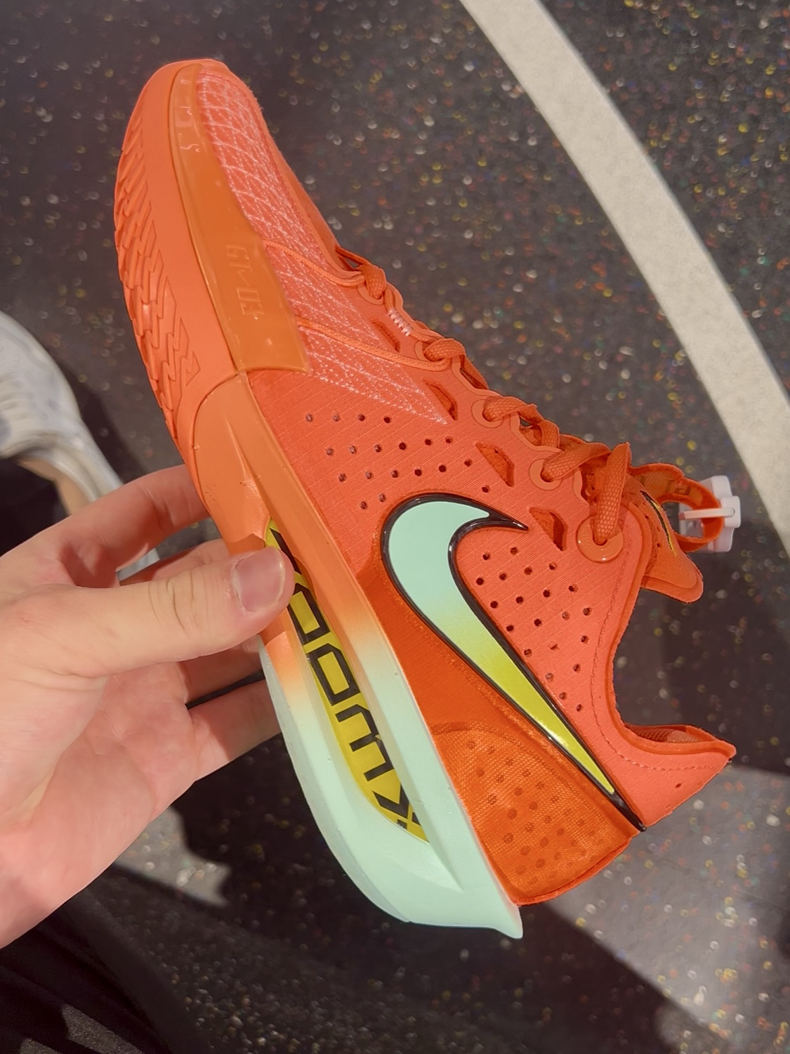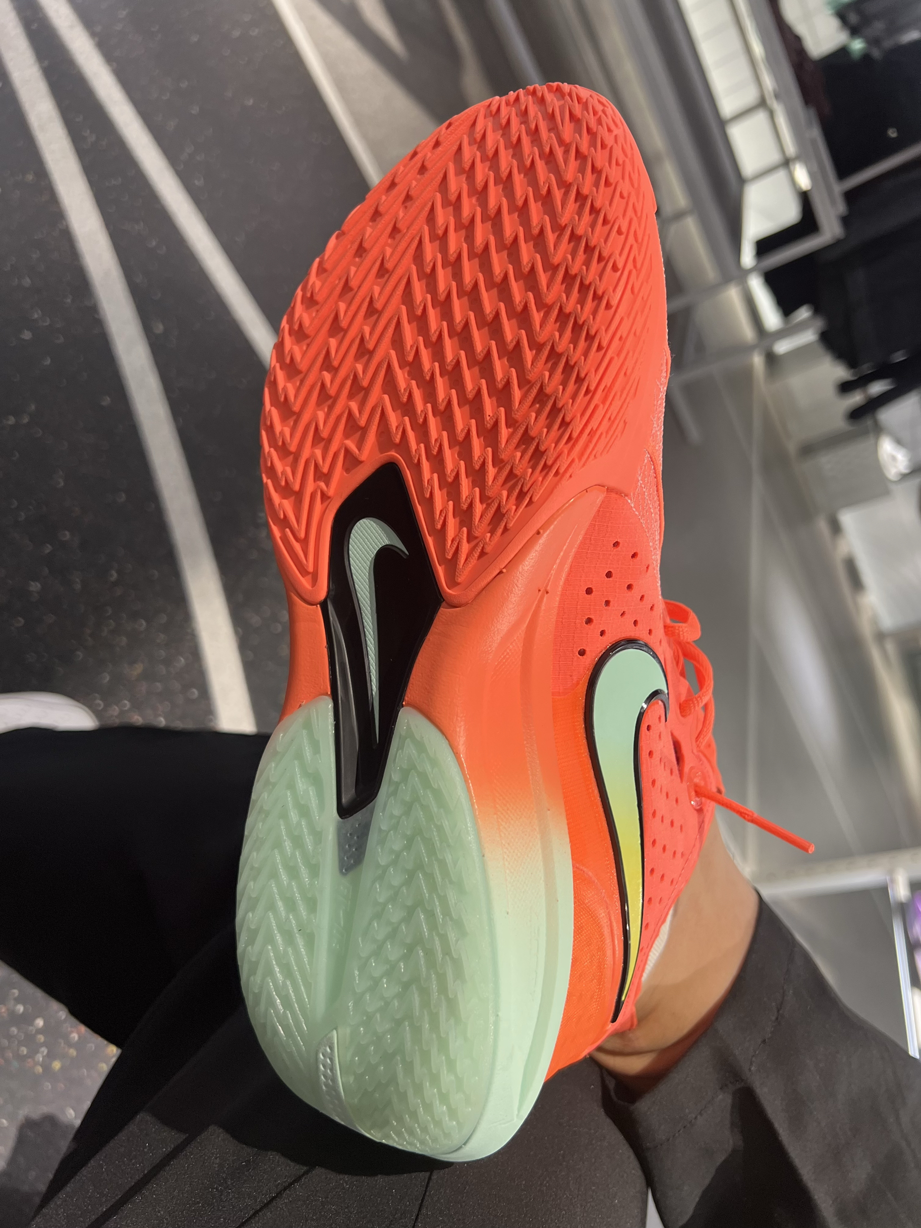 这个配色一看就是非常酷炫,穿到球场会很吸睛 通体亮橙色,swoosh和鞋底边缘加上一点渐变的蓝绿色,还是比较协调的 我觉得这个配色很好看,第一眼就喜欢上啦🤩 ❌耐磨:但这双鞋底耐磨可能没那么好,最好在室内吧 ❌透气:虽然看着很多小孔,透气性还是不太好