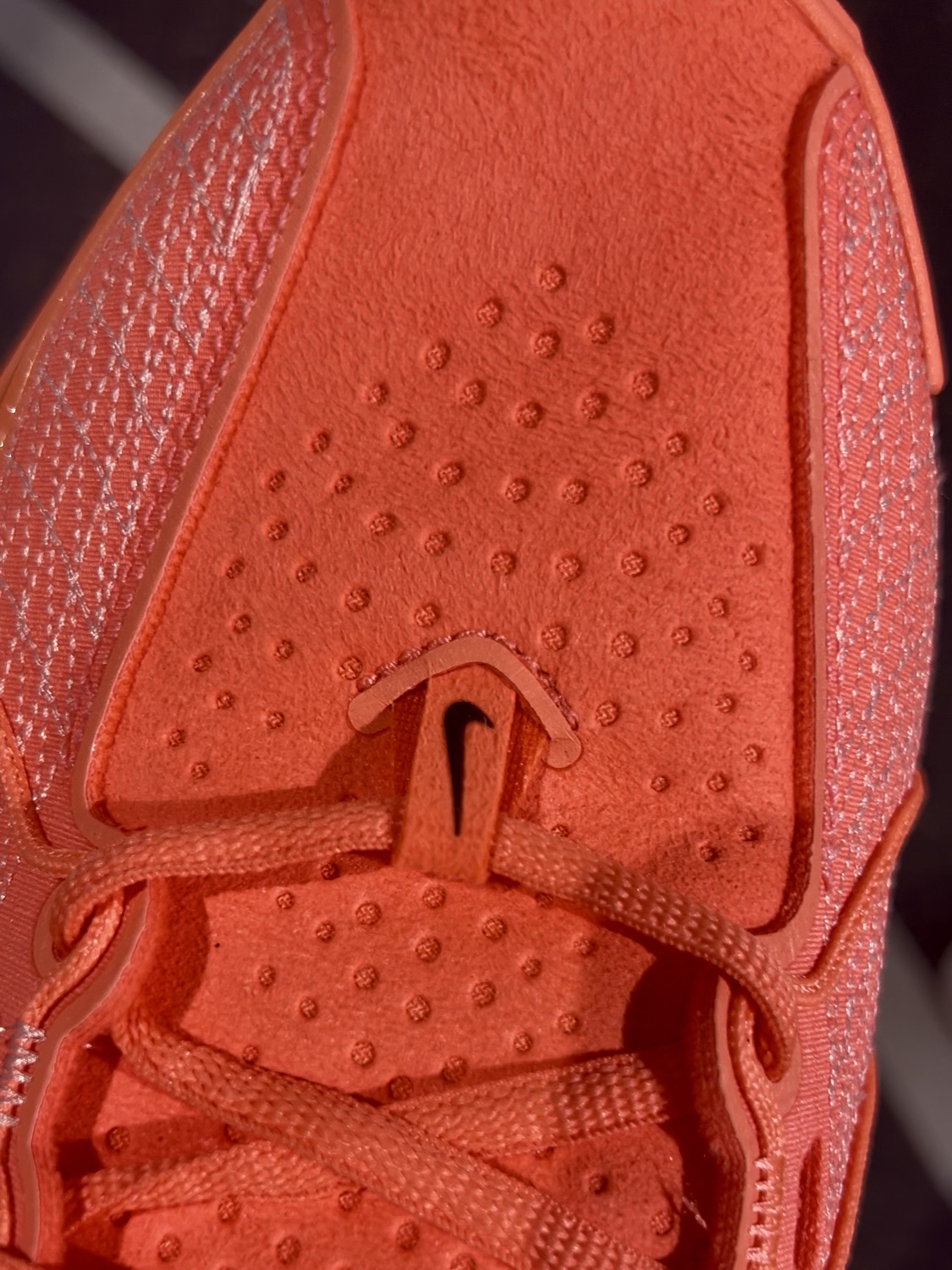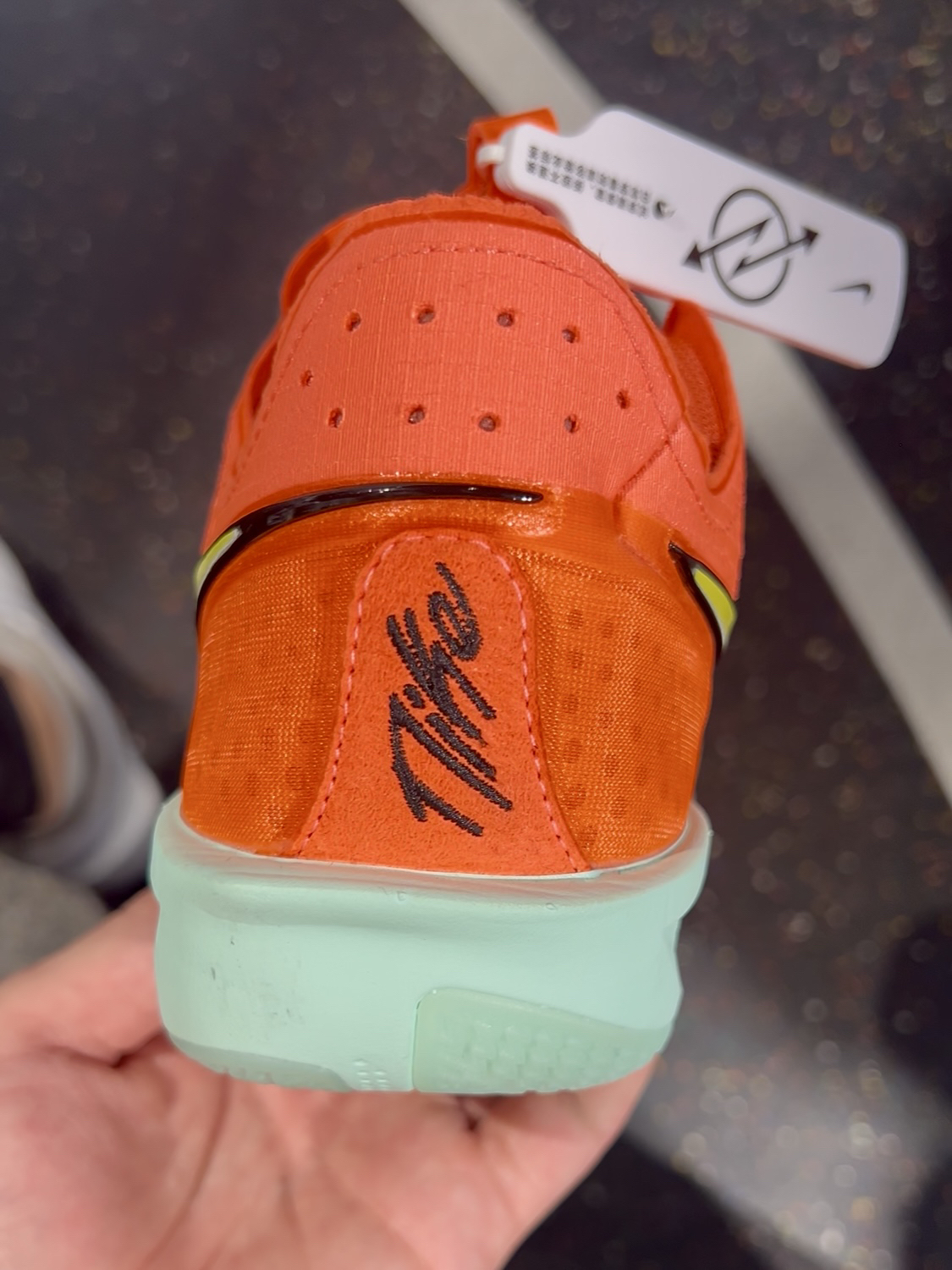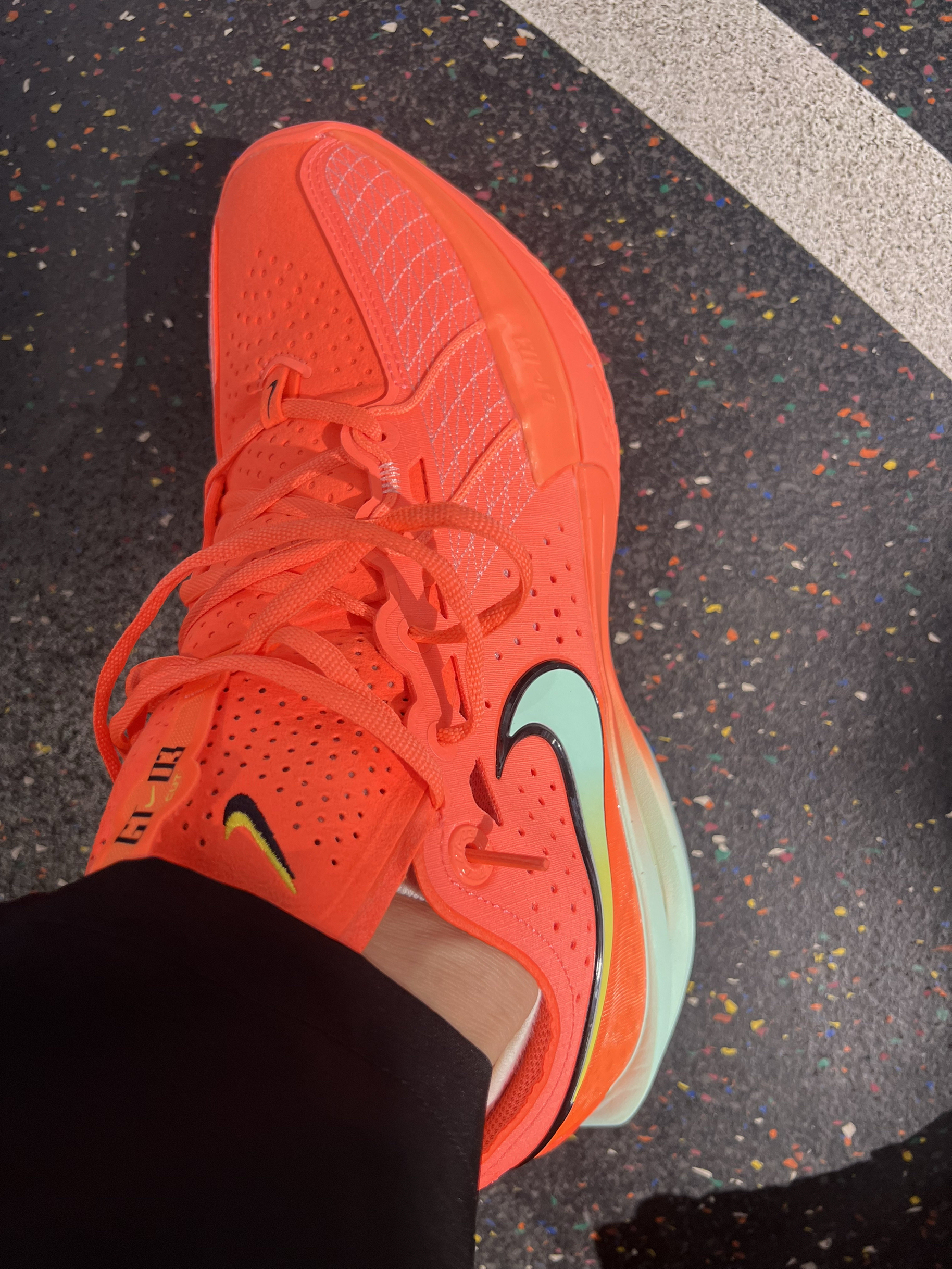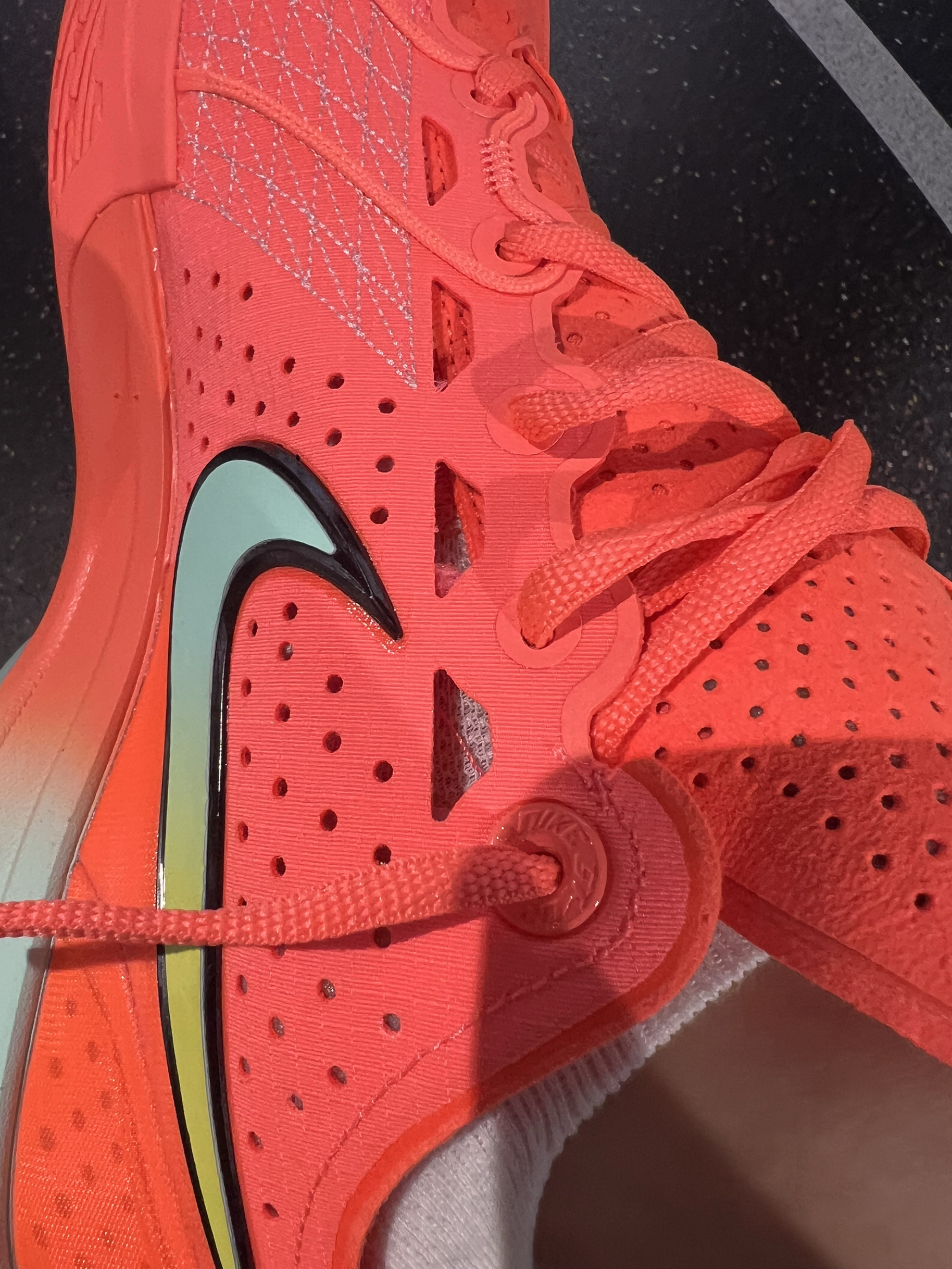 这个配色一看就是非常酷炫,穿到球场会很吸睛 通体亮橙色,swoosh和鞋底边缘加上一点渐变的蓝绿色,还是比较协调的 我觉得这个配色很好看,第一眼就喜欢上啦🤩 ❌耐磨:但这双鞋底耐磨可能没那么好,最好在室内吧 ❌透气:虽然看着很多小孔,透气性还是不太好