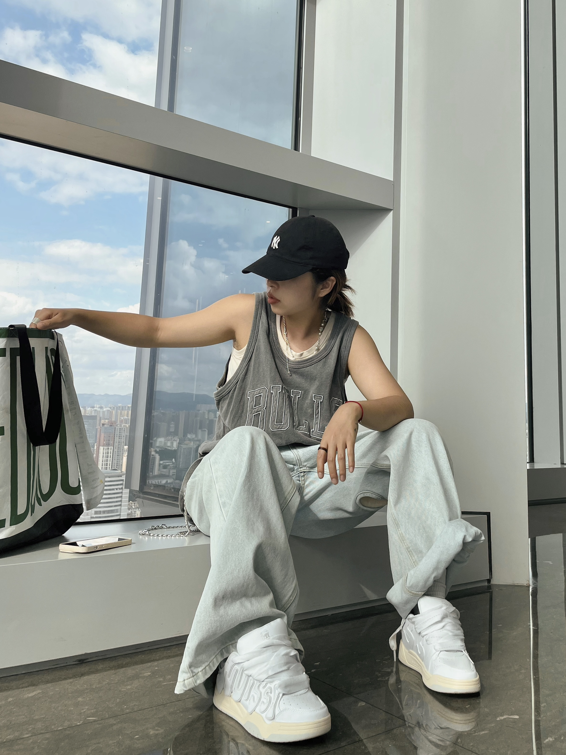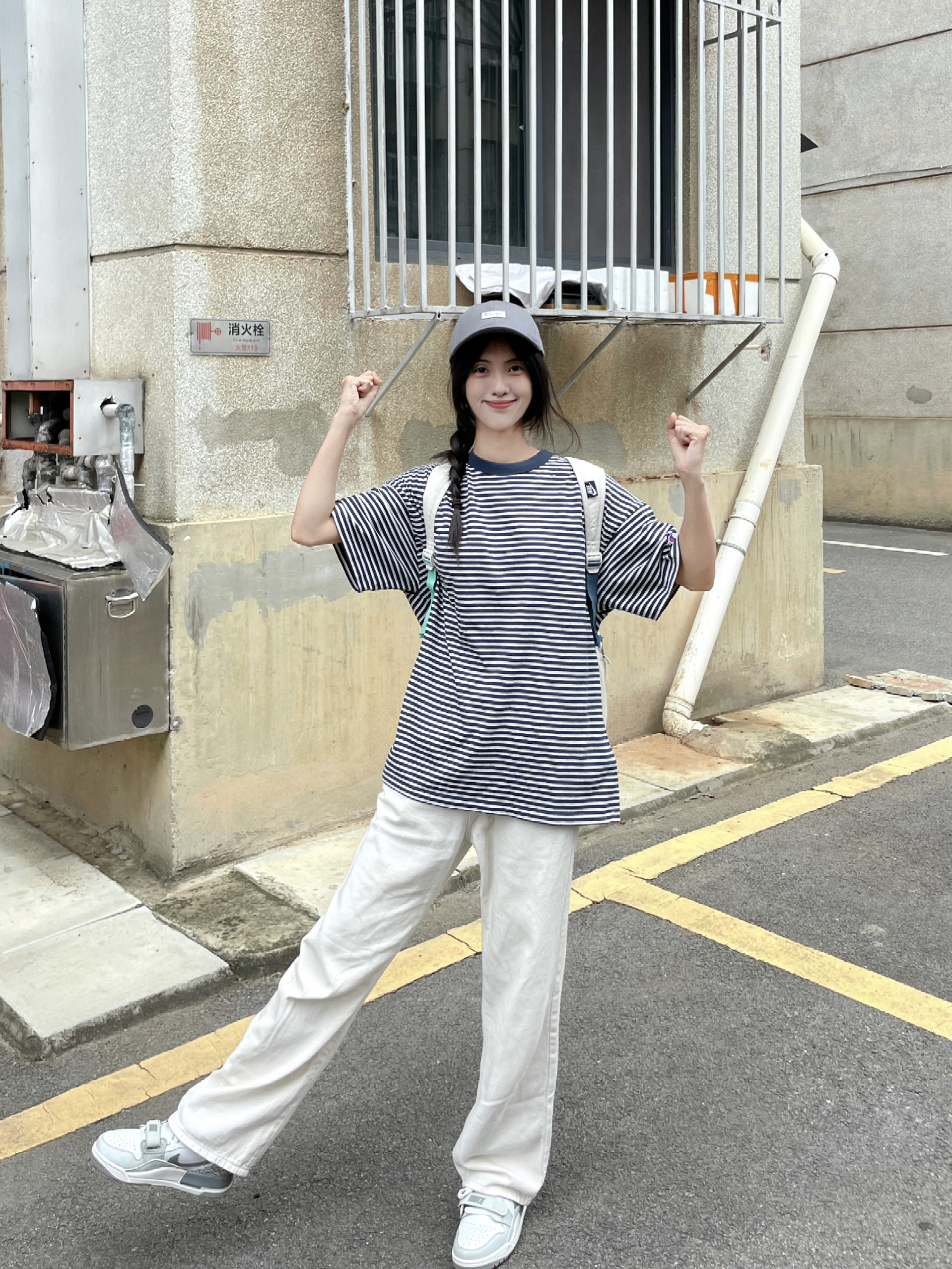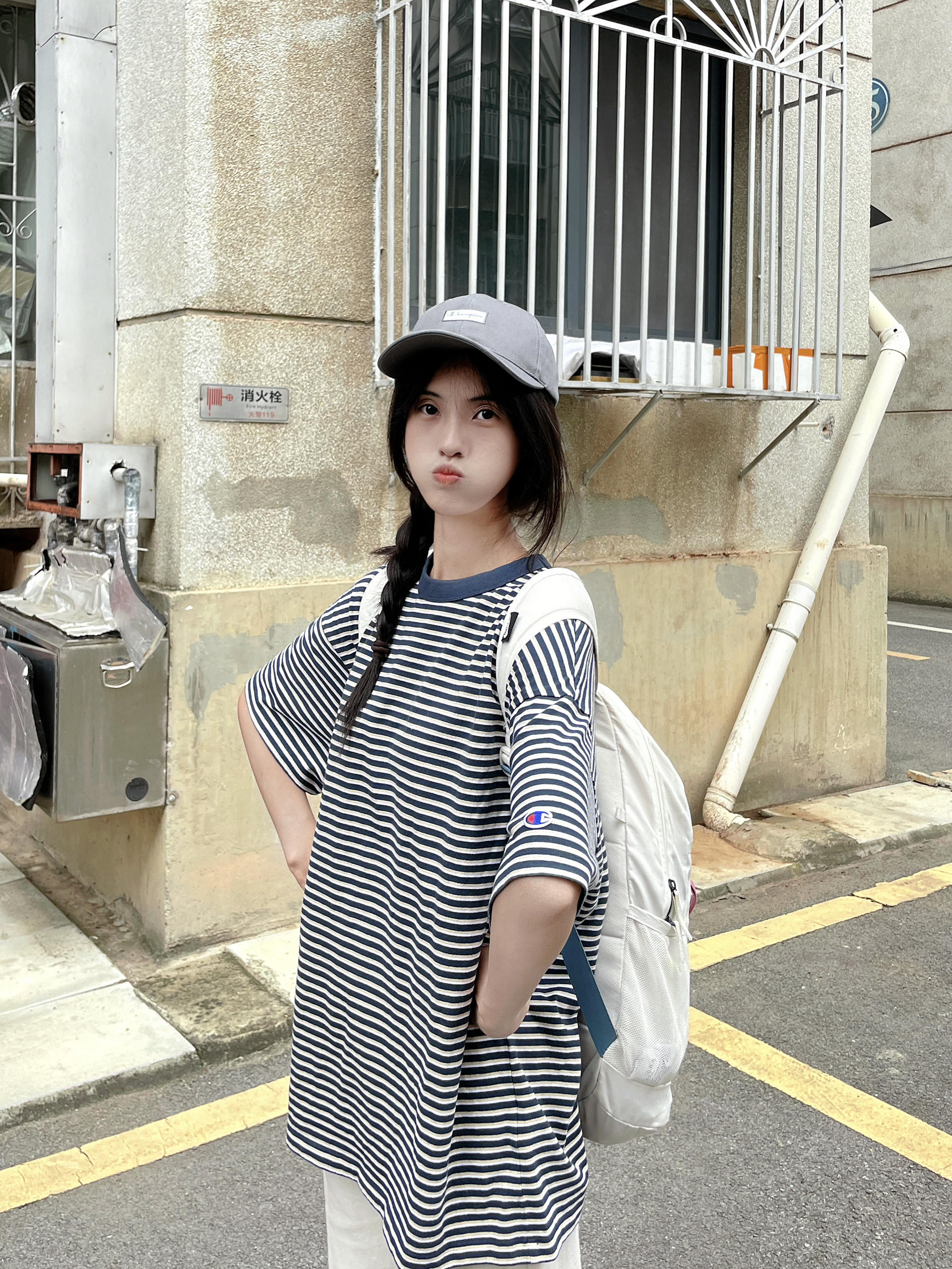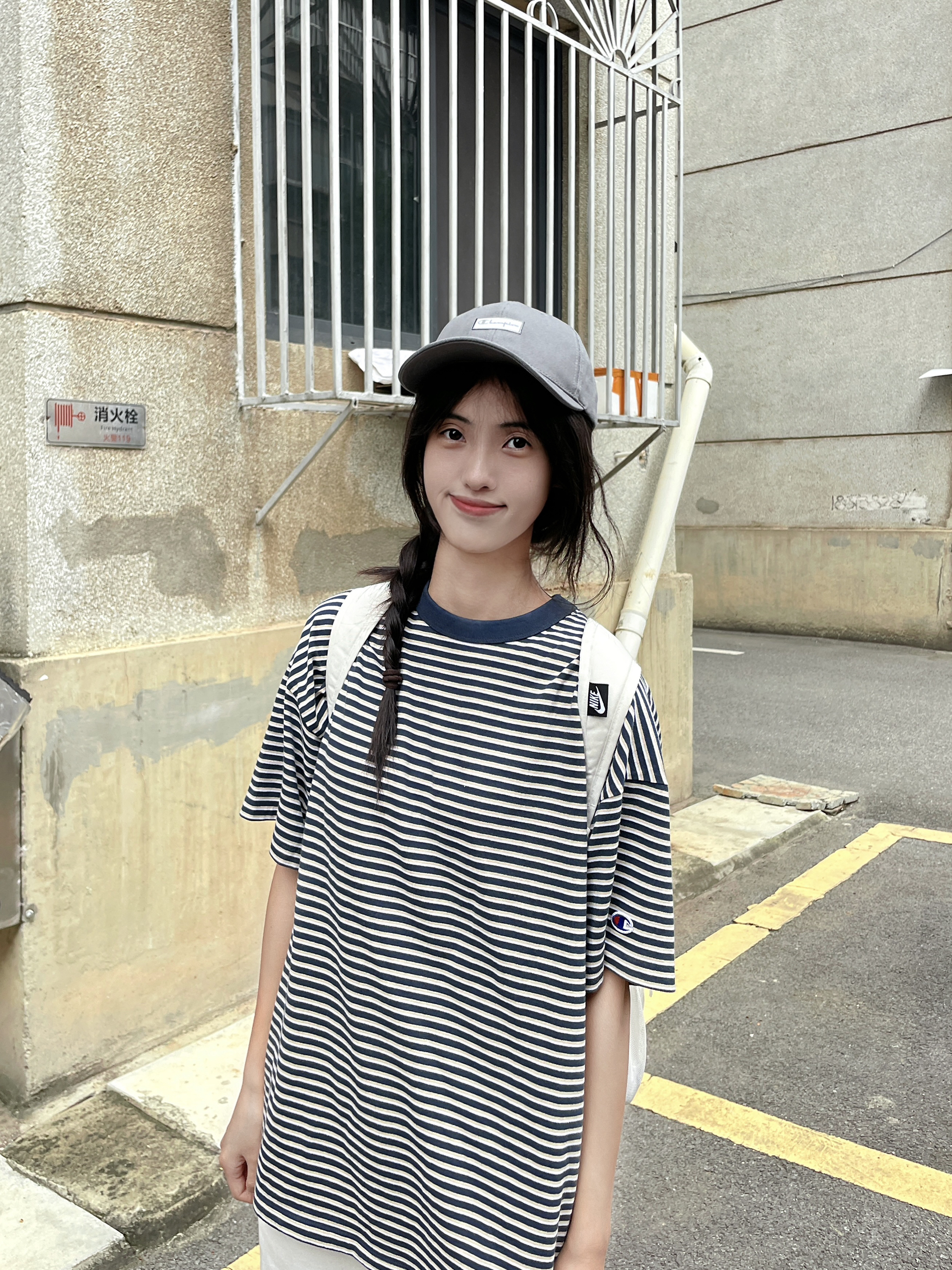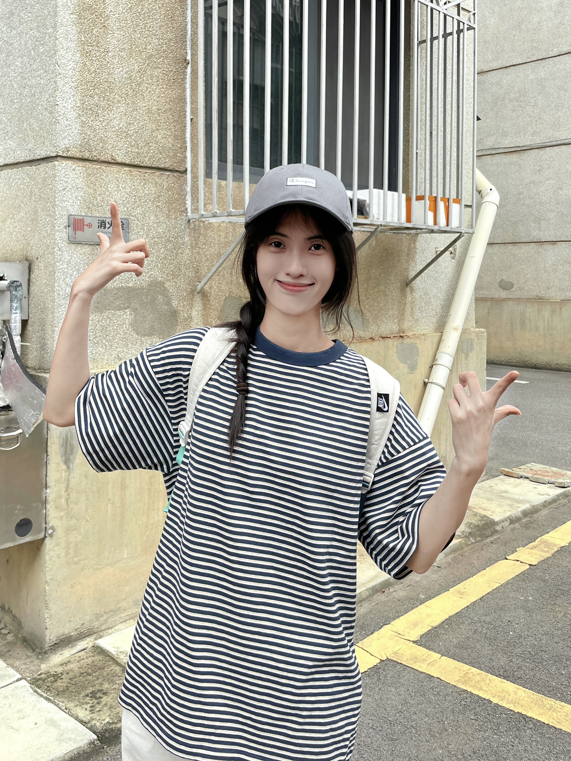冠军这个条纹短袖可显瘦啦 ~ 上身有点复古的感觉 少年感十足呀 搭配灰色棒球帽 显脸小的同时还防晒 同色系搭配太酷啦