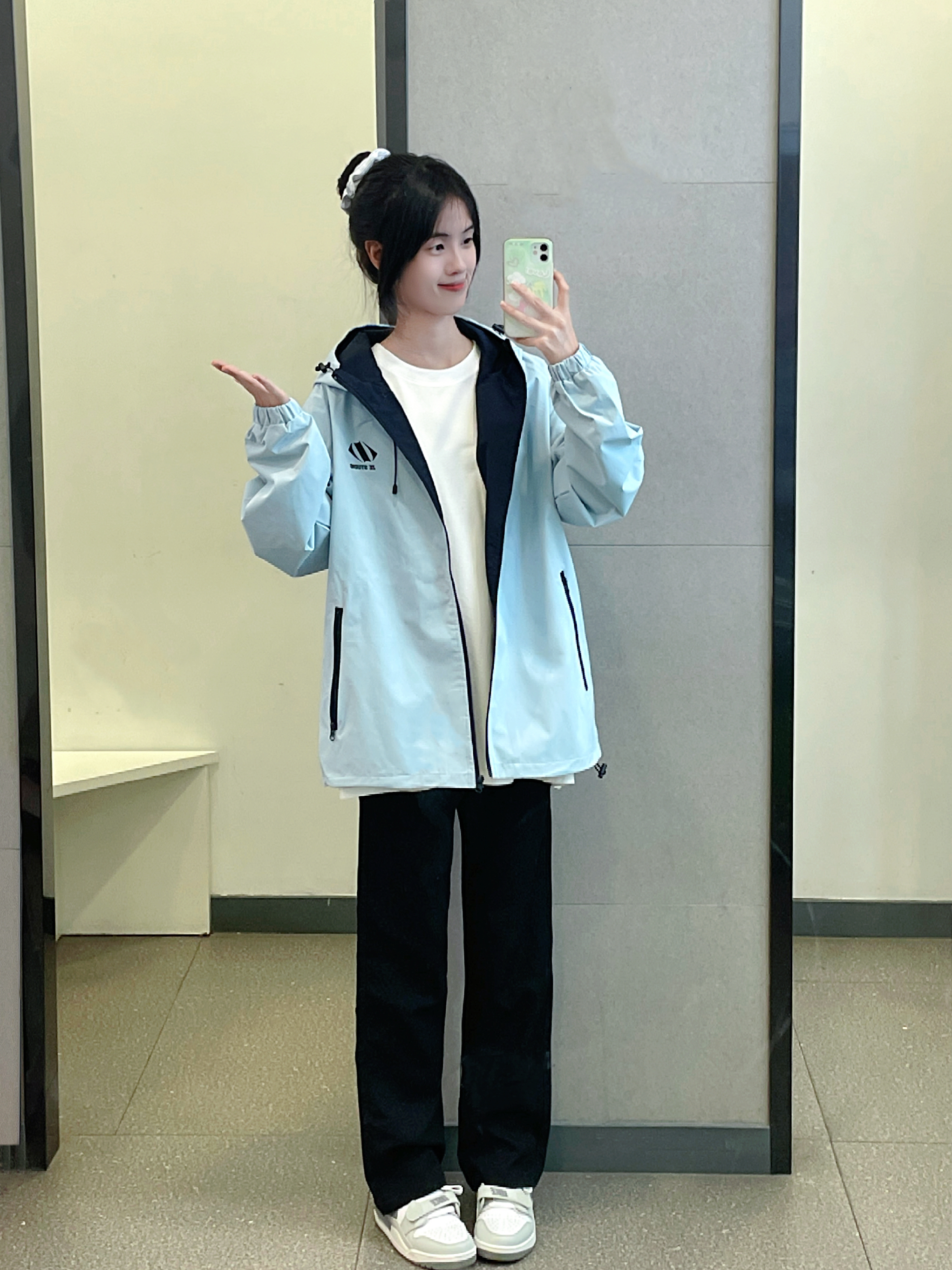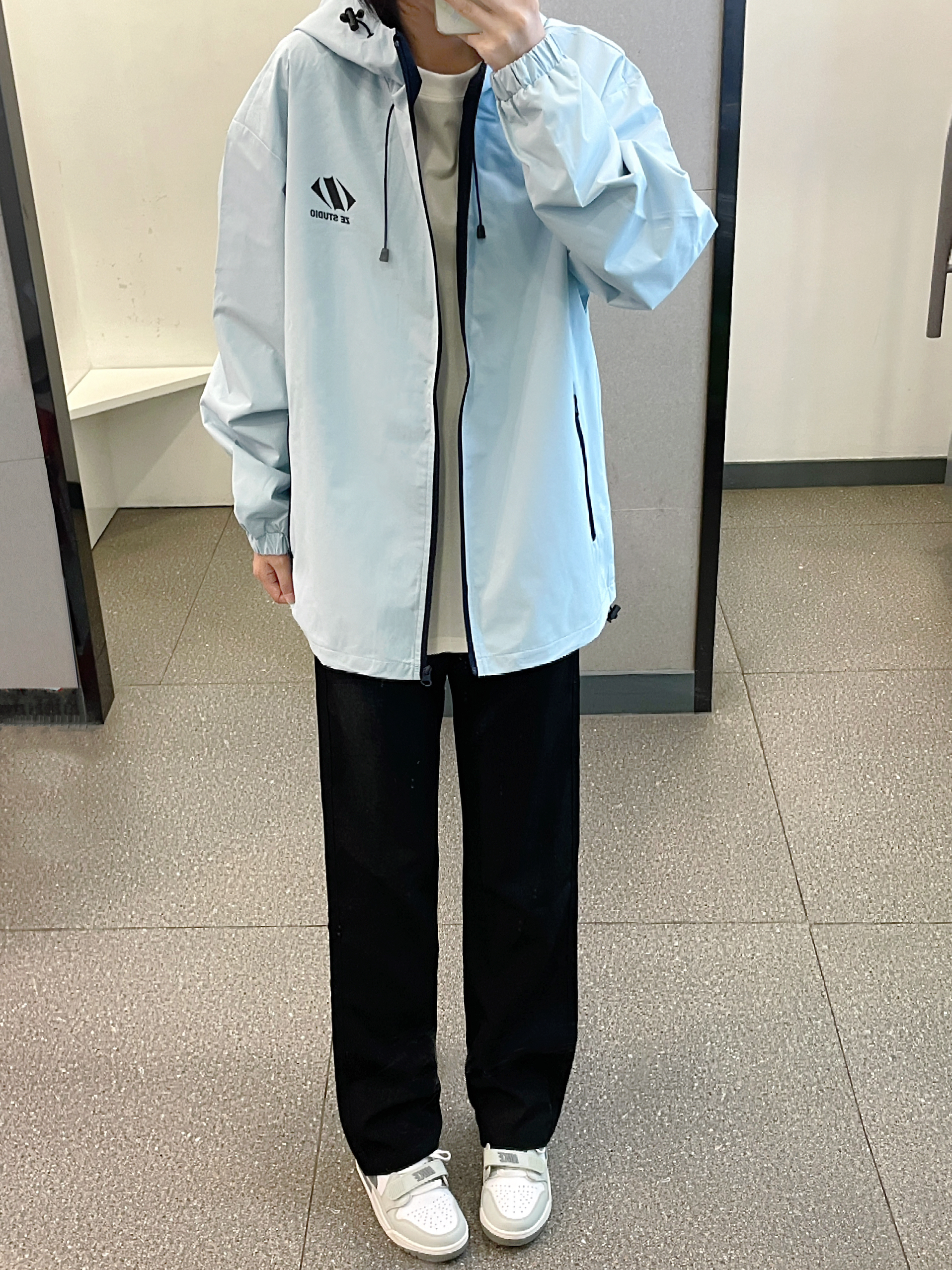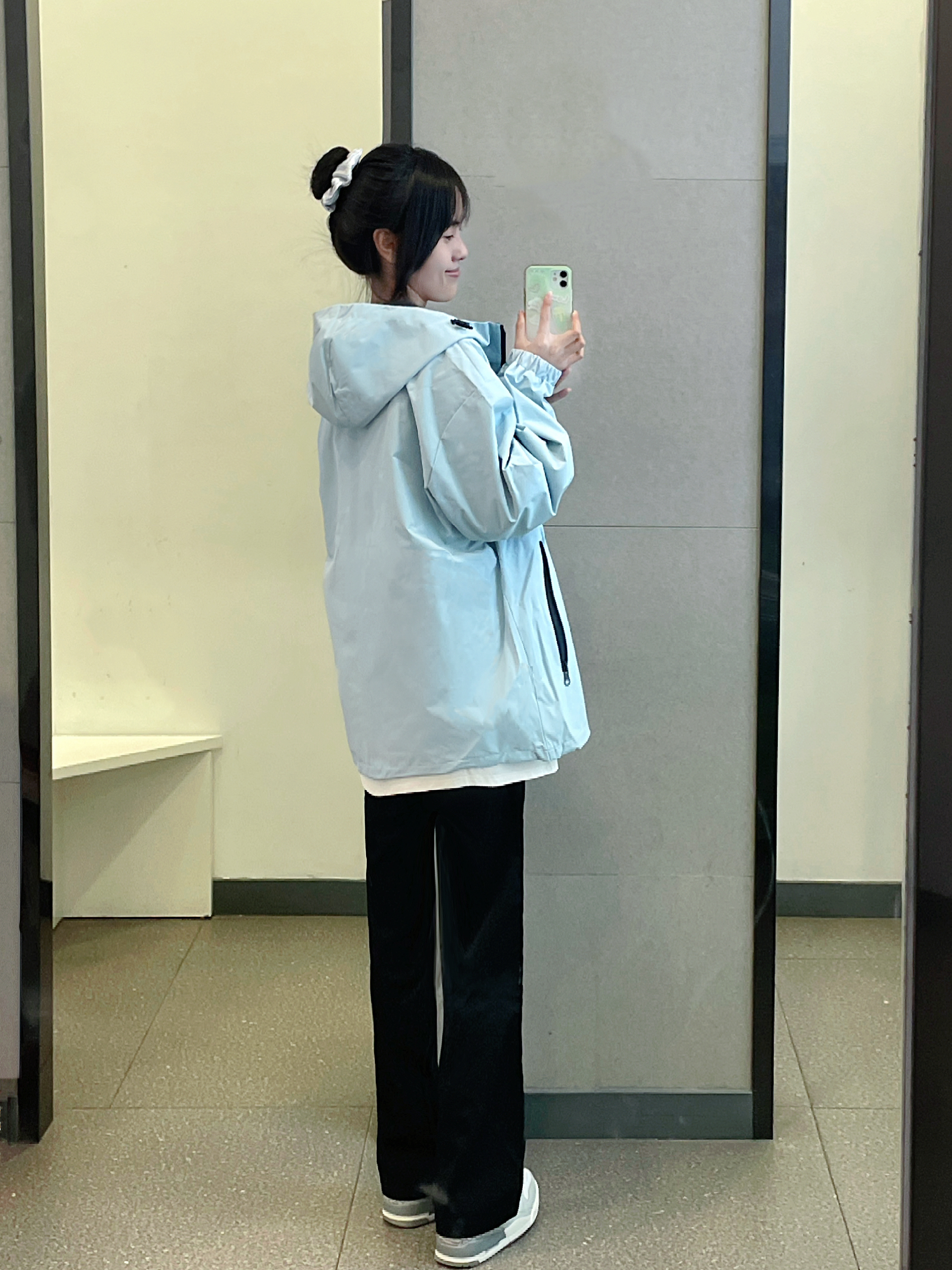 👔 :Z3E6 蓝色冲锋衣 黑色直筒裤真的太好穿了 穿上不显腿型 面料很舒服 裤子厚度刚合适 抽绳设计裤腰也可以自己调节 我168/45 穿的S就可以啦