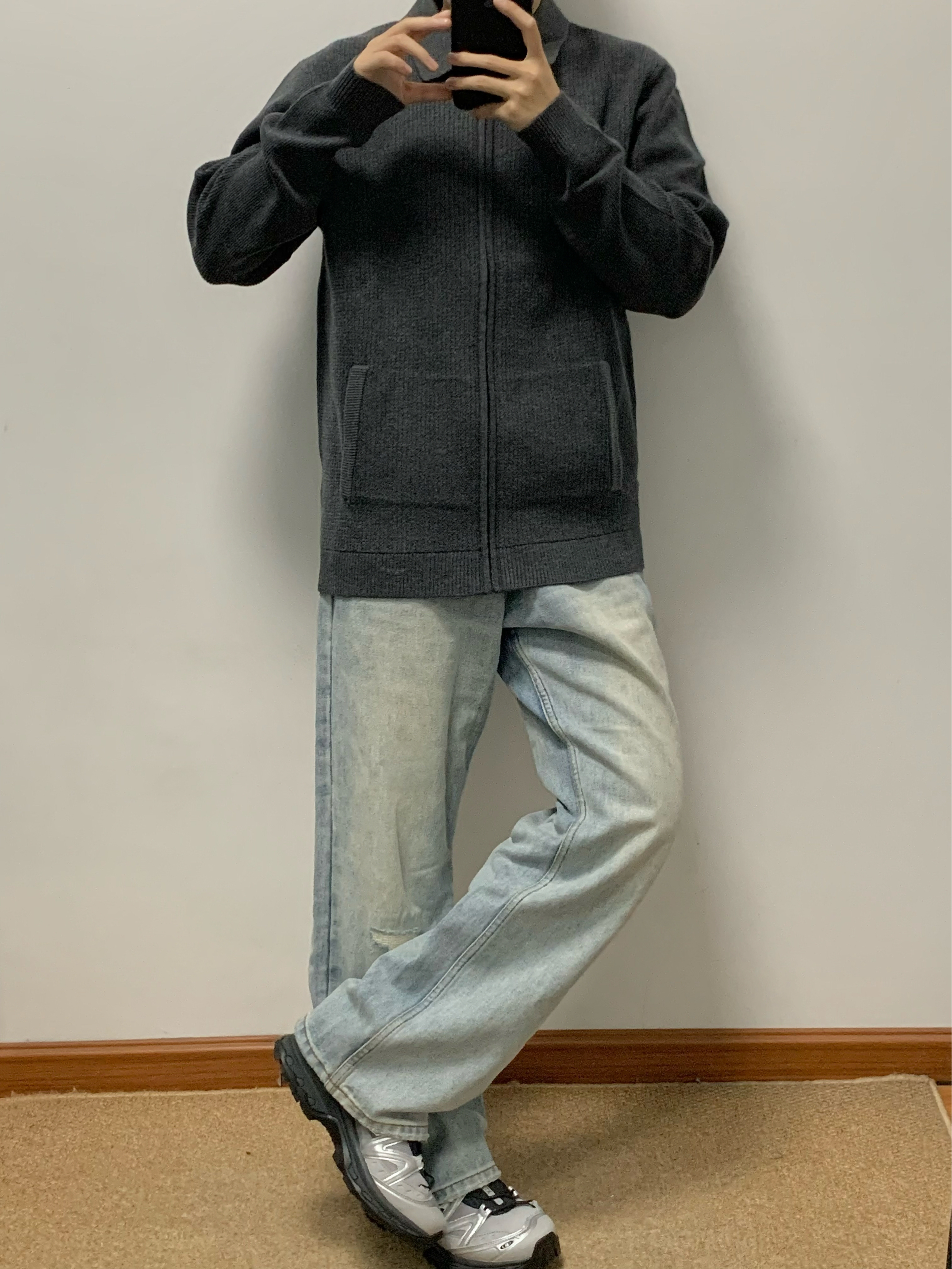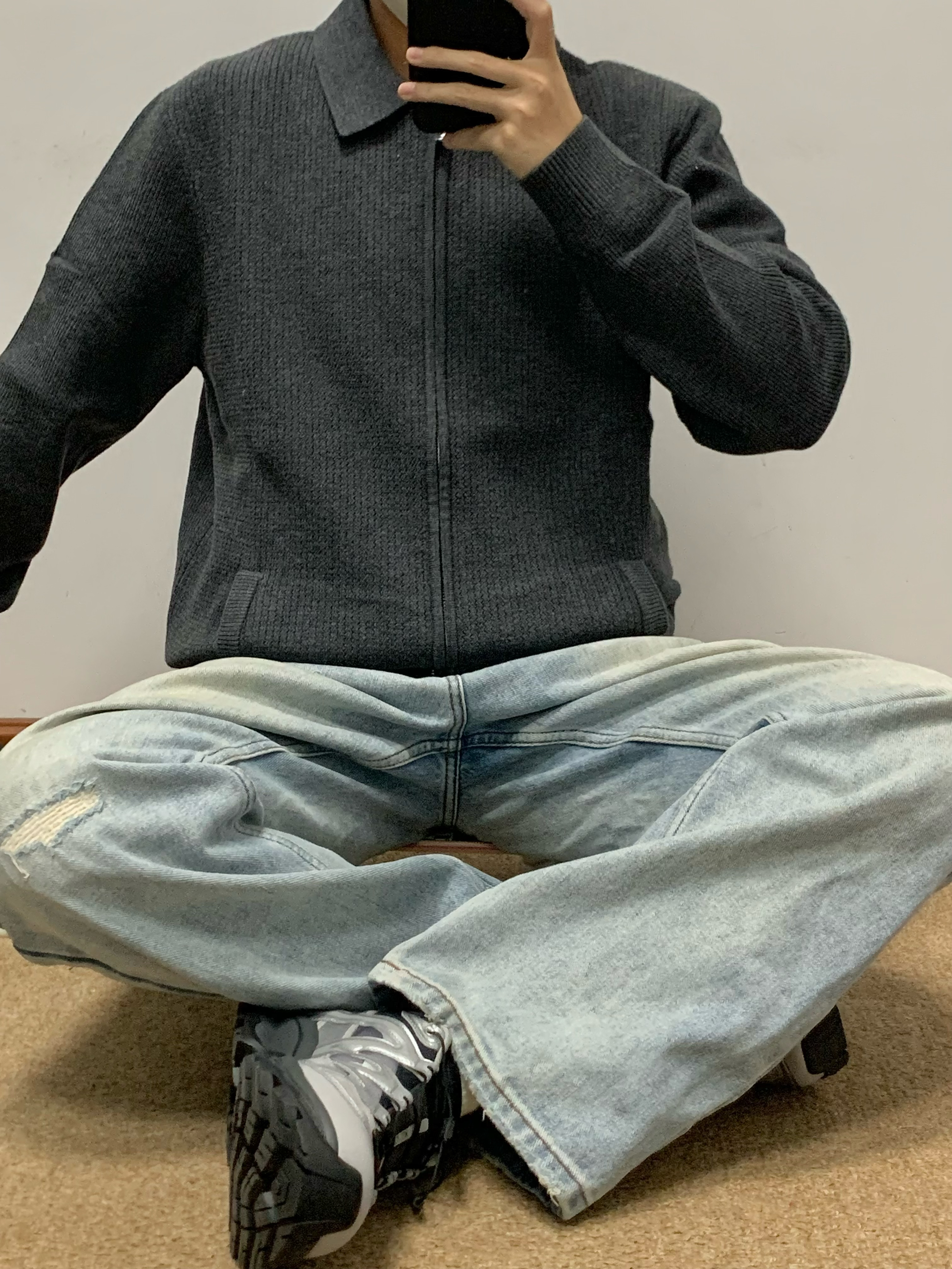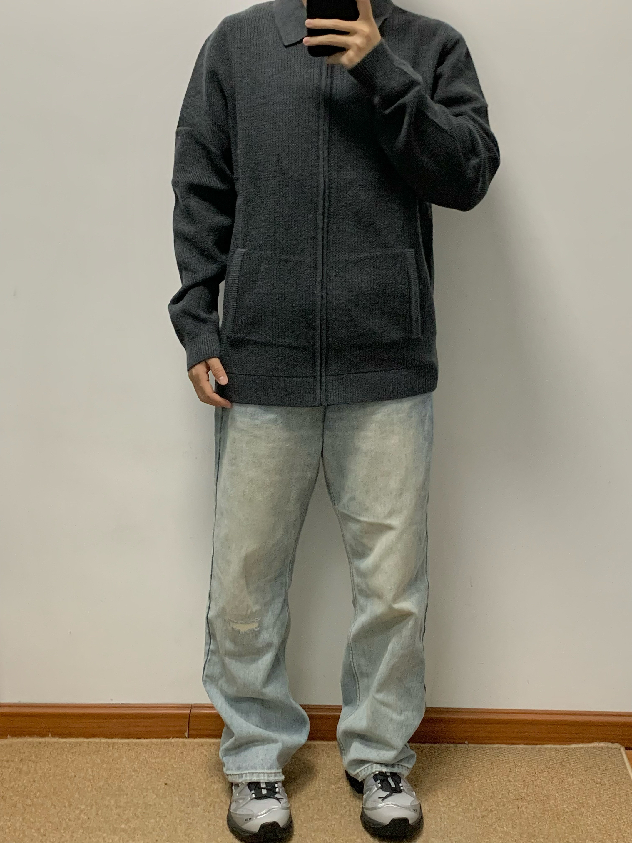 灰色卫衣针织衫搭配蓝色牛仔裤 松弛感十足 拉链开衫的设计 内搭和外穿都可 莫代尔➕羊毛材质 摸起来很舒服 无论是日常通勤还是正式场合都能穿 入秋就穿这一身 包帅的! 👔:红豆