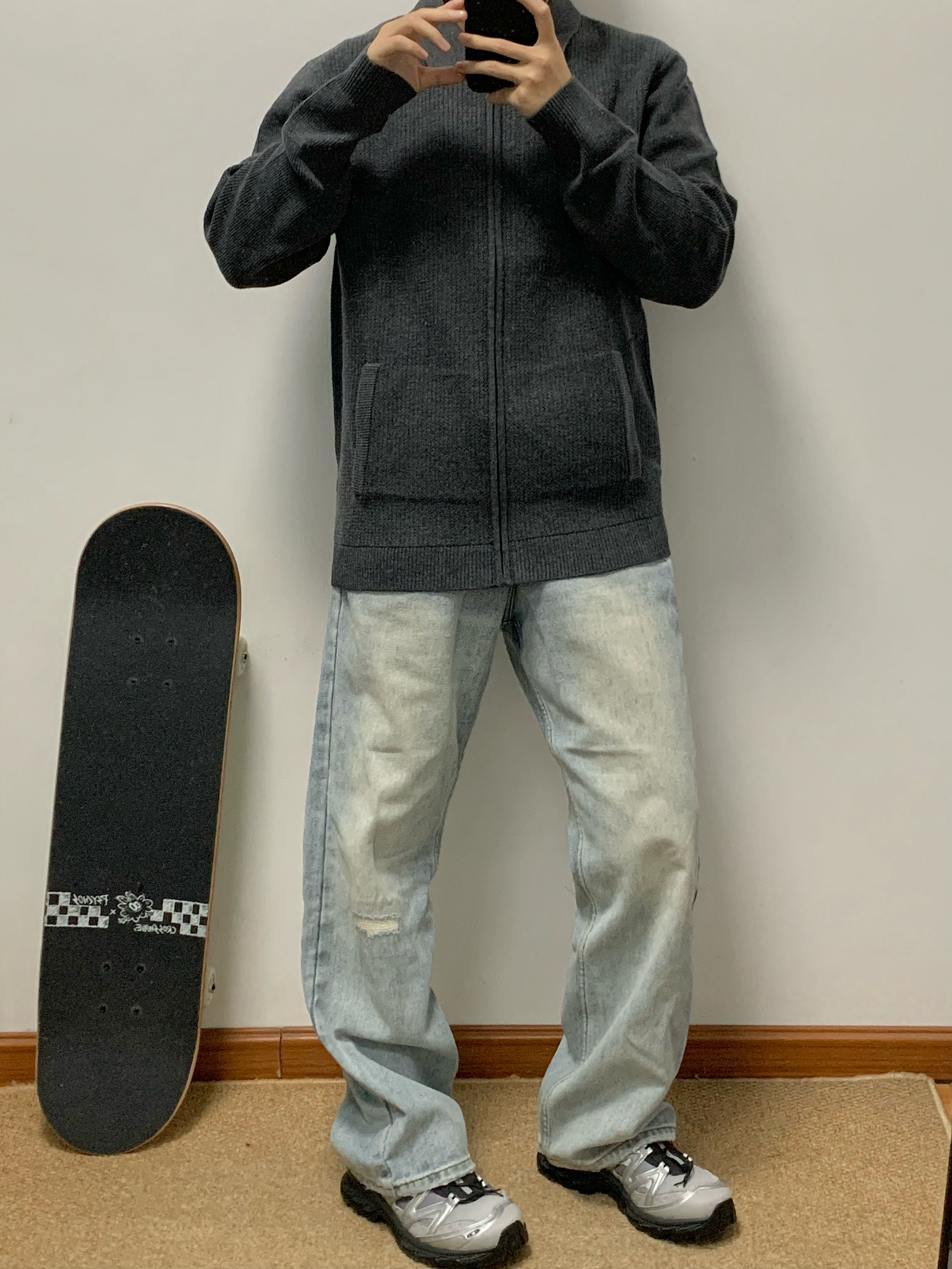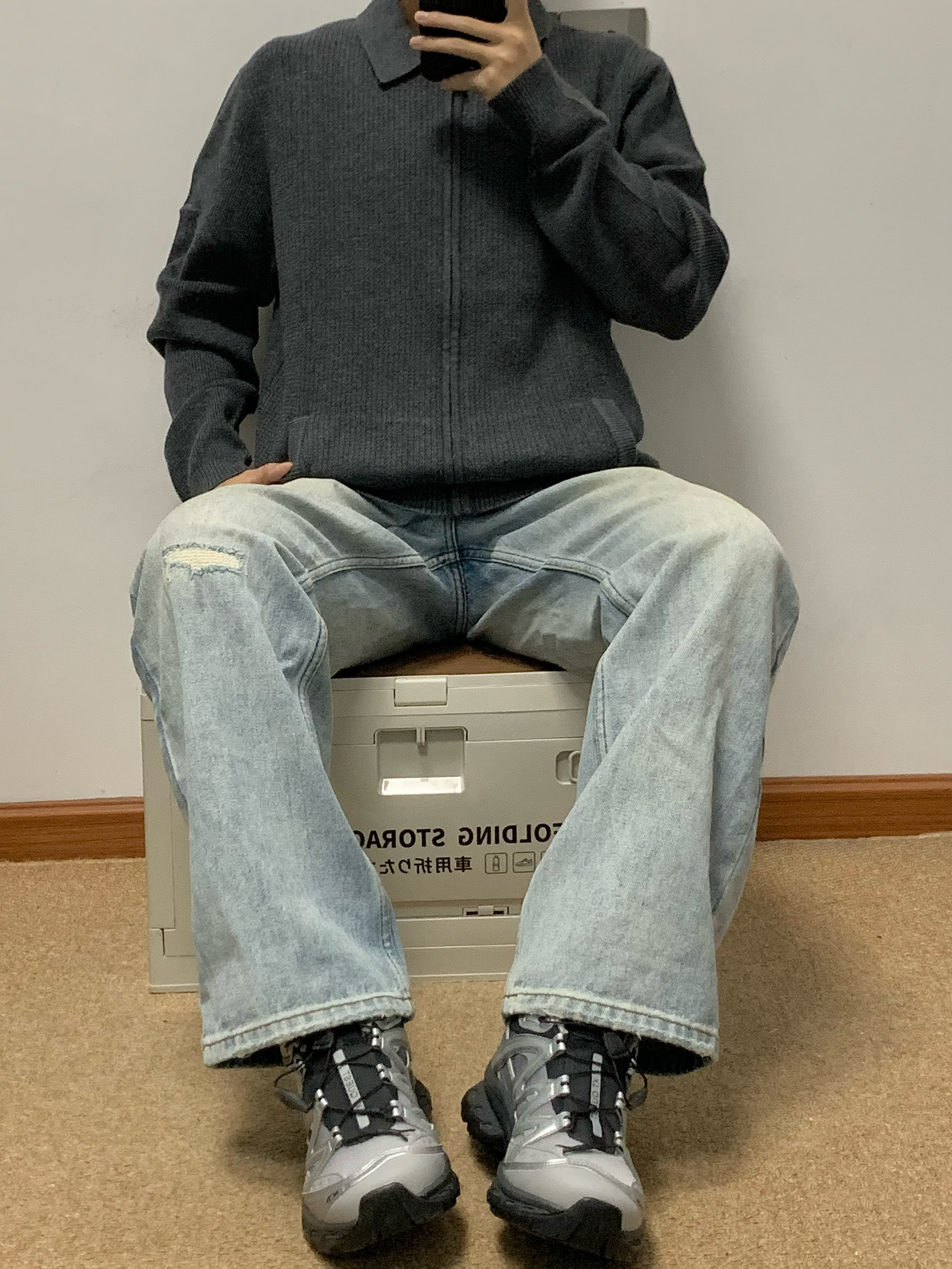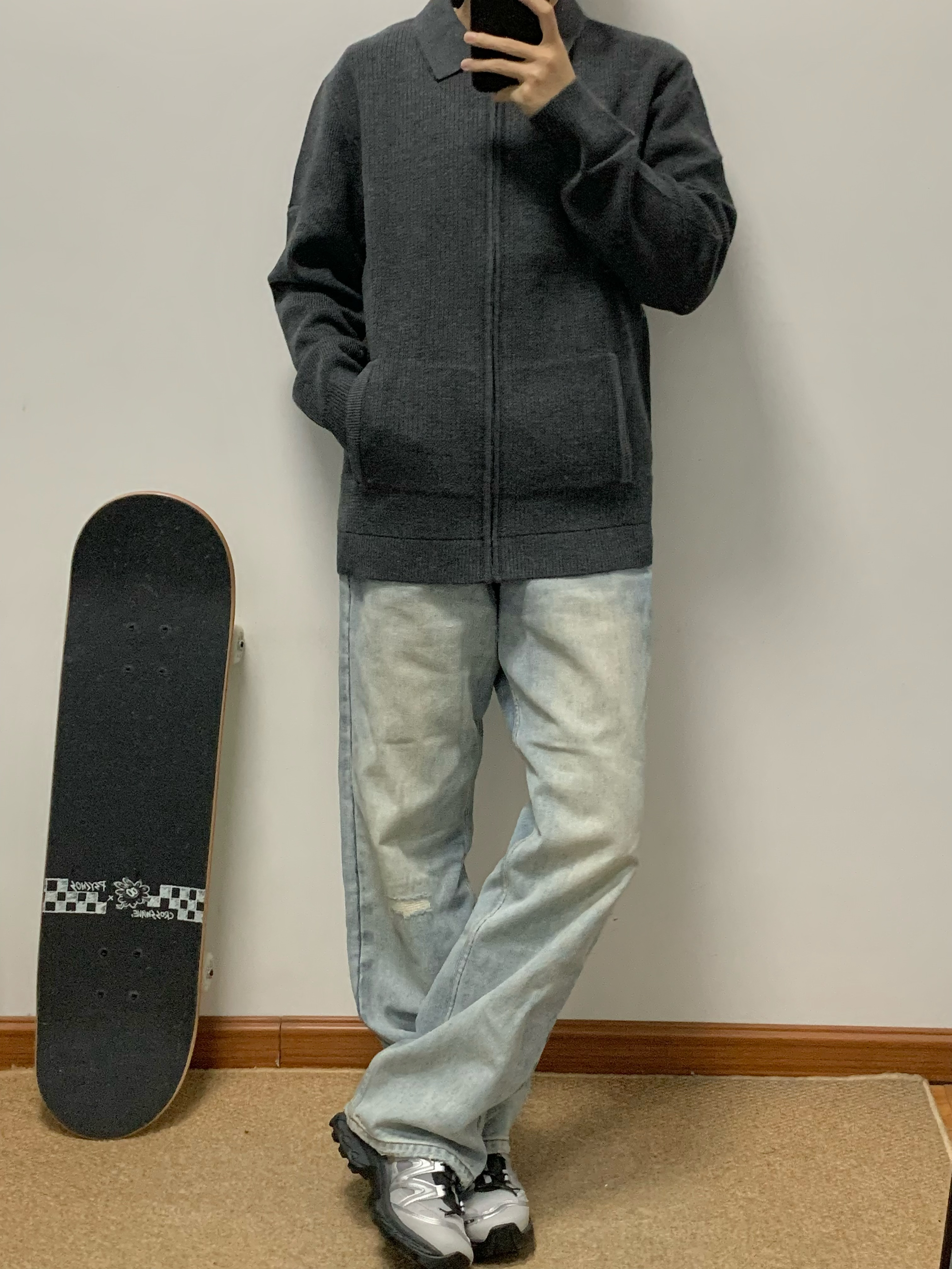 灰色卫衣针织衫搭配蓝色牛仔裤 松弛感十足 拉链开衫的设计 内搭和外穿都可 莫代尔➕羊毛材质 摸起来很舒服 无论是日常通勤还是正式场合都能穿 入秋就穿这一身 包帅的! 👔:红豆