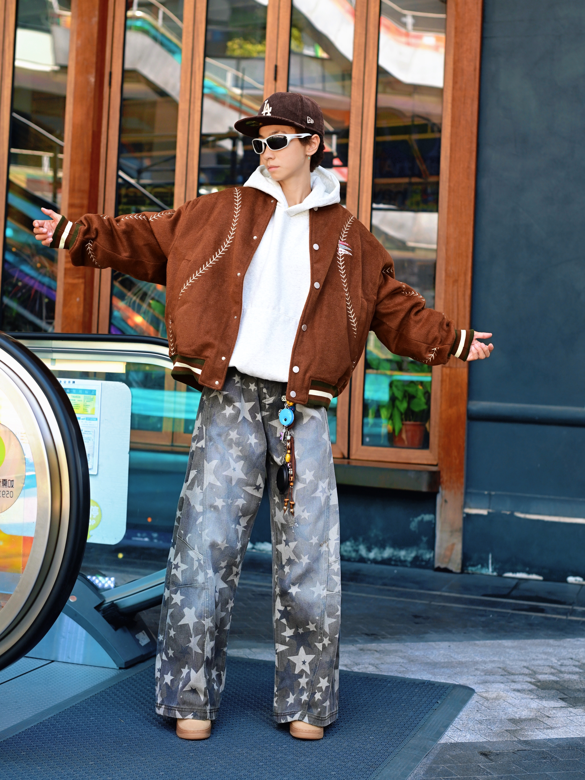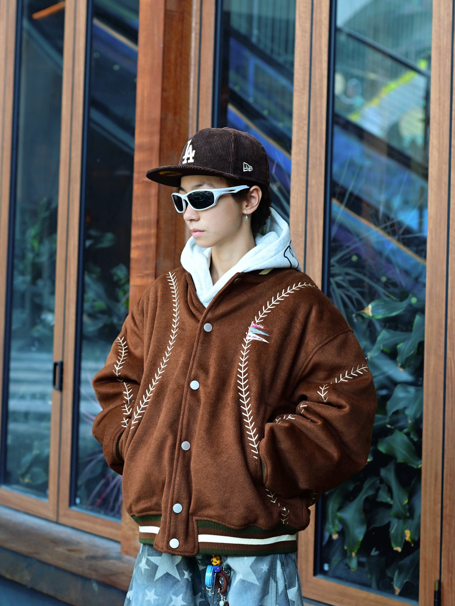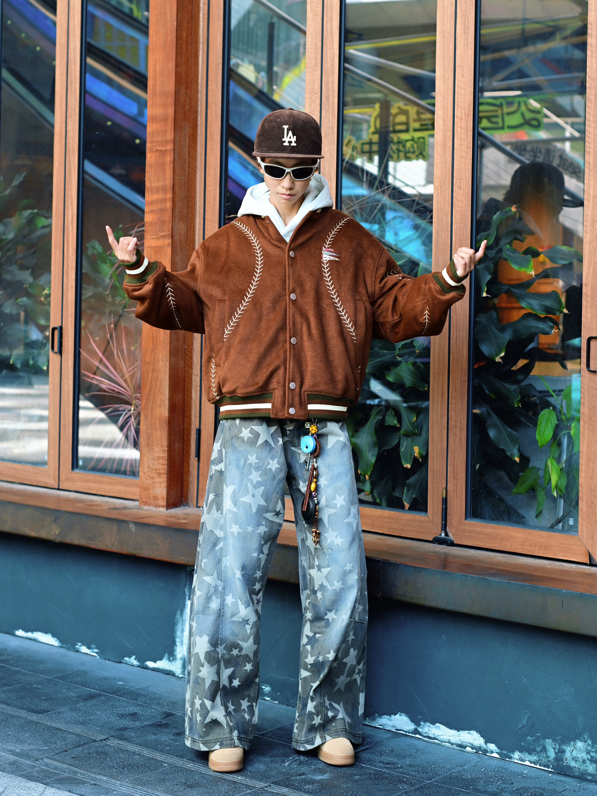 欢迎进入哇哇哇的穿搭分享频道 172CM|55KG 👔:m👖:m|👟:39码 今日份上身BJHG棒球服夹克 宽松廓形+羊毛呢材质 春秋季节穿刚好 棕色主体搭配白色明线刺绣 复古味一下就出来了。 灰色卫衣做内搭,增加层次感。 下身配星星阔腿牛仔裤和卡其色运动鞋 再用LA棒球帽和墨镜点缀 整体街头感立刻拉满。
