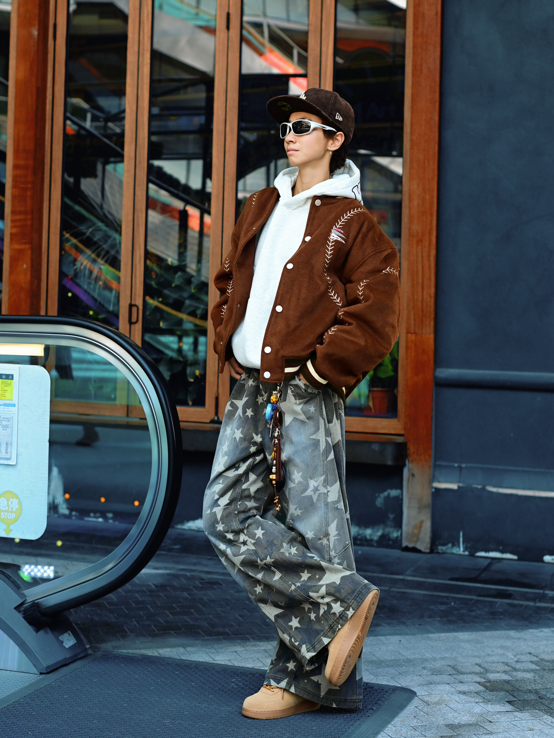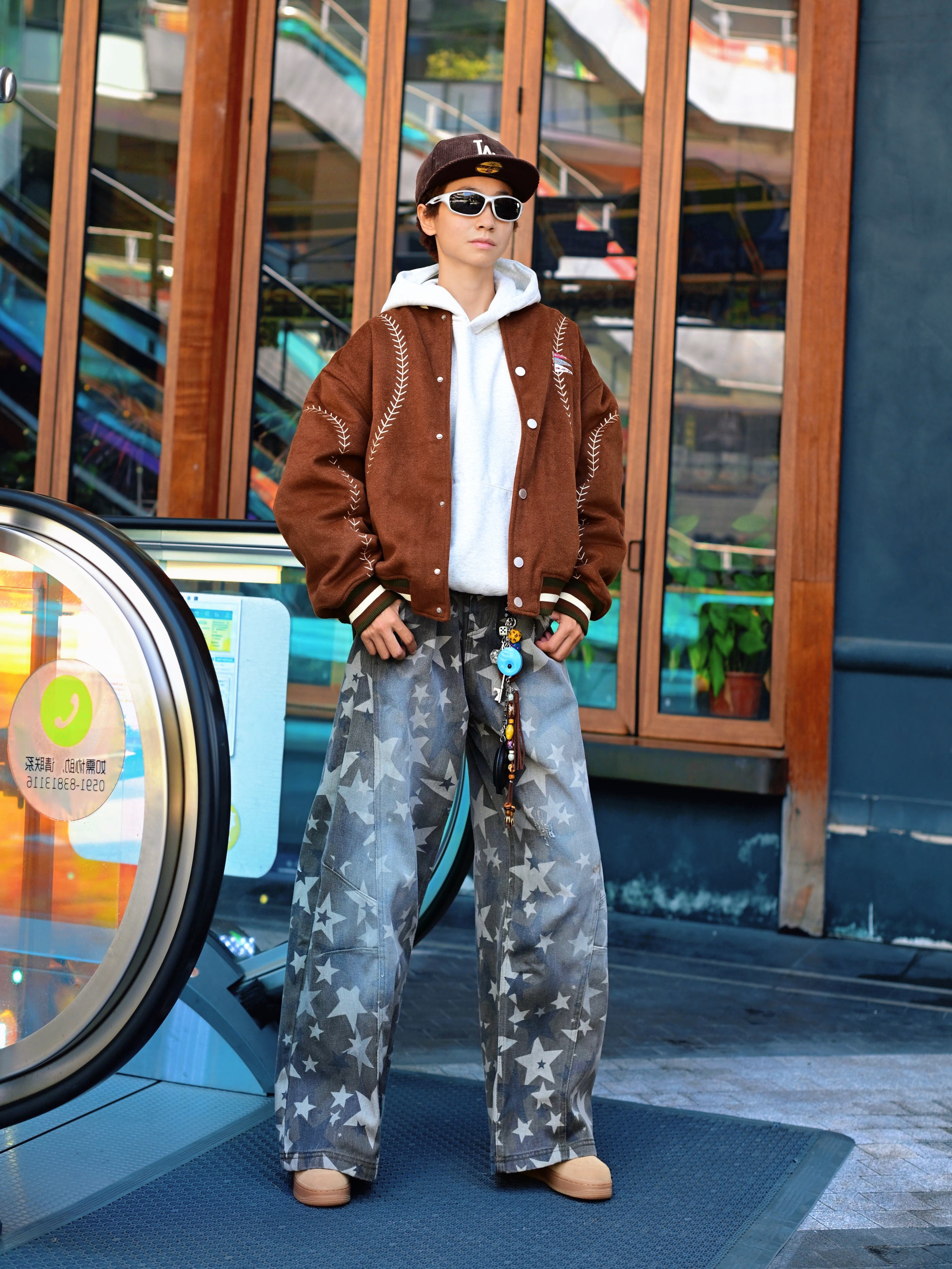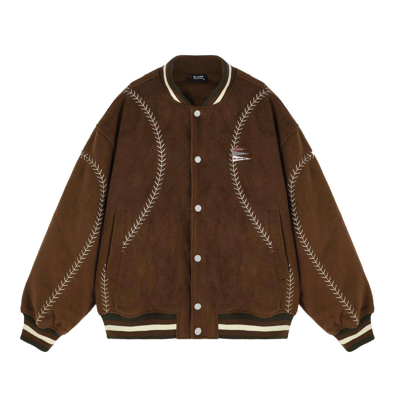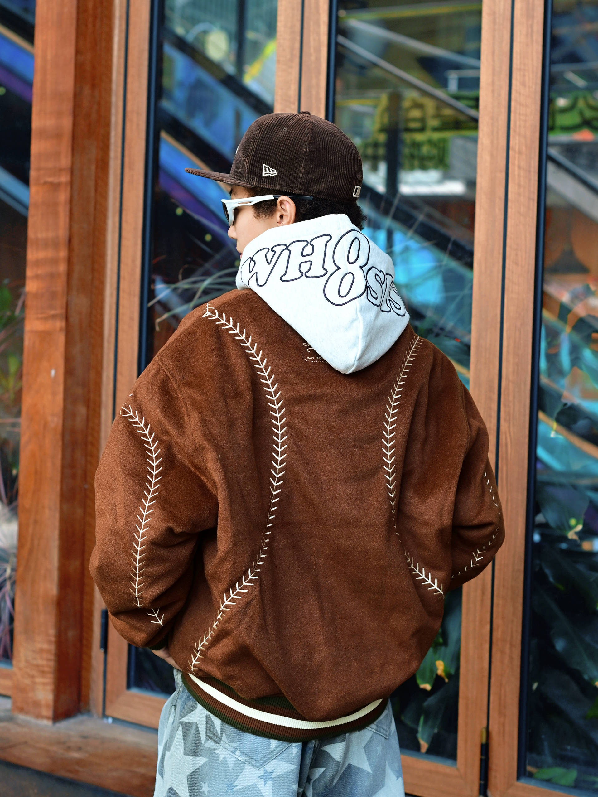欢迎进入哇哇哇的穿搭分享频道 172CM|55KG 👔:m👖:m|👟:39码 今日份上身BJHG棒球服夹克 宽松廓形+羊毛呢材质 春秋季节穿刚好 棕色主体搭配白色明线刺绣 复古味一下就出来了。 灰色卫衣做内搭,增加层次感。 下身配星星阔腿牛仔裤和卡其色运动鞋 再用LA棒球帽和墨镜点缀 整体街头感立刻拉满。
