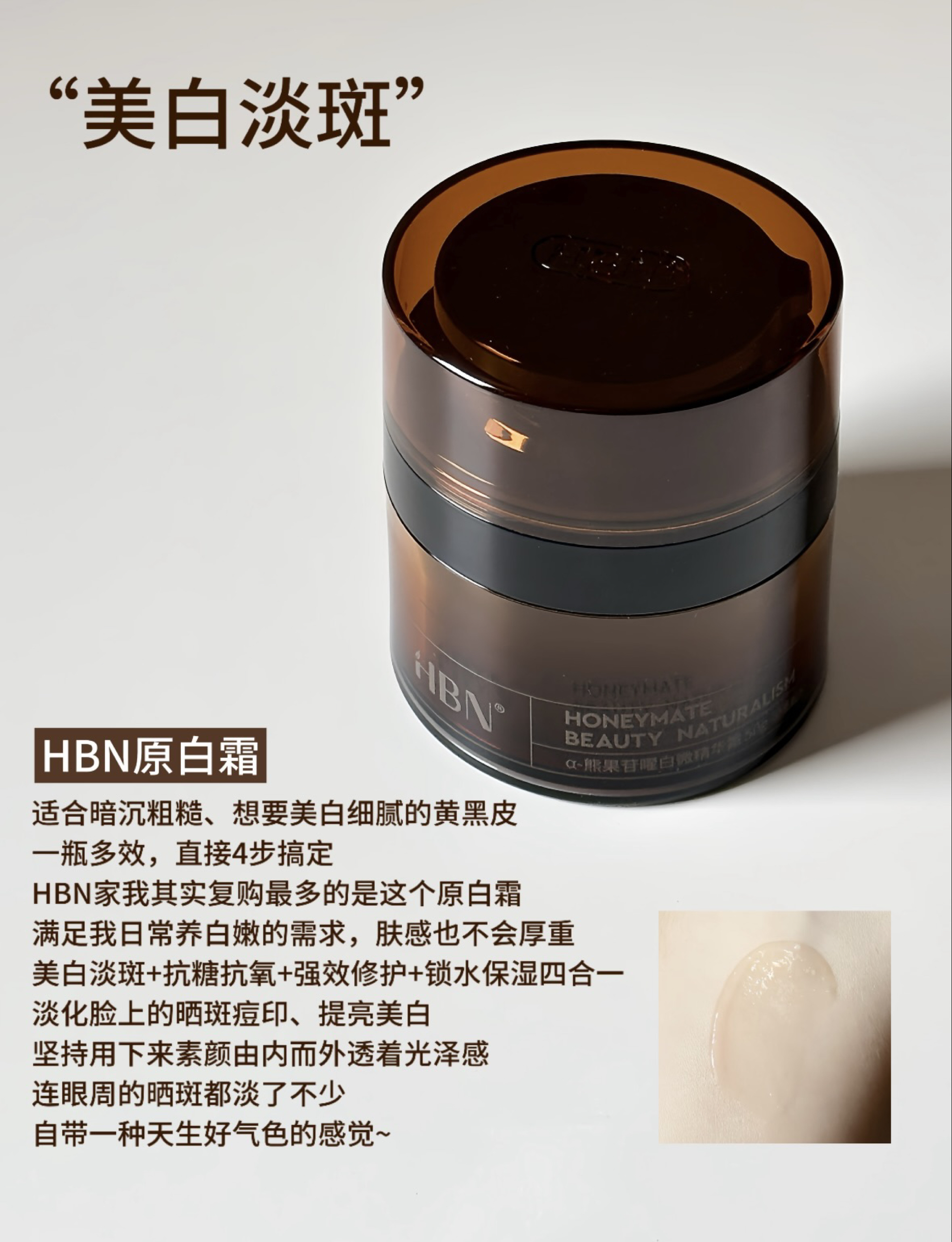 国货里能把面霜这个品类做好的屈指可数大牌护肤品最难的卖的最贵的其实也是面霜所以HBN家用面霜这个杀出一条血路各个功效都做到榜单top!真的有几把刷子 一句话省流速通版: 1、HBN 原白霜—美白淡斑 适合暗沉粗糙、想要美白细腻的黄黑皮如果不知道选哪款的,可以从这瓶入手无论你是熬夜黄、旅游晒、还是上班丑的它都能够综合改善,让皮肤白嫩亮起来 2、HBN 双A醇晚霜—抗老紧致适合松垮细纹多、想要淡纹紧致...