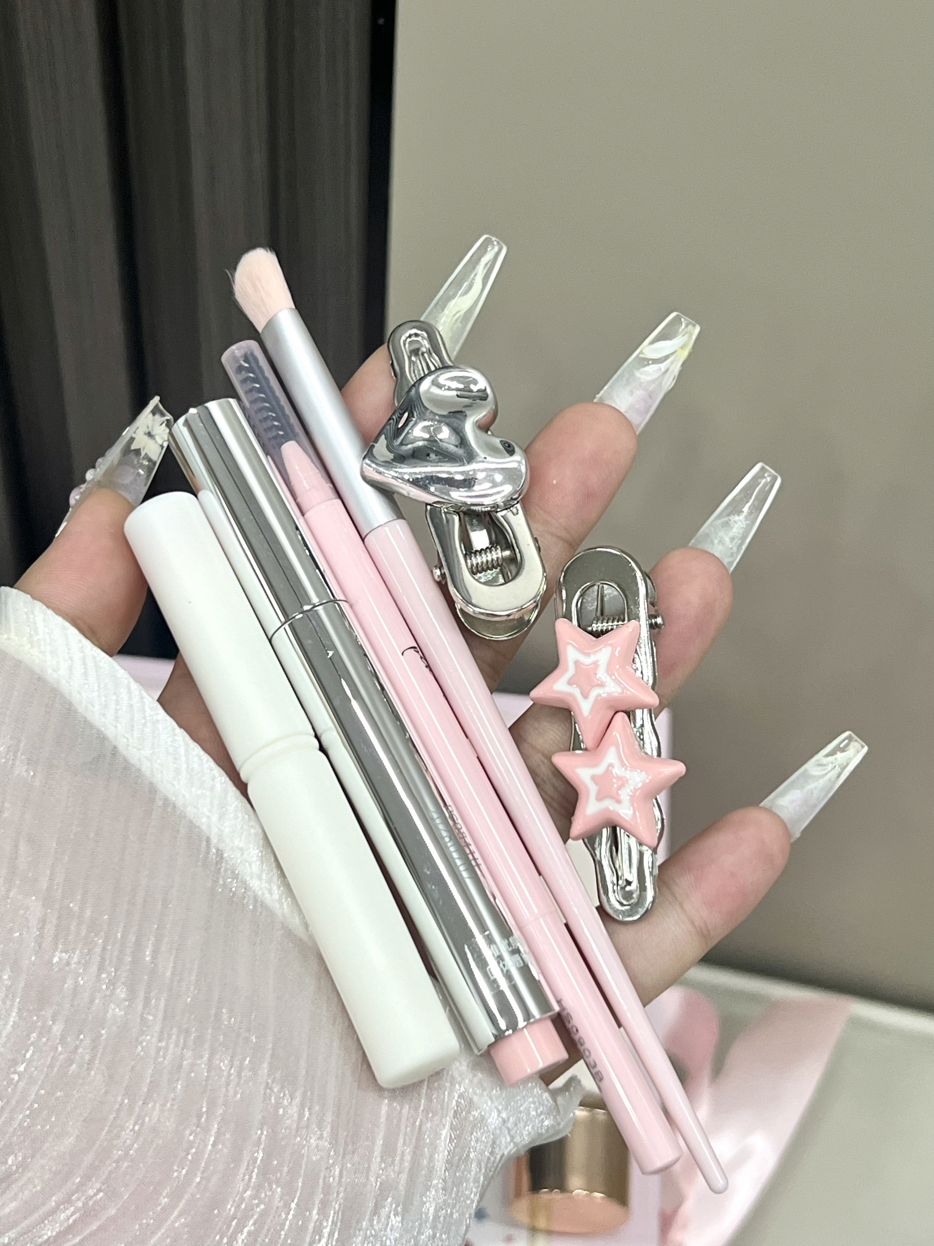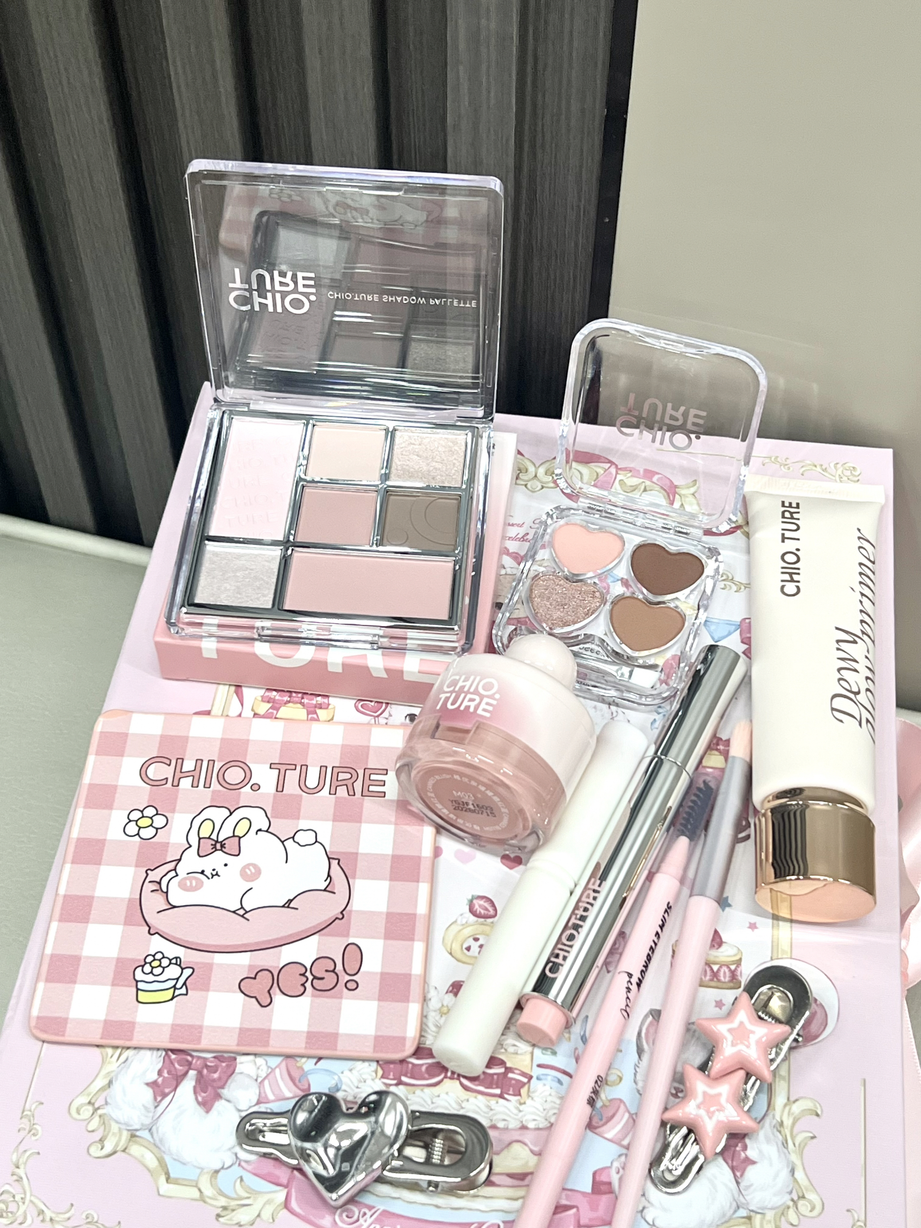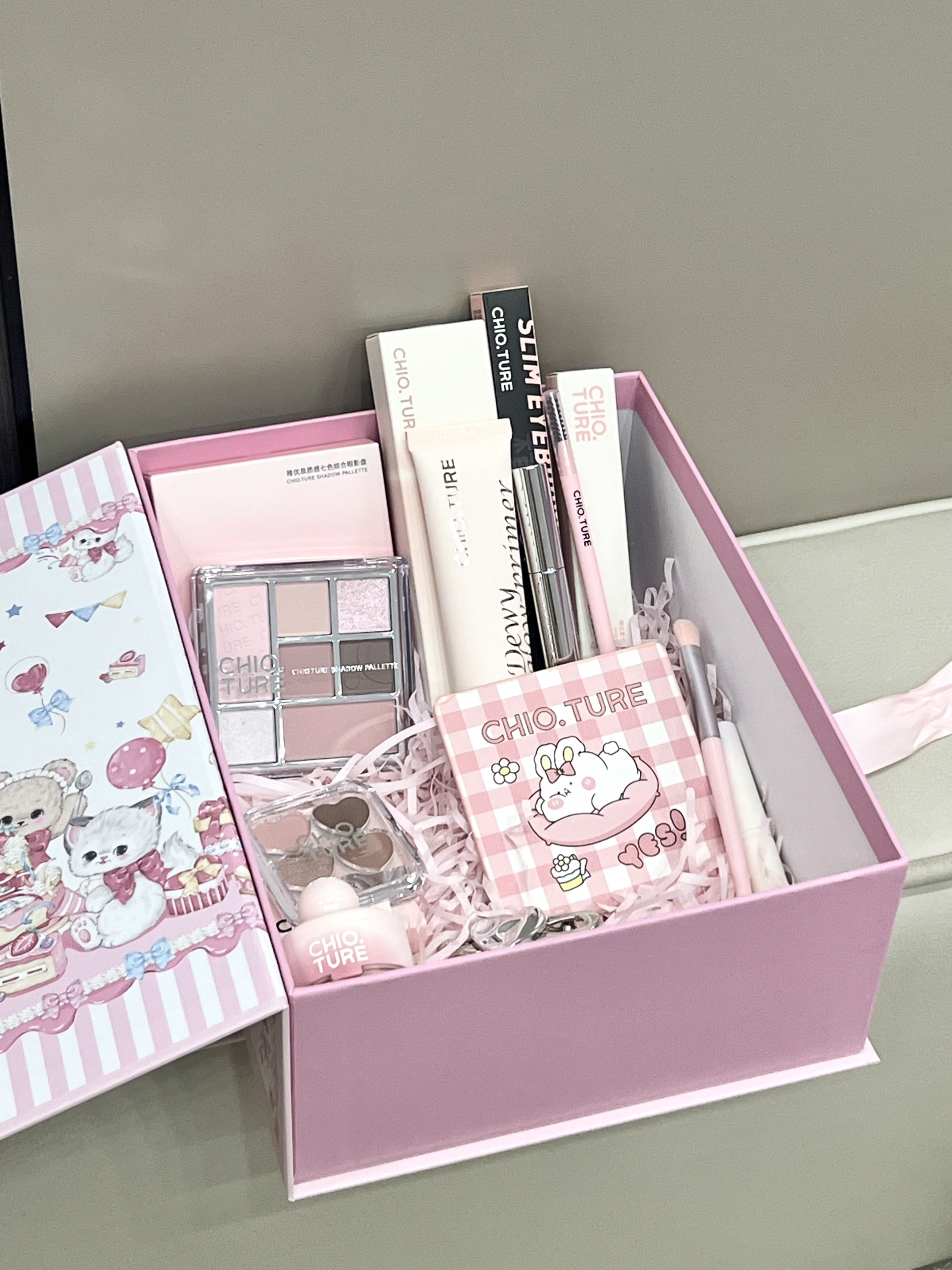 我说真的 真有女孩子能拒绝这种粉粉嫩嫩的彩妆礼盒嘛 介个是稚优泉家的浪漫满屋礼盒 盒子上都是可爱的小熊 里面有眼影盘 卧蚕盘 腮红 隔离霜 唇釉 眉笔 小发夹 眼影刷 唇刷 还有可爱的小镜子 每一款的颜色都hin日常百搭 新手宝宝想要化彩妆 这一套就够用啦 礼盒礼袋的包装 自己用或者送人都hin不错呀