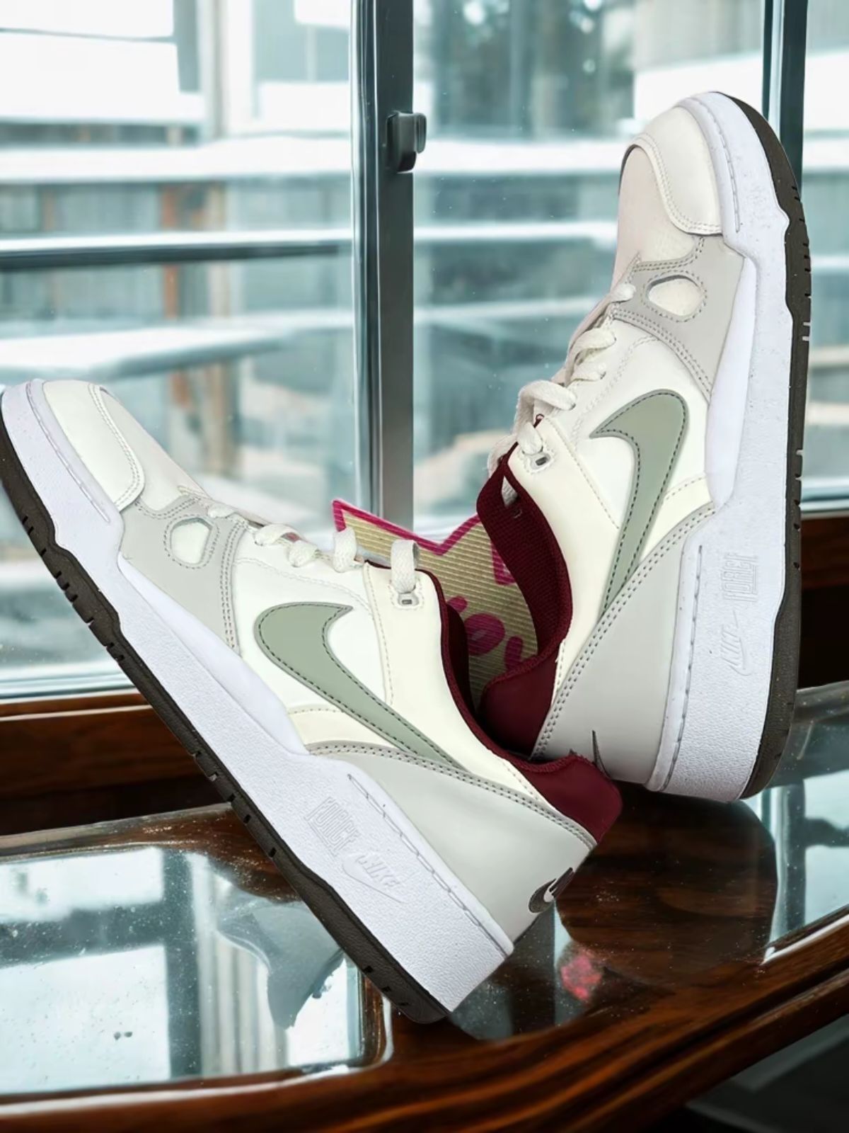 这双Nike Full Force LOW "蛇年限定"板鞋真的很特别。米色的鞋身特别耐看,比纯白更有味道,关键是特别耐脏。鞋面那个蛇鳞纹路的设计是点睛之笔,近看才能发现,摸起来很有质感,不会太夸张但又很有细节。 穿上脚第一感觉就是轻,走路特别轻松。鞋垫比普通板鞋厚实,踩下去有点弹性,走久了脚底板不会酸。鞋底纹路挺深的,我穿着走过各种路面,防滑效果很好,而且特别耐磨,穿了一段时间鞋底都没什么磨损