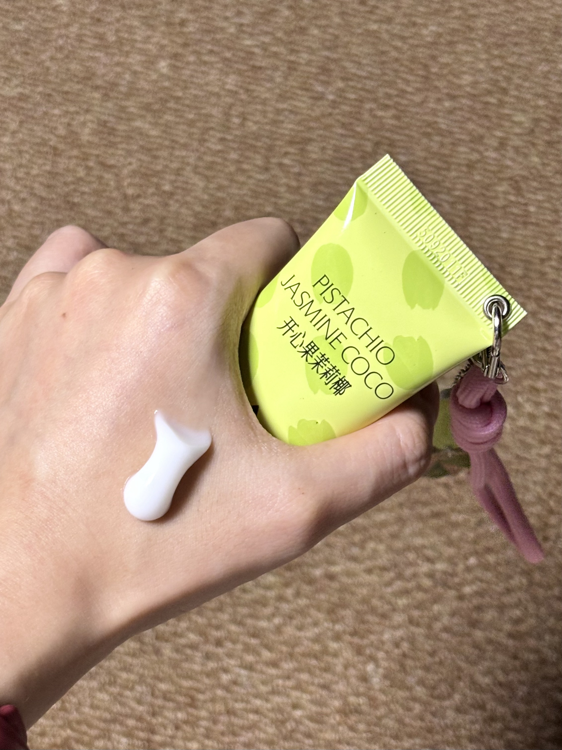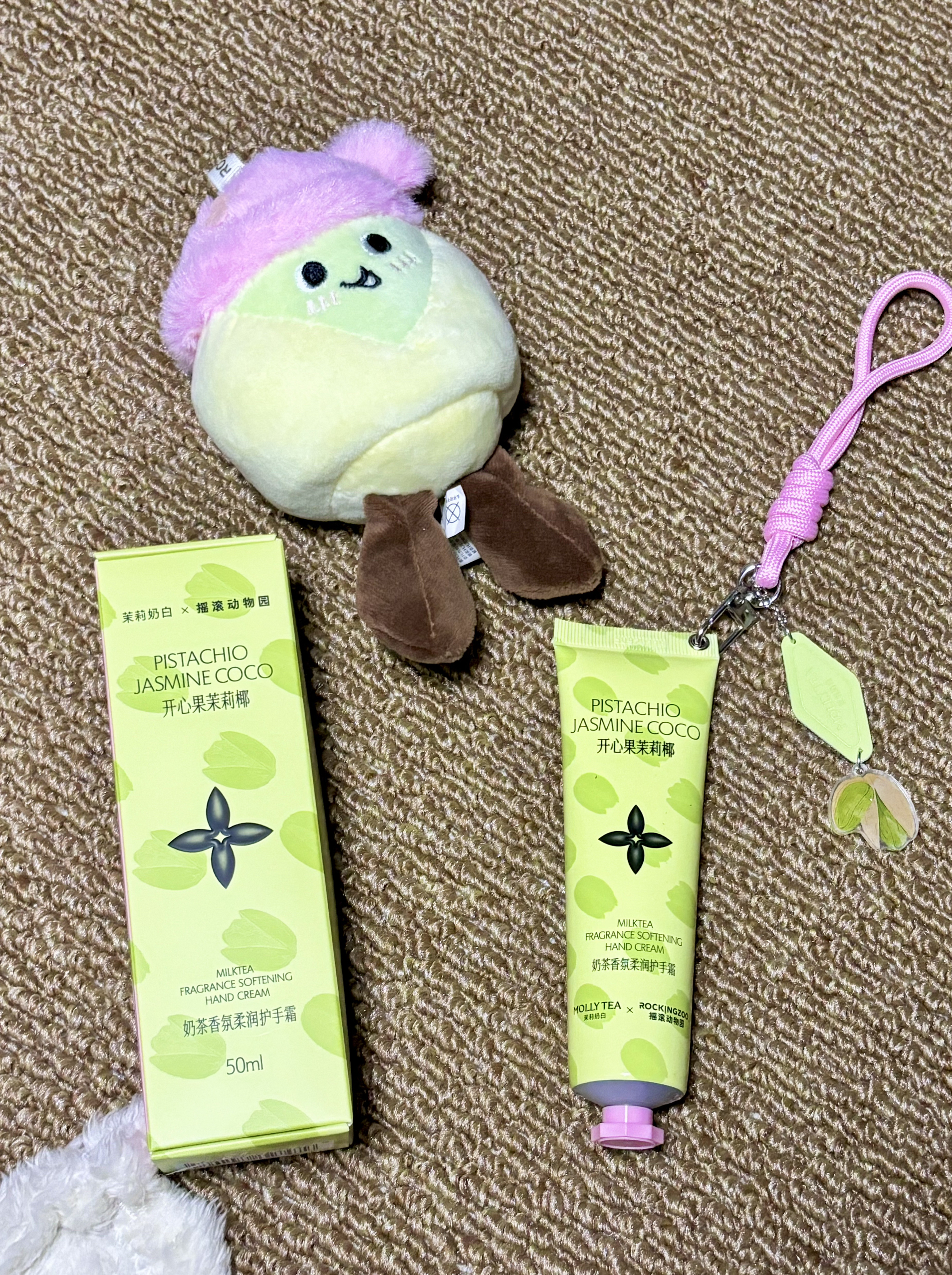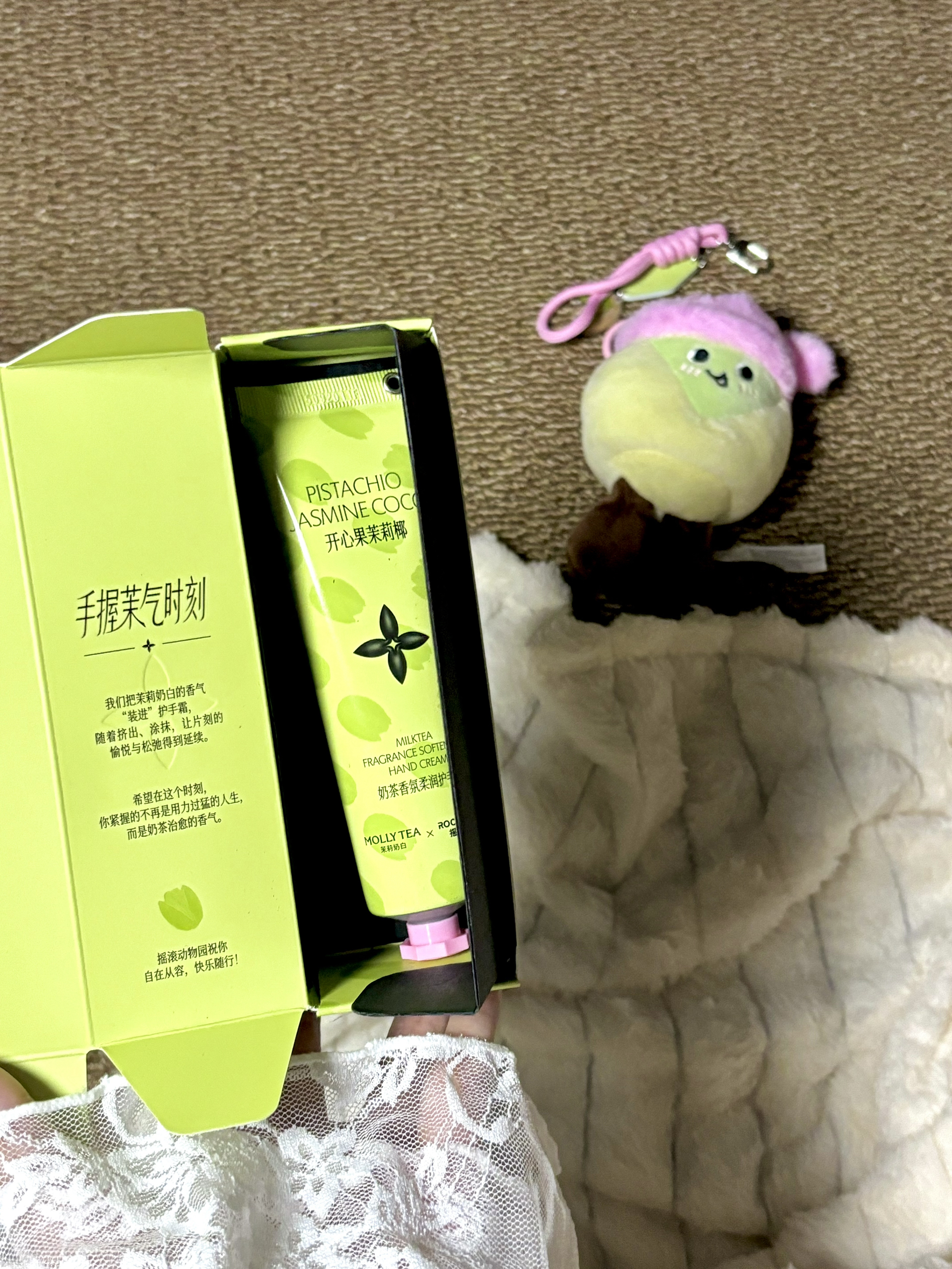 淡淡的香味留香时间很久 然后涂上也是很好吸收 而且护手霜上面还送了一个挂链,就很方便携带 赠送的这个周边玩偶也是自带香味的 奶香奶香然后挂在包上的话也是特别好看