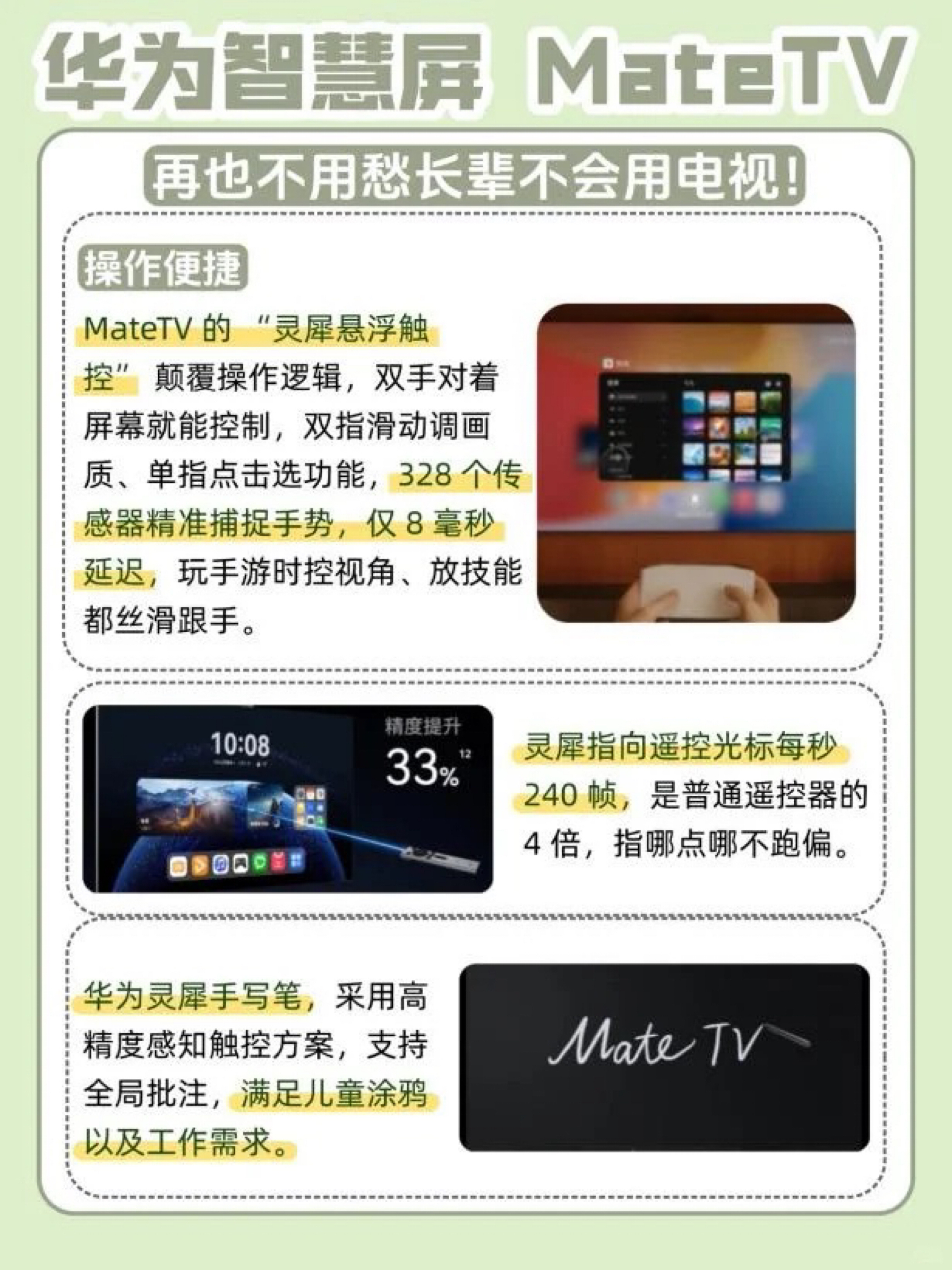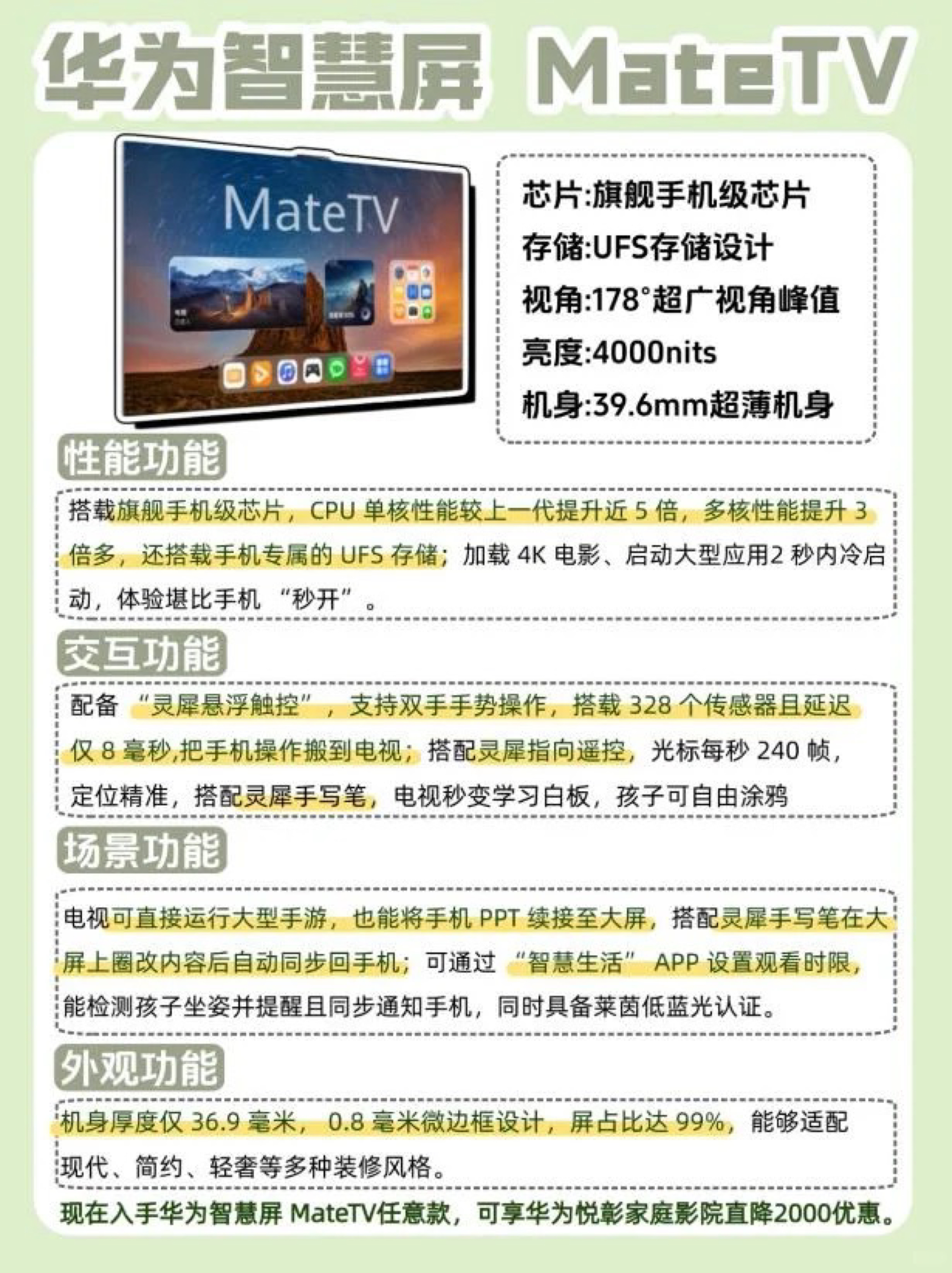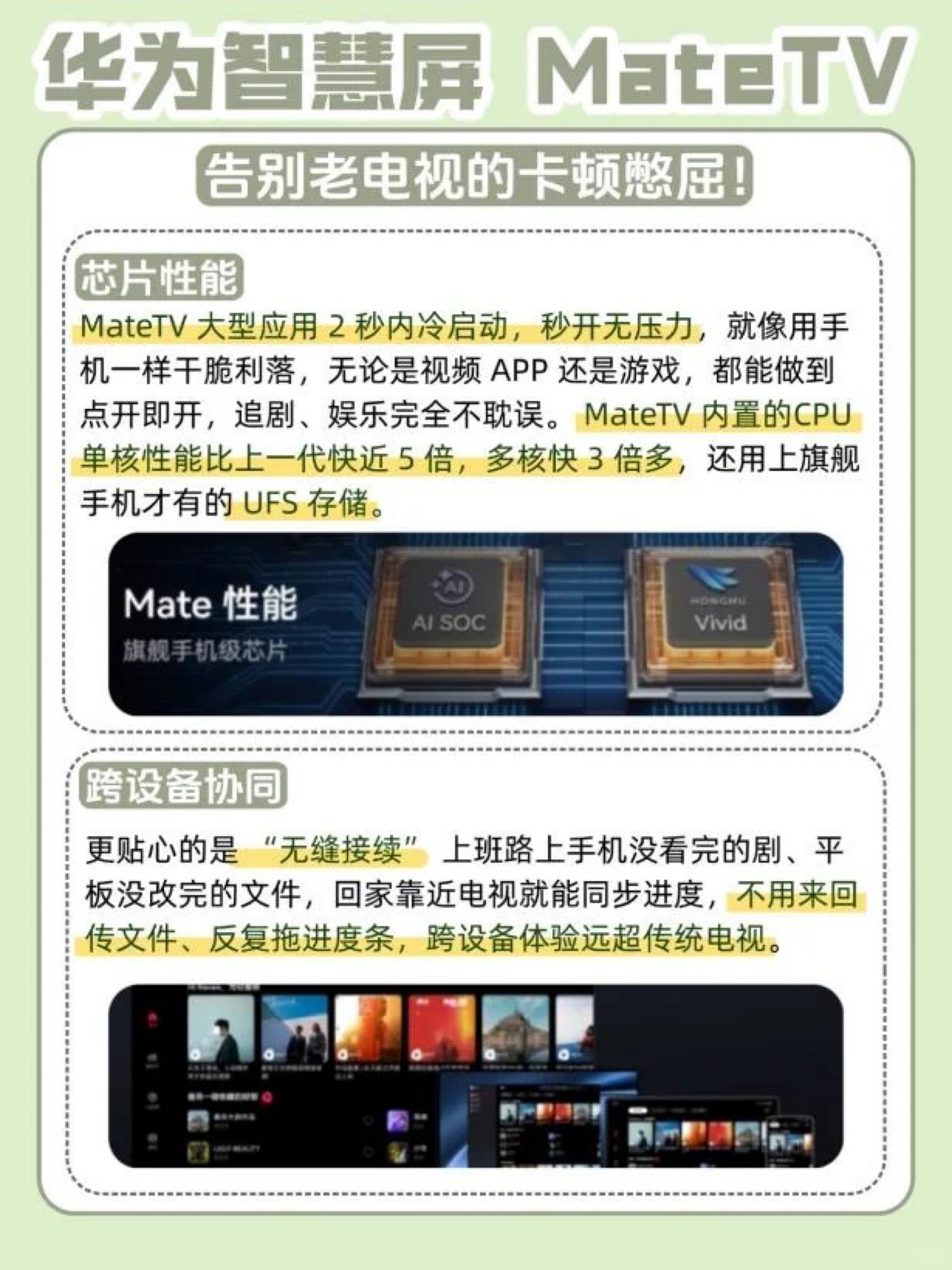 之前看电视忍不住吐槽:想投屏总连不上、装个 APP 操作超繁琐、连基本的体验感都是天方夜谭。直到看到华为智慧屏 MateTV,据说除了能看能玩,还能实现 “像手机一样的体验”,我入手试了一周。没想到它真的跳出了传统电视的局限,给大家整理出几个超赞的玩法指南,保准踩在你的心巴上! 第一个维度:性能体验 以前电视打开等半天,MateTV 直接颠覆体验 。大型应用 2 秒内冷启动,秒开无压力,无论是视频...