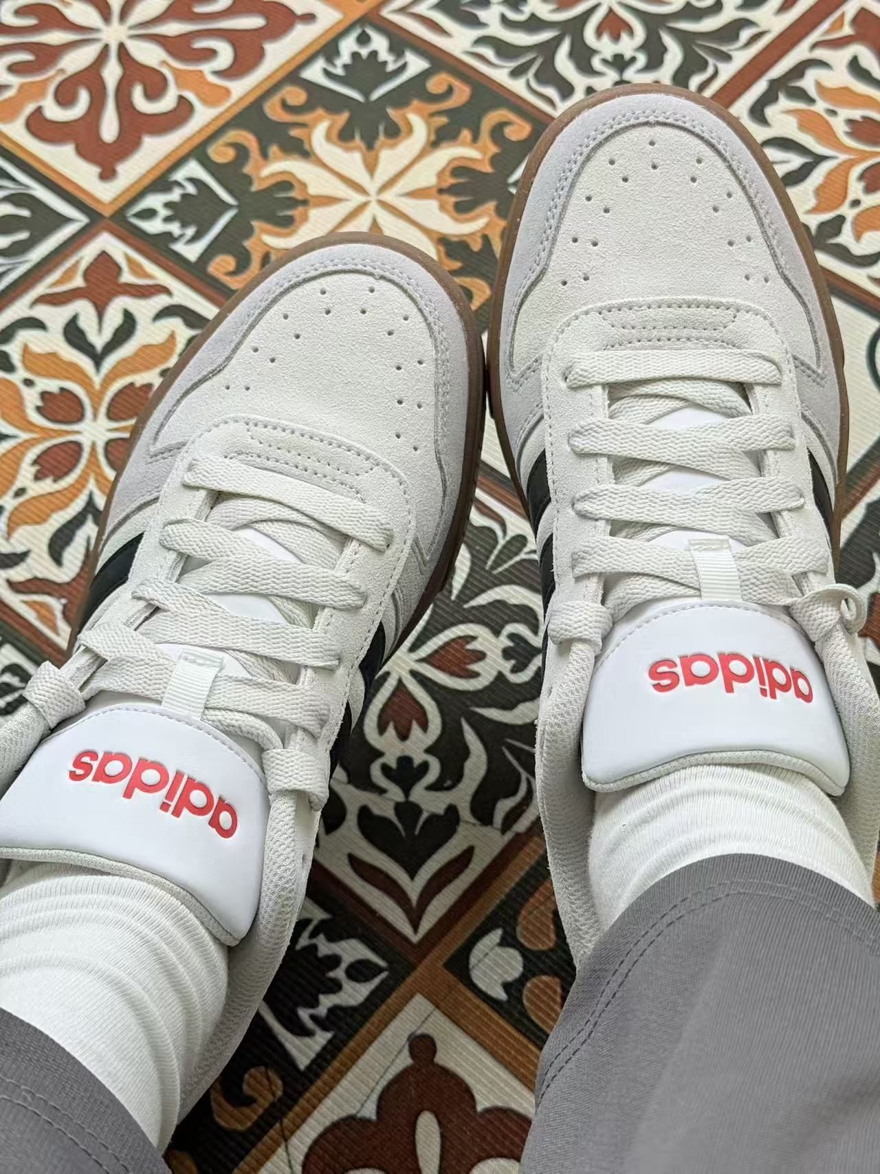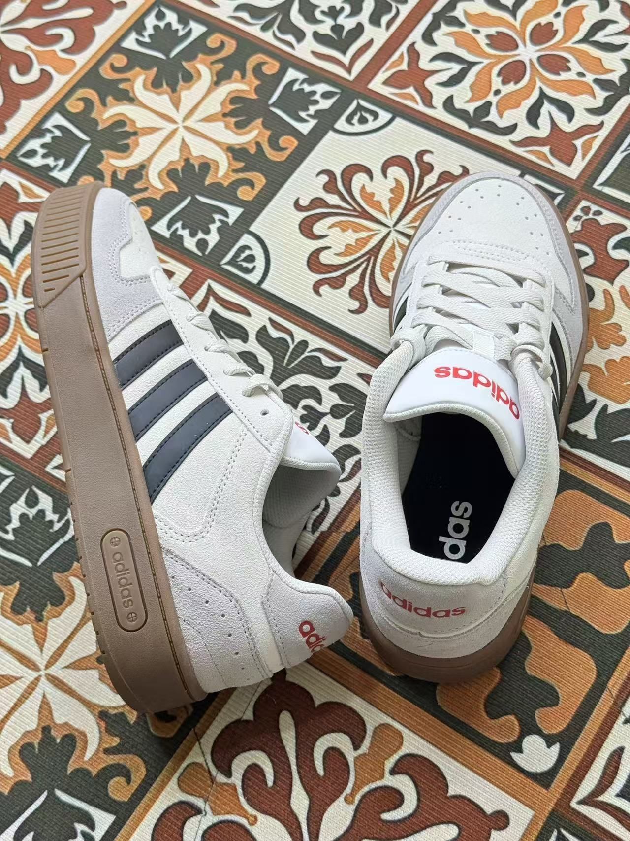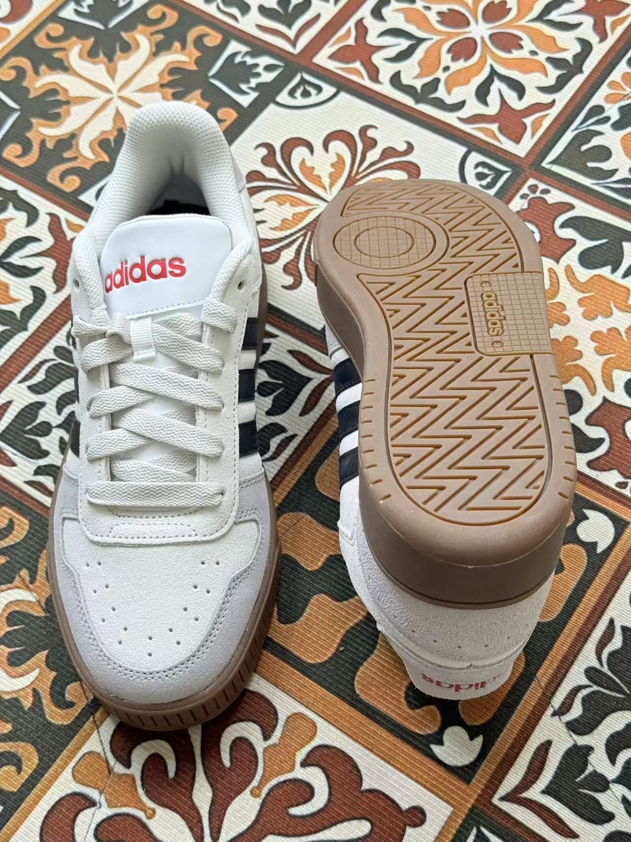 这双鞋给我的第一感觉就是“平平无奇但又有点特别”。白色鞋面配黑条纹,经典得不能再普通,但红色logo和生胶底又多了点复古味。 上脚第一周,舒适度是有的,鞋底软硬度刚好,走路久了也不会累脚。但麂皮鞋面确实娇气,稍微蹭一下就有印子,下雨天更是不敢穿。鞋带设计有点反人类,老是自己松开,出门前得反复检查。 最让我纠结的是尺码,平时穿42码的鞋,这双却要买41码才合脚,试了好几次才搞清楚。透气性一般...