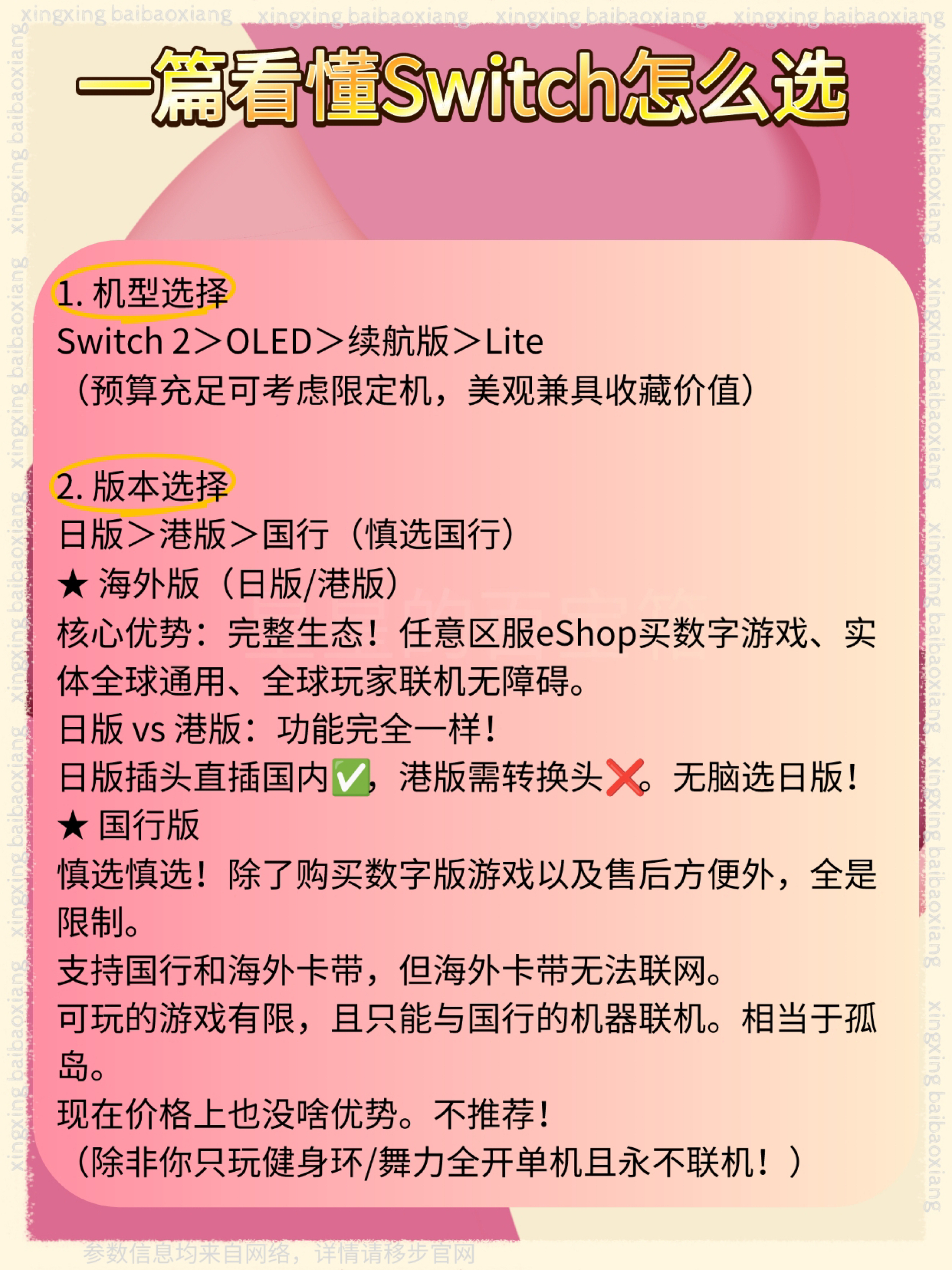 宝子们,国庆假期星星我被Switch的快乐戳中了! 所以今天来给大家分享一篇购买心得! 单人宅家游戏、情侣贴贴联机、亲子同屏互动——一张卡带,全家都能玩,怎么算都不亏的。 机型怎么选? Switch2>OLED>续航版 Switch2:刚上市的新机型,性能升级+新功能加持,预算够直接冲新机型准没错,体验感拉满 OLED:屏幕色彩更棒,适合喜欢躺着玩的宝 续航版:性价比之王,新手入门试水选它不...