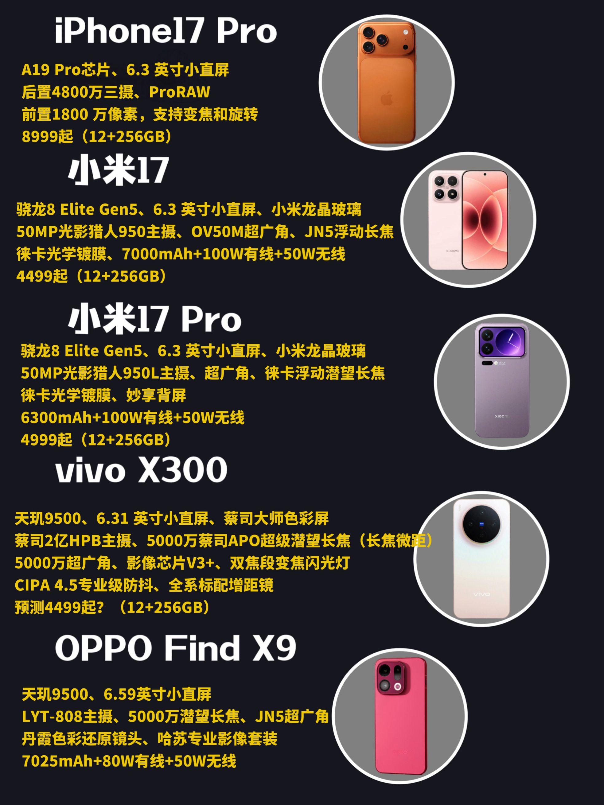来到10月份,新品旗舰手机就正式开启终极PK大战了。 目前已经发布的有🍎17系列、小米17系列,接下来就看vivo X300系列、OPPO Find X9系列的了。虽说后面两款没公布价格,不过配置信息也基本上都被曝光的差不多了。今天来深度分析一下这四家的旗舰机,看看你们会更偏向于哪一款。 🍎17系列 标准版的高刷终于是盼来了,Pro版本外观大变,辨识度更高了。支持前置镜头横竖向切换拍摄,这一...