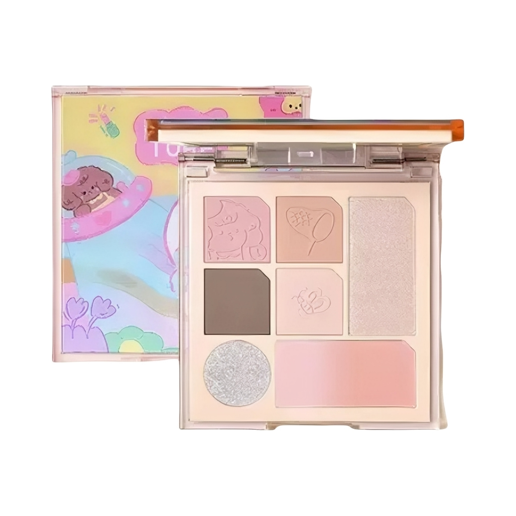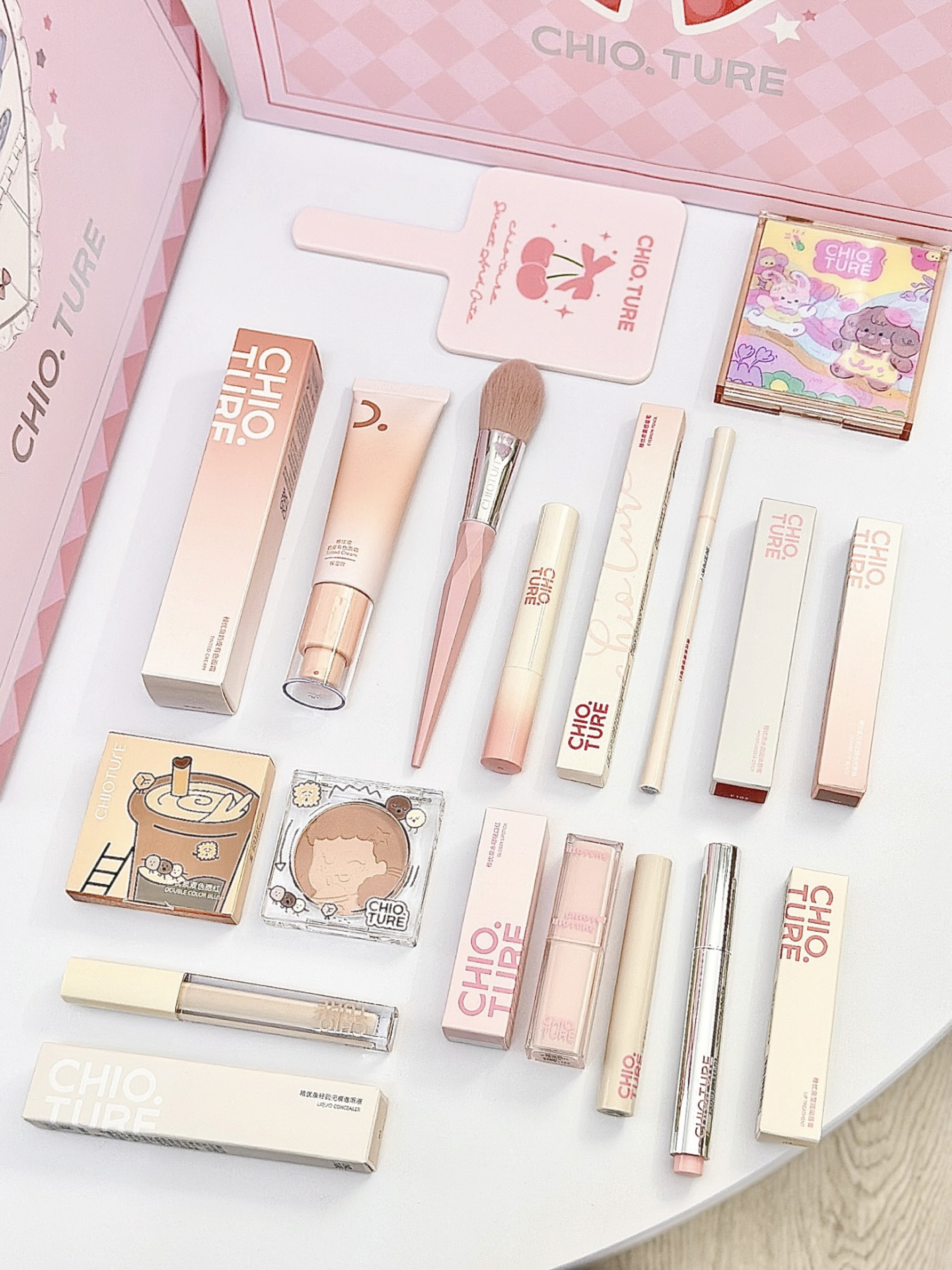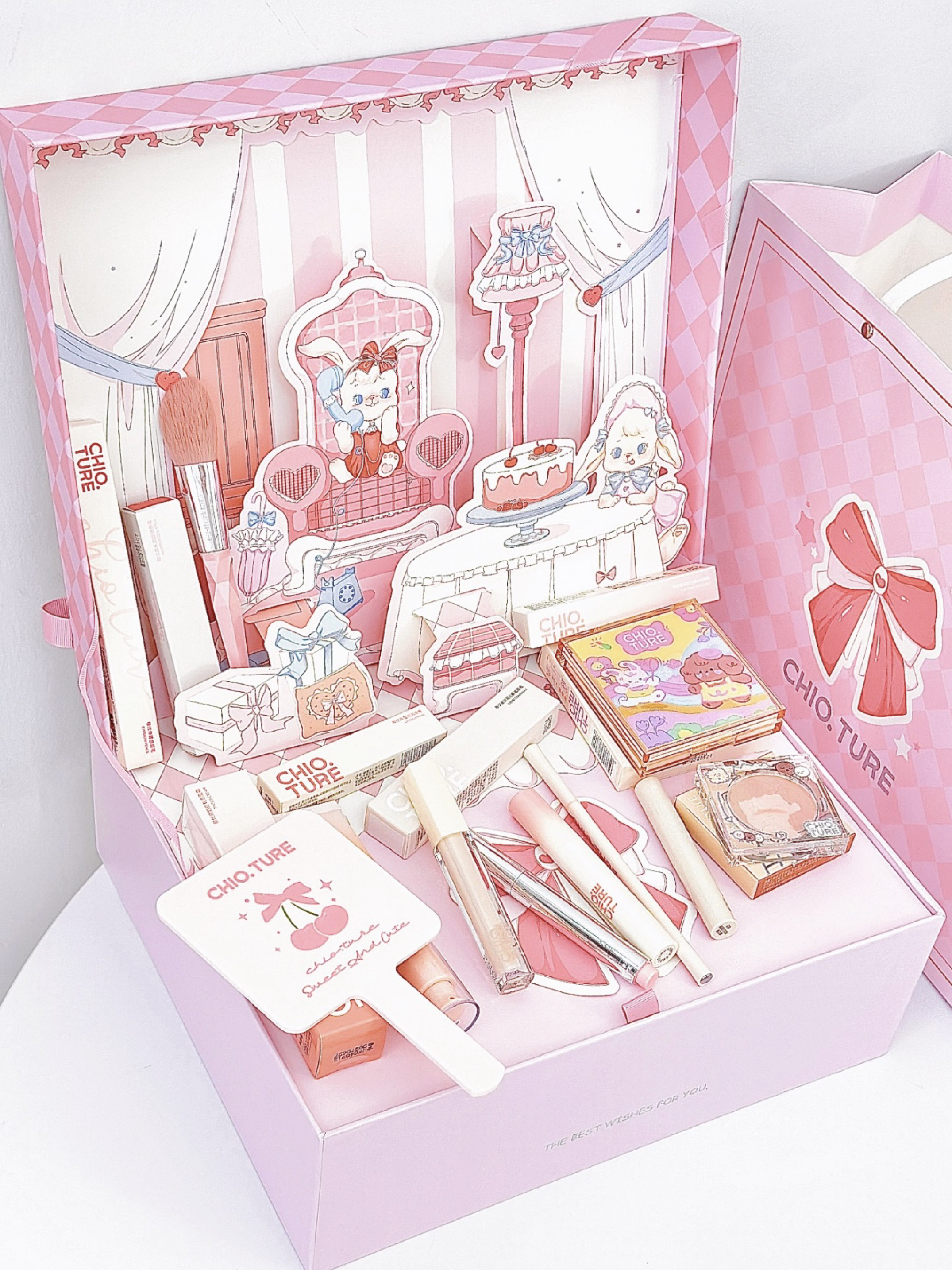 就是介个稚优泉限定甜蜜礼盒 粉粉嫩嫩的包装 咱就说哪个女孩子看了不迷糊哇 刚打开就是一幅立体图案 太可爱了 里面有面霜、腮红、遮瑕、口红、唇蜜、润唇膏、眉笔、化妆刷、眼影盘、手持镜 眼影盘的配色蛮实用的 没有一块废色 hin适合早八人 这一套搭配下来轻松get早八日常妆容