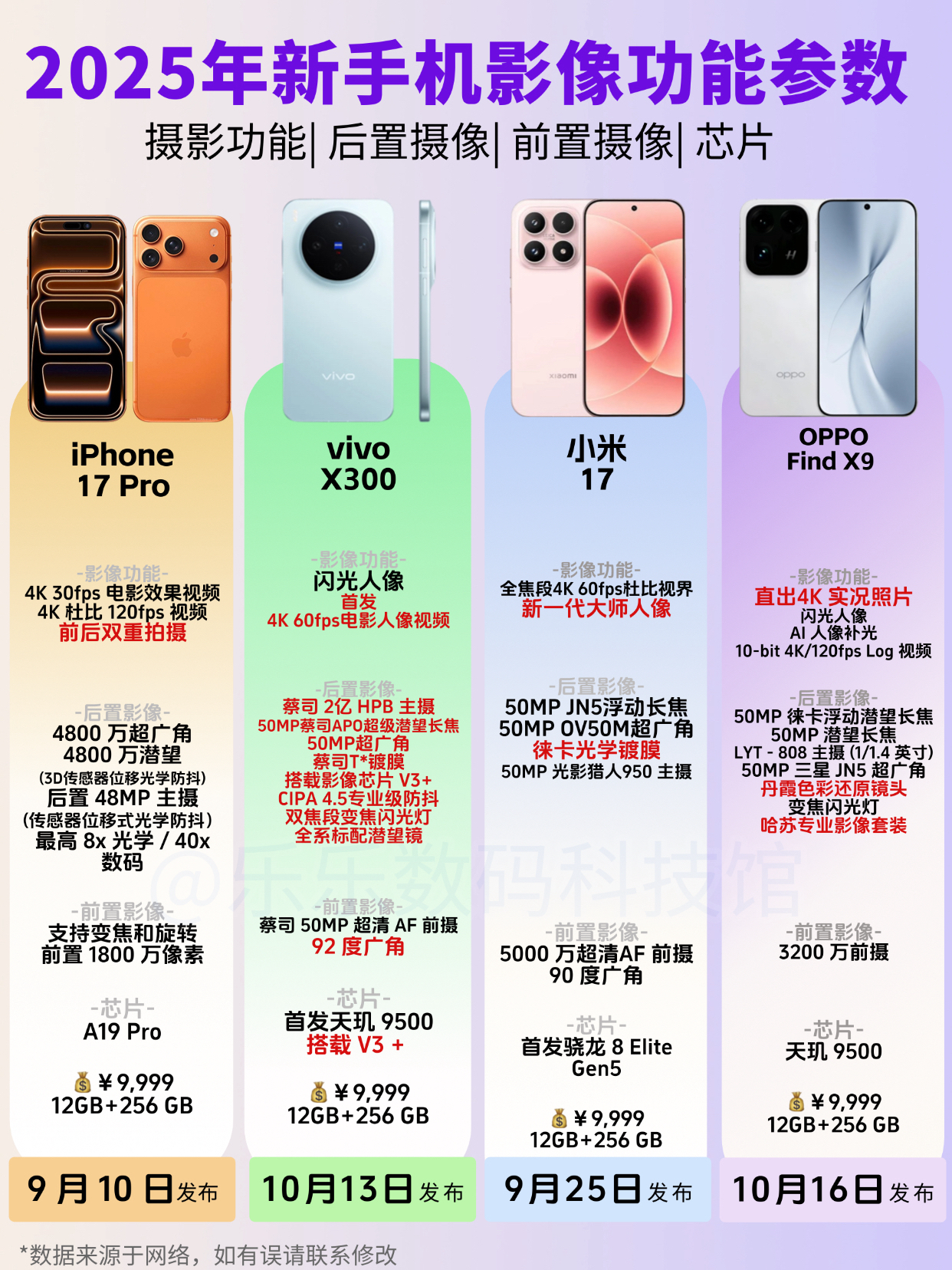 今年下半年这批旗舰手机的竞争好激烈啊,各大主流品牌真的都把大招放出来了。看了好几天,整理了一份主流手机摄像方面的参数对比,需要换影像旗舰新机的宝子可以参考。 影像配置: 今年的新机,前置摄像、后置摄像比往年都多了一些新玩法。例如iPhone17系列支持前后双重拍摄,很适合拍vlog,可以更多视角同步拍摄。小米17Pro Max的背屏自拍可以看到实时画面,这个也很方便,平时后置自拍可以不用盲拍找...