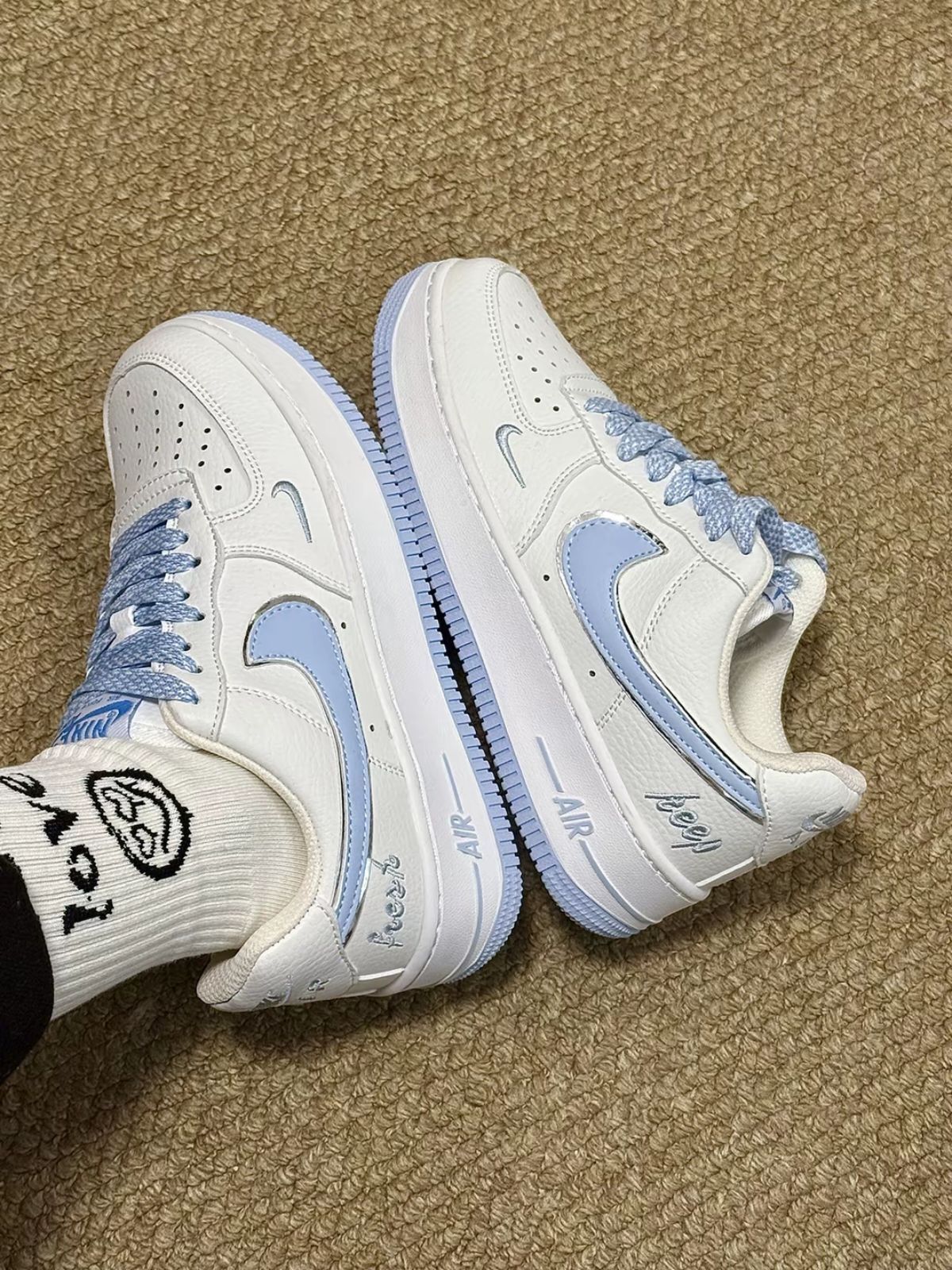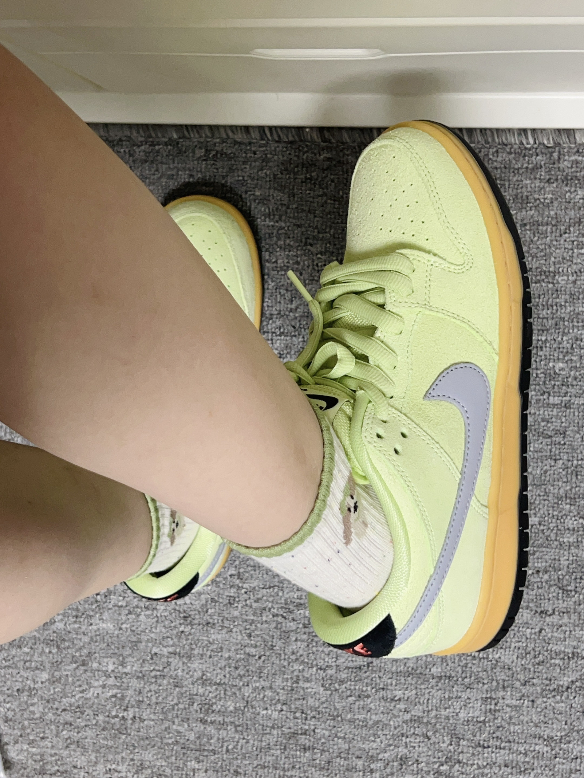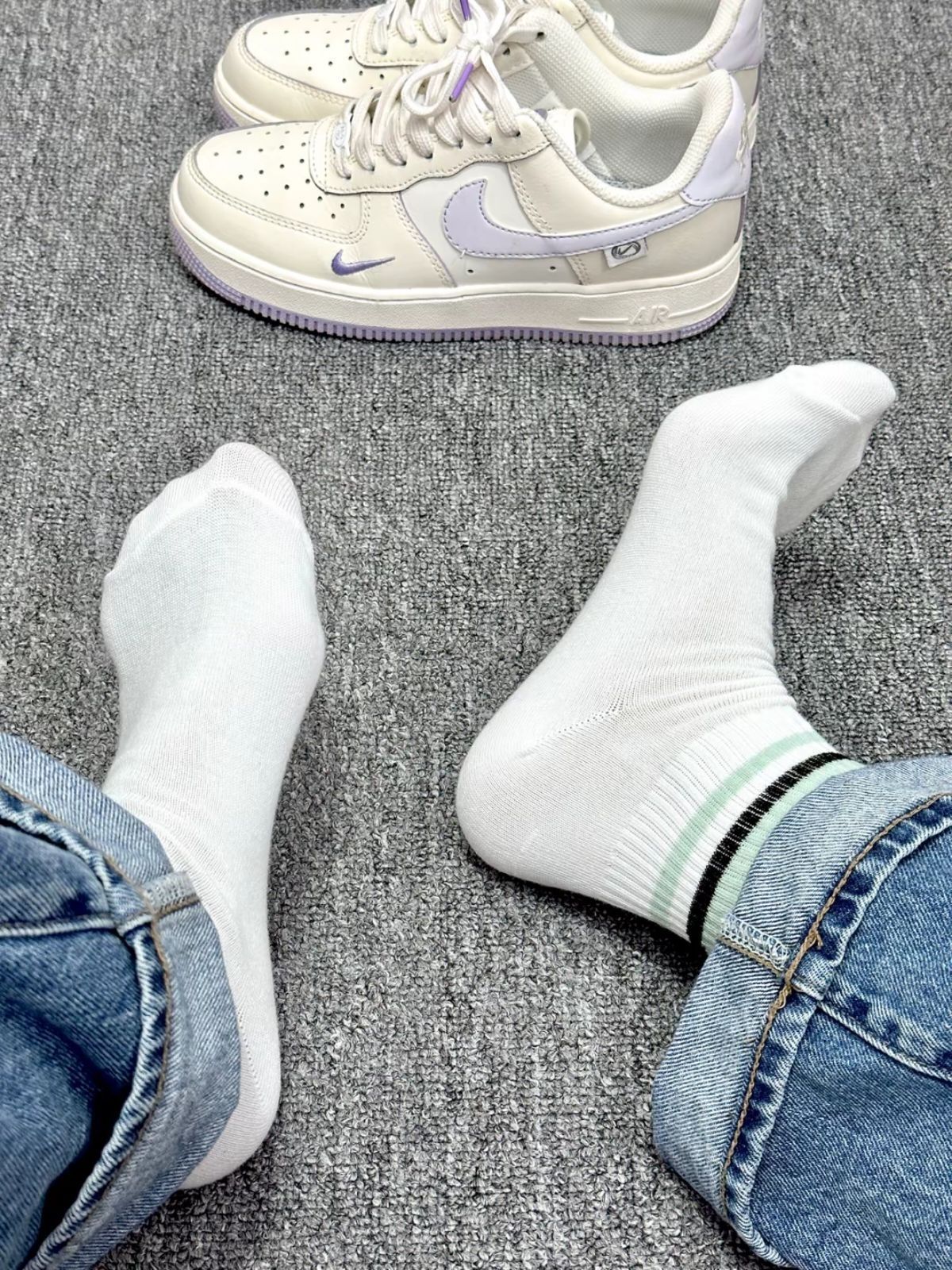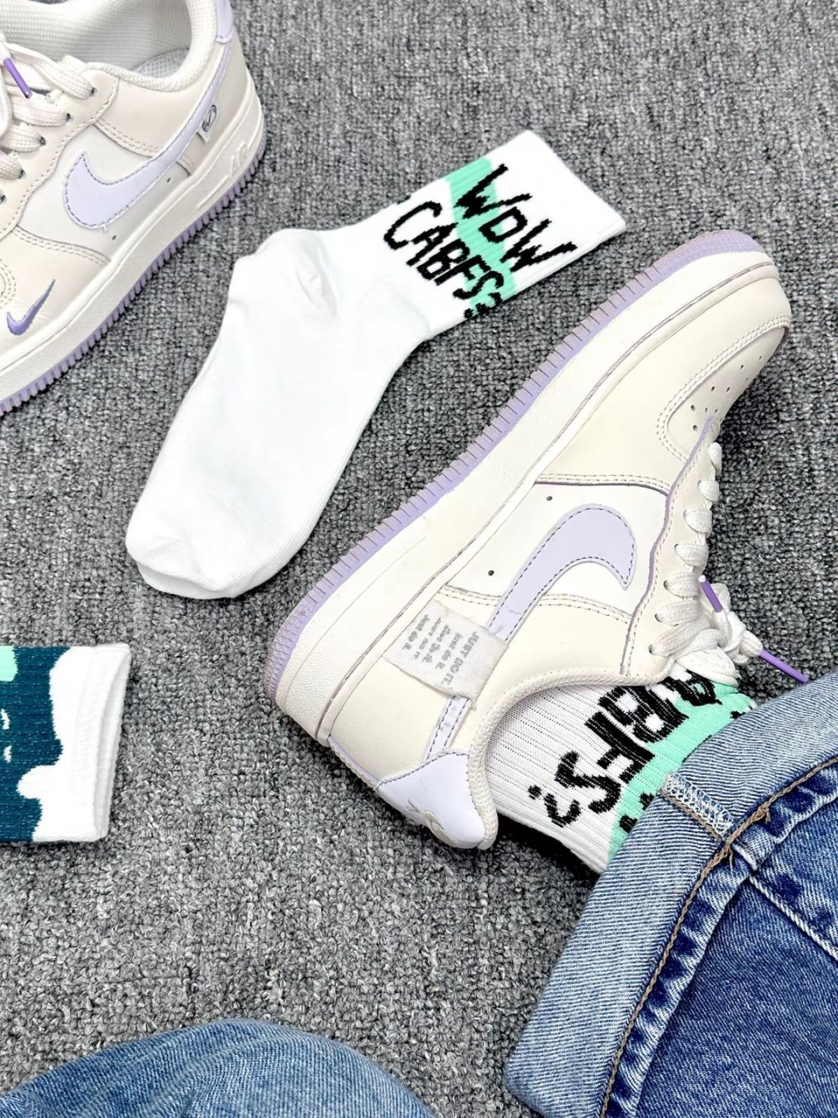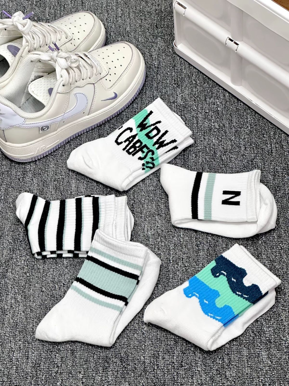 素比鲁斯家的纯棉中筒袜 一盒内有五双不同的涂鸦图案 我每天都可以换着不重样的穿了 上脚的脚感我觉得好好 舒服又透气 和我的nike浅紫板鞋搭配起来也好看