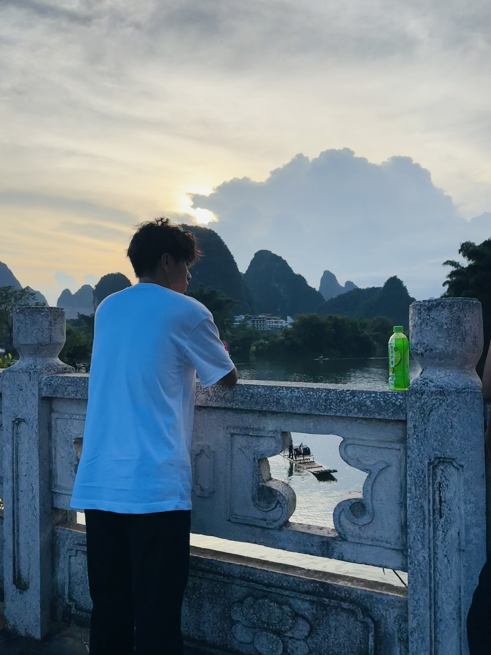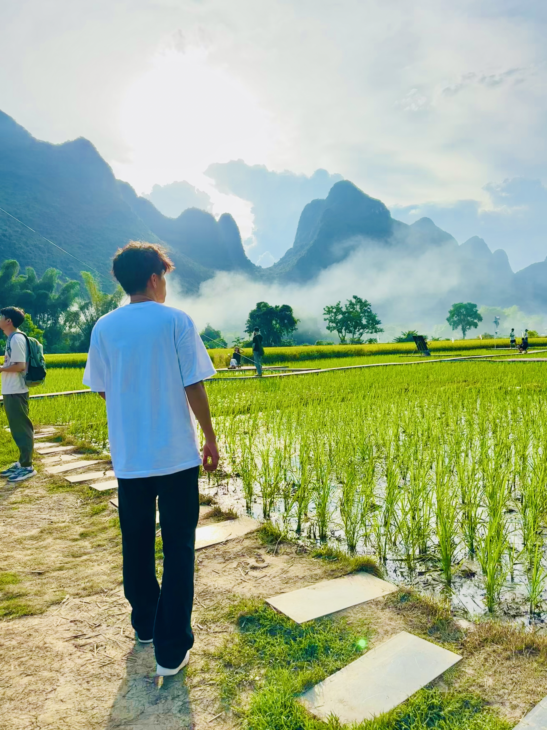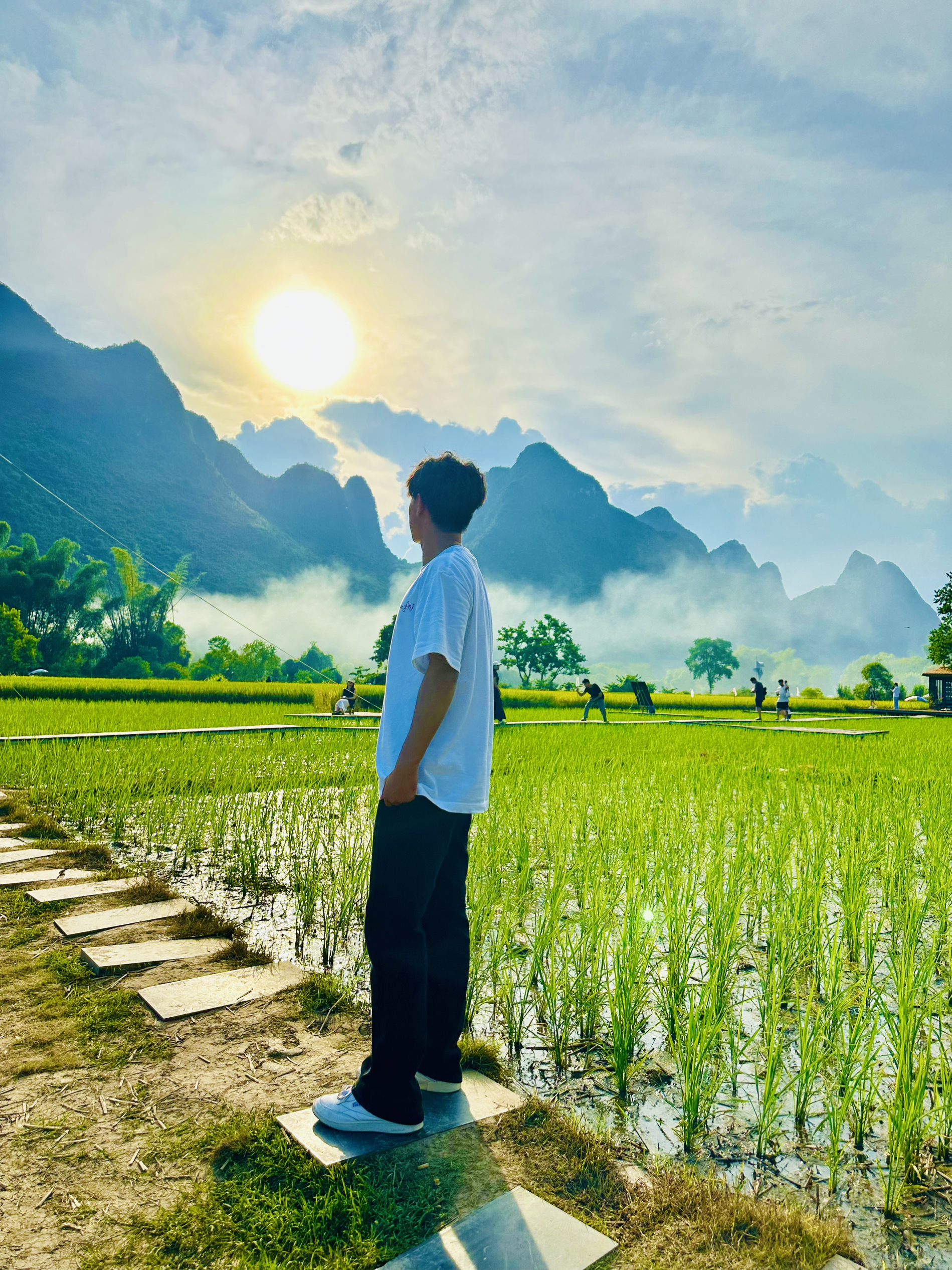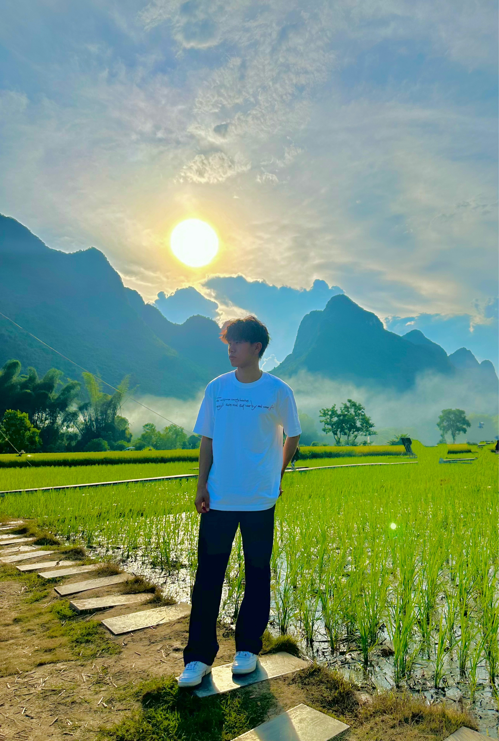 穿搭是一种表达 这套穿搭以简约休闲风为主,白色字母印花T恤简约又具设计感,搭配黑色阔腿裤,利落又显腿型,白色休闲鞋与上衣呼应,整体色调干净清爽,营造出随性自在的少年感。 背景亮点十足,稻田绿意盎然,与远处喀斯特地貌的山峦相映成趣,云雾缭绕间更显朦胧诗意。澄澈蓝天与耀眼阳光为画面注入活力,田园风光的清新质朴与穿搭的休闲感完美融合,既凸显了自然景色的治愈感,又让穿搭在这般景致中更显清新有格调,仿佛一...