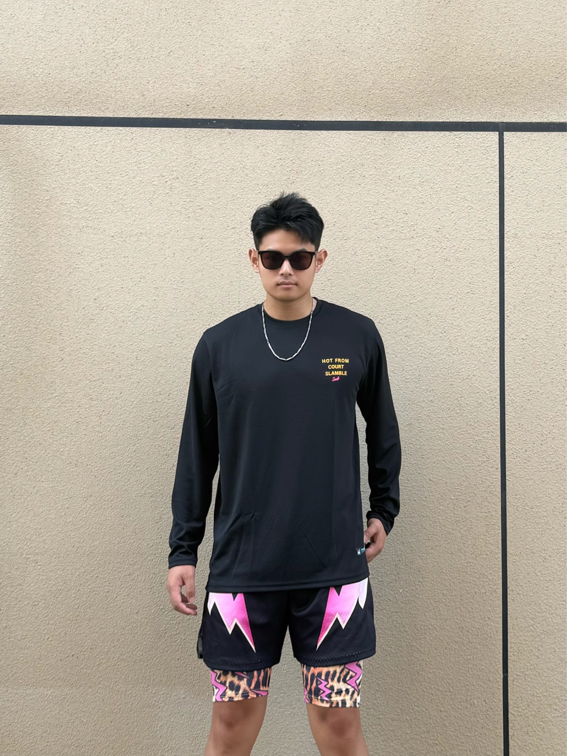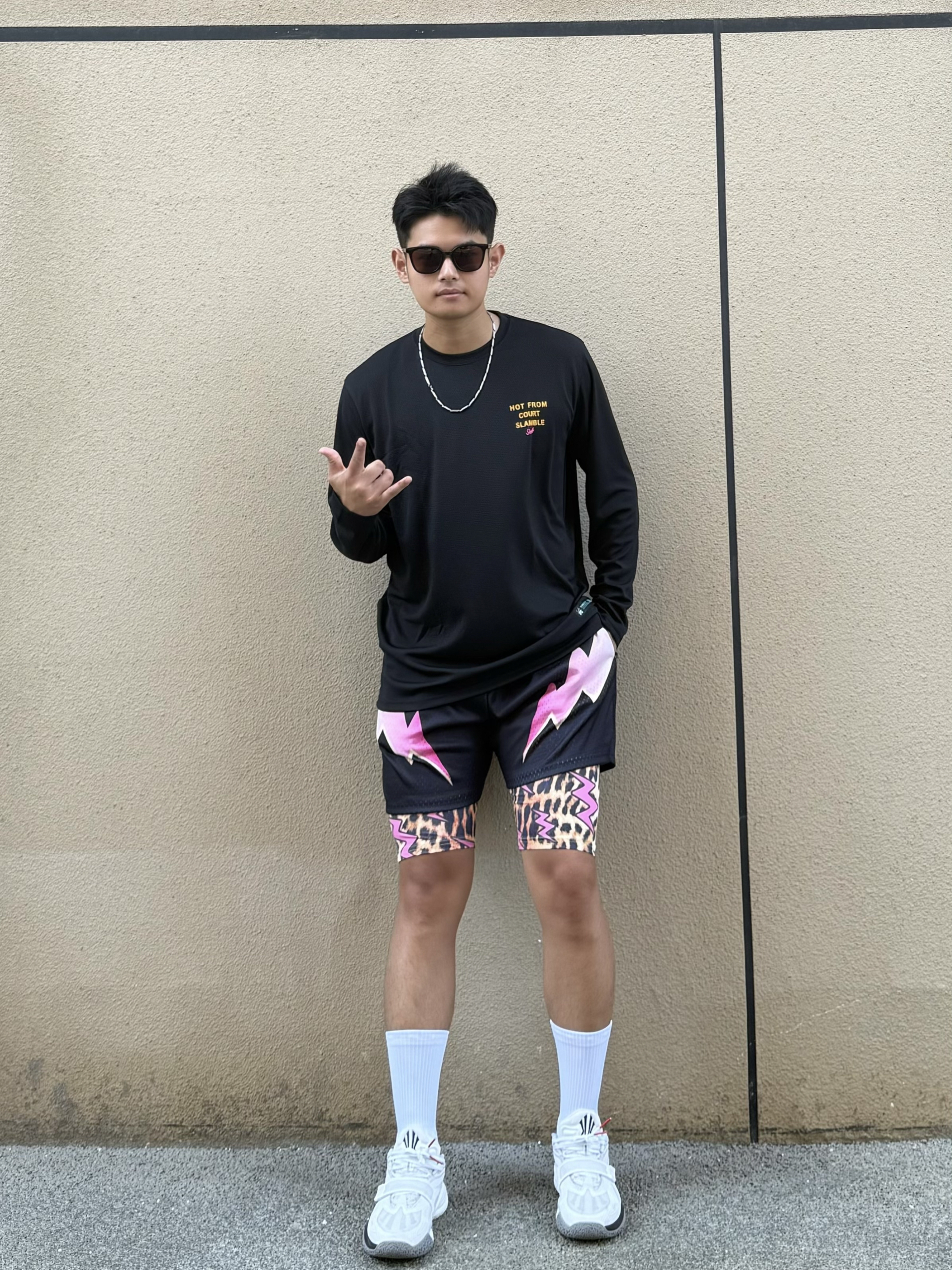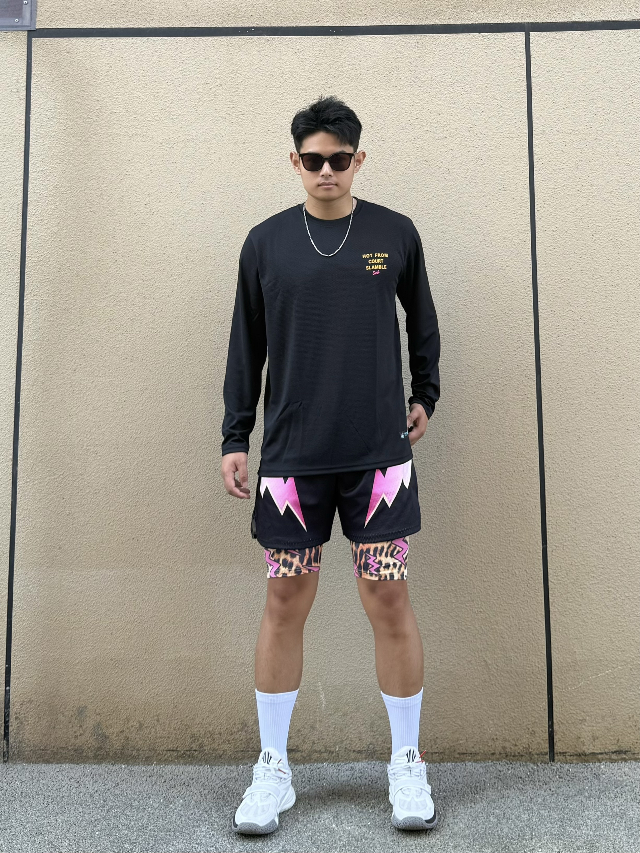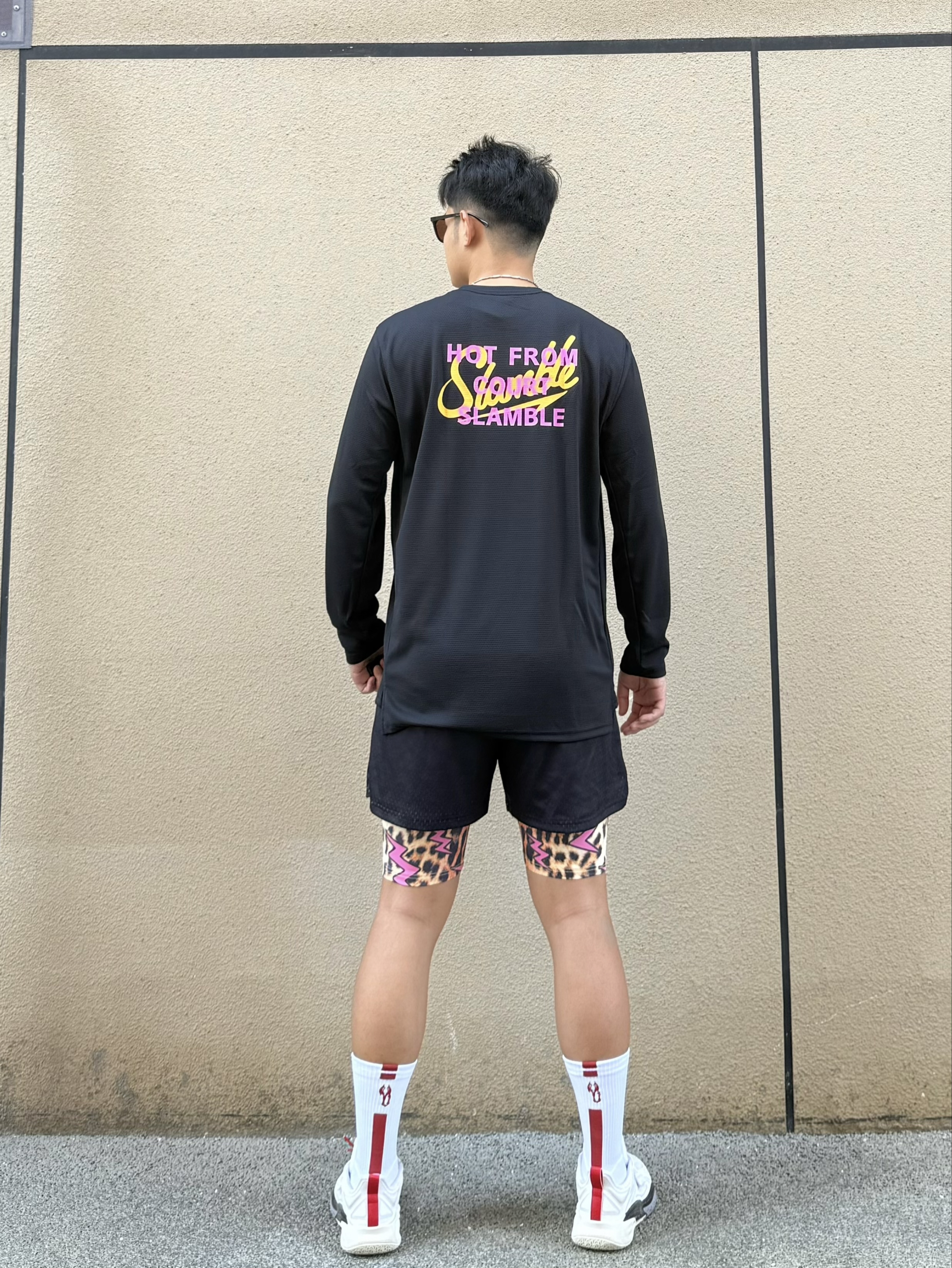 身高|体重:180cm|80kg 🧍♂️ 穿搭风格:美式篮球风 👔 上衣:slamble美式长袖 👖 下装:swish 美式豹纹闪电假两件短裤 👟 鞋子:安踏欧文一代太极