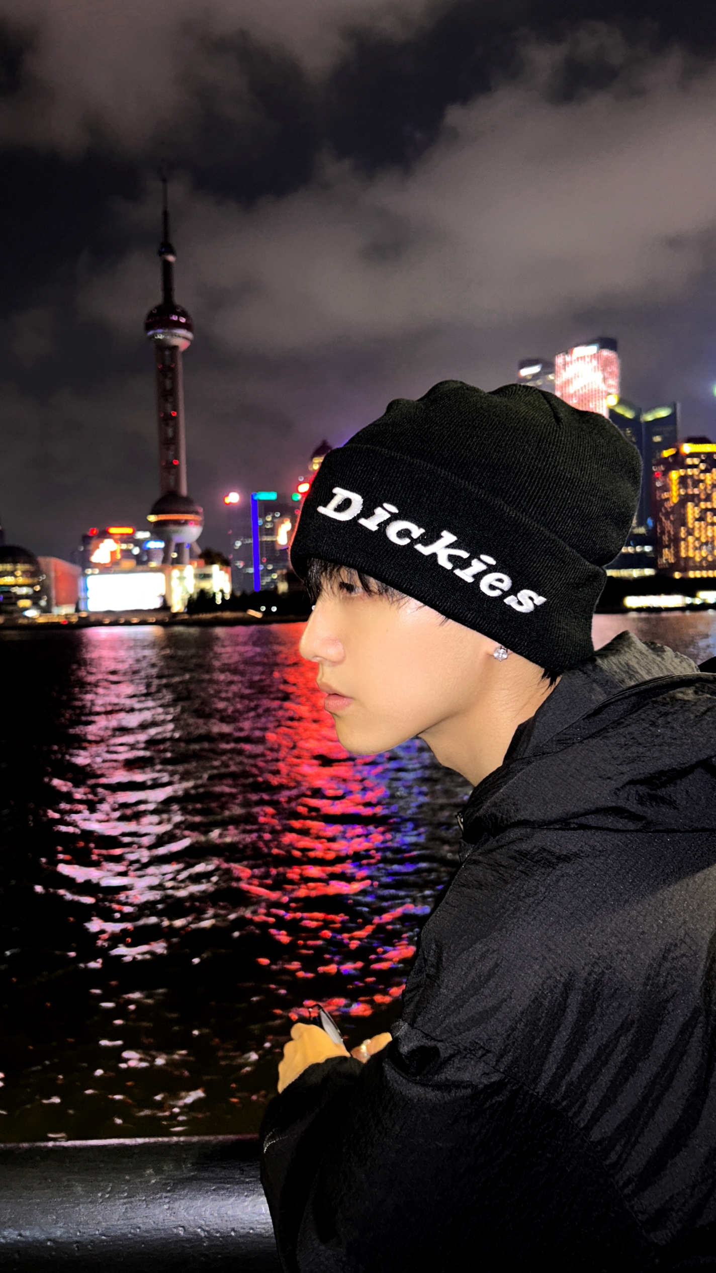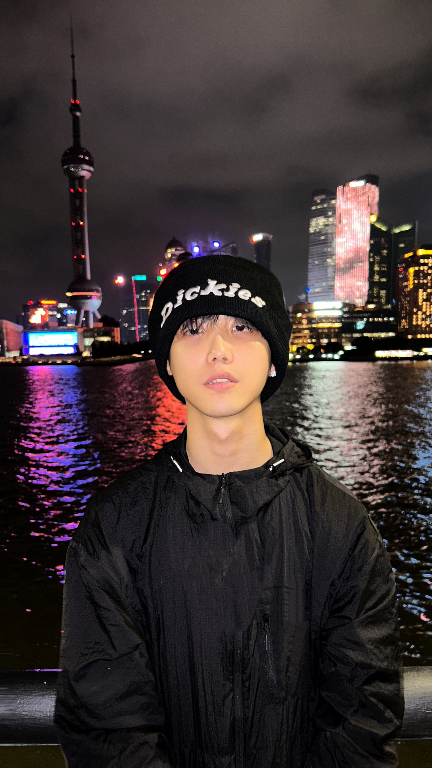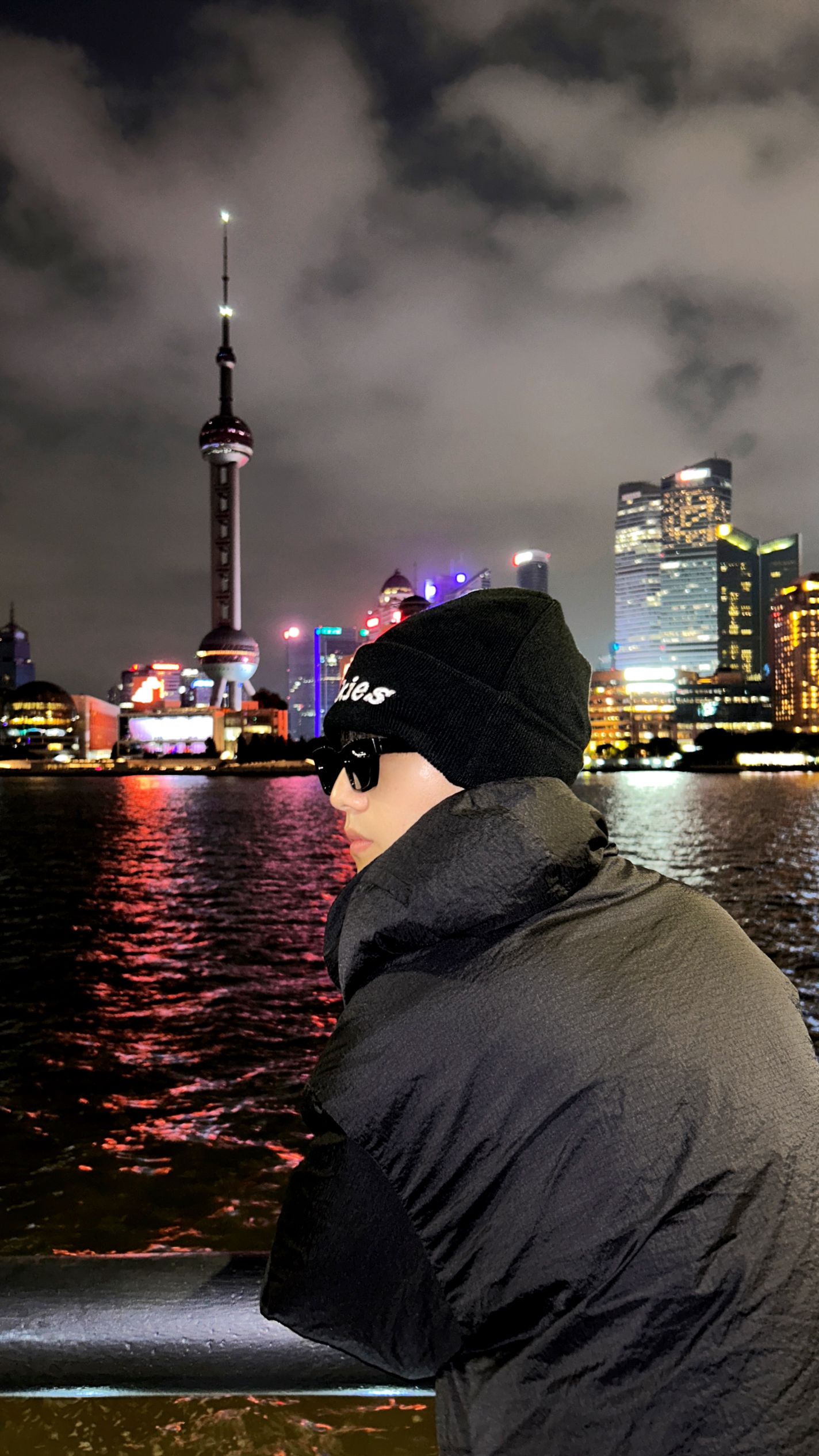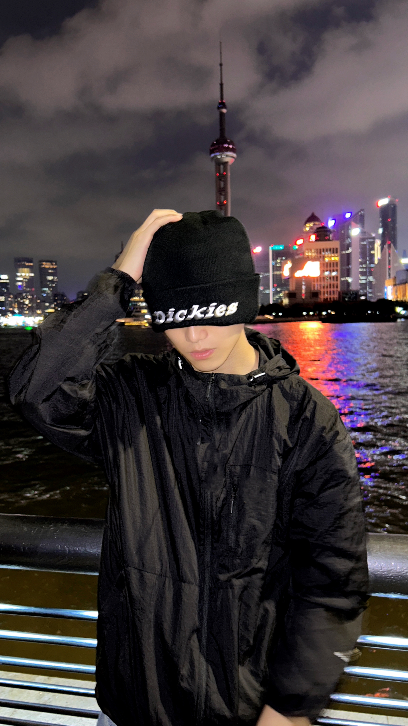 夜晚的上海时那么美丽 在江边散步吹着晚风还有点小冷呢 带上我的冷帽Q既保暖又可以凹造型 今天是冷帽小子很有氛围感 针织抓绒戴在头上不勒不扎很舒服 帽子上的logo简单醒目还蛮有街头范的 戴上之后确实是帅呀