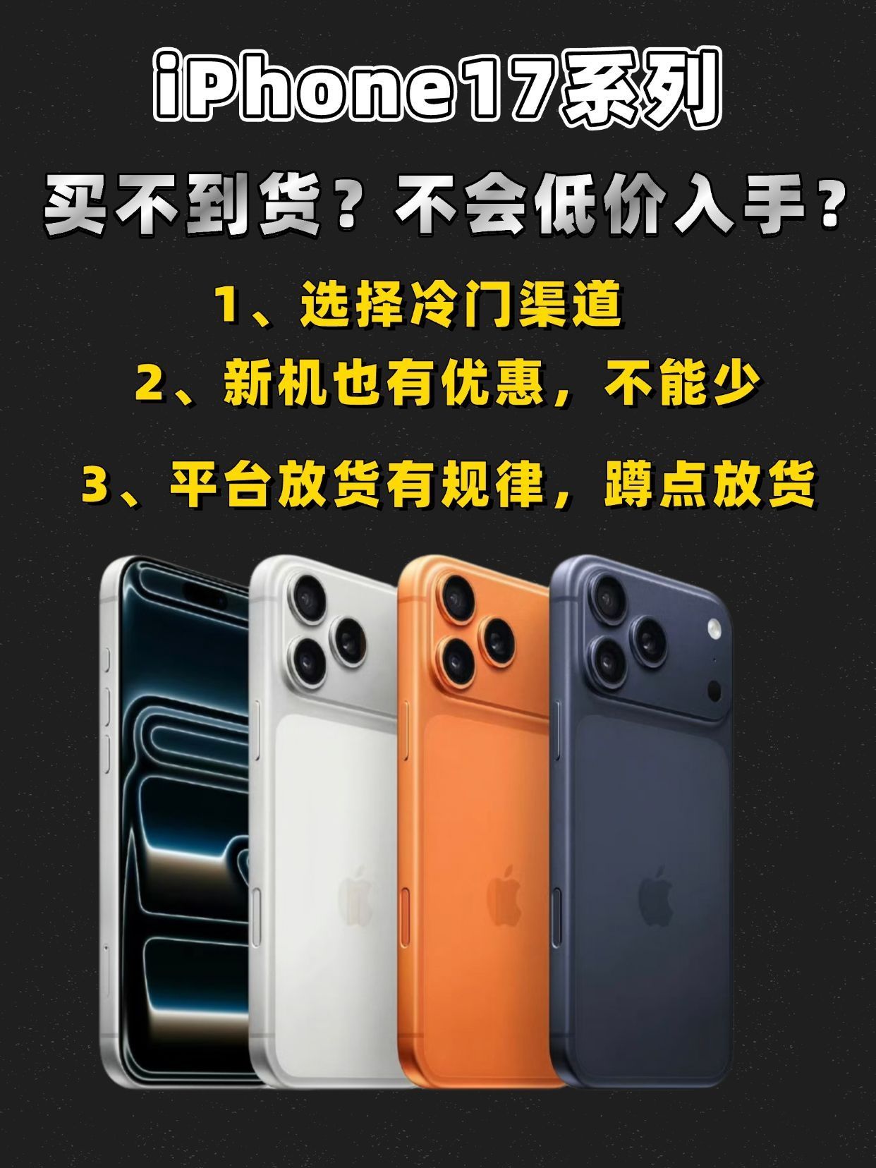 谁懂啊!iPhone17总断货?有货+省钱攻略来啦,别等大促了! 蹲iPhone17的朋友太懂这种崩溃了吧!等首批用户反馈的功夫,常用平台全没货,还好扒了好几天平台规律,整理出「不用拼手速还能省」的购机方法,亲测有用,赶紧码住! 1. 换个途径,避开抢货大军 别死盯热门平台啦!发现一个比较小众的「品牌官方合作途径」,全新正品、全国联保都有保障,关键知道的人少,不用蹲点拼手速,我蹲了1天...