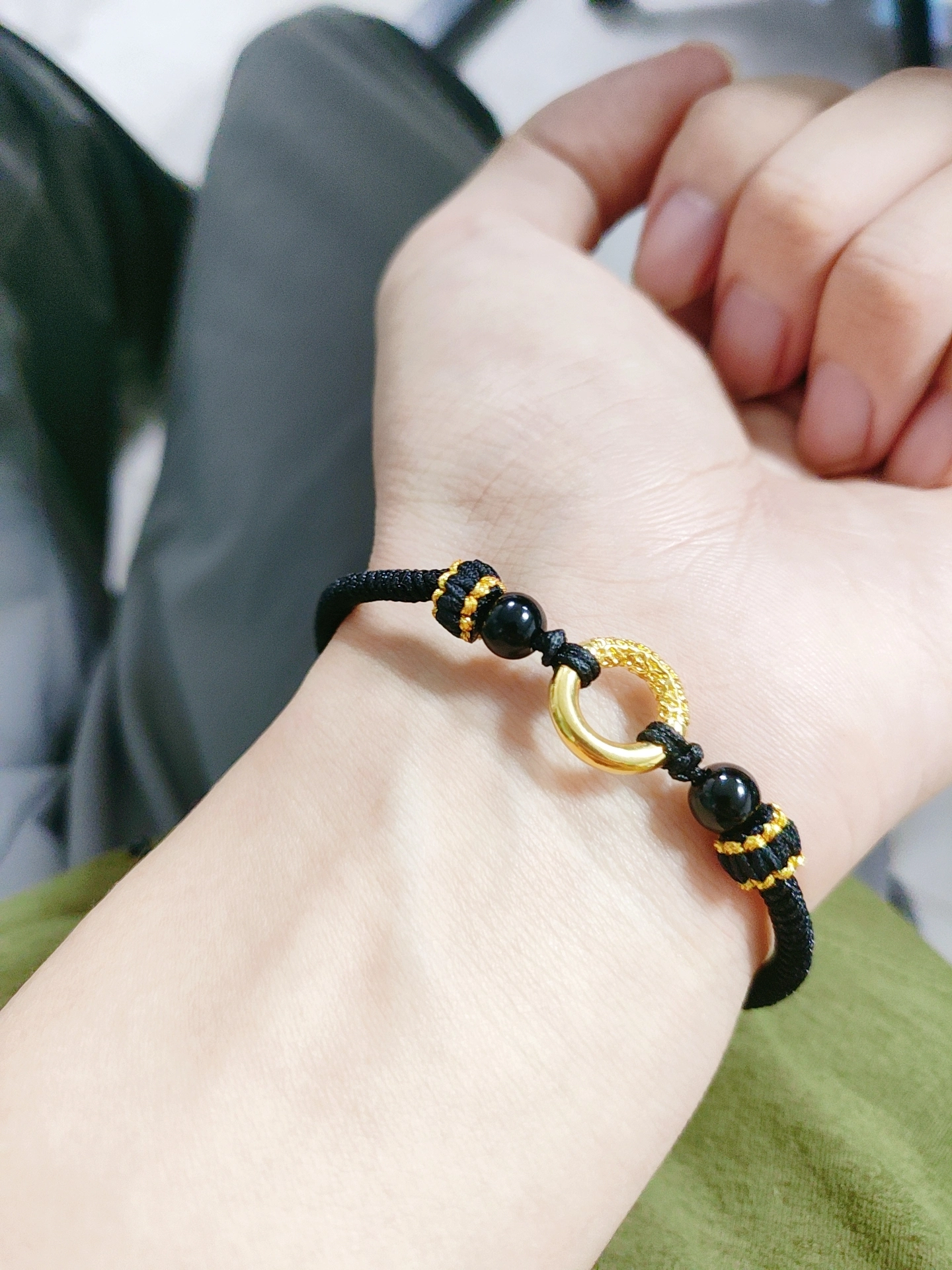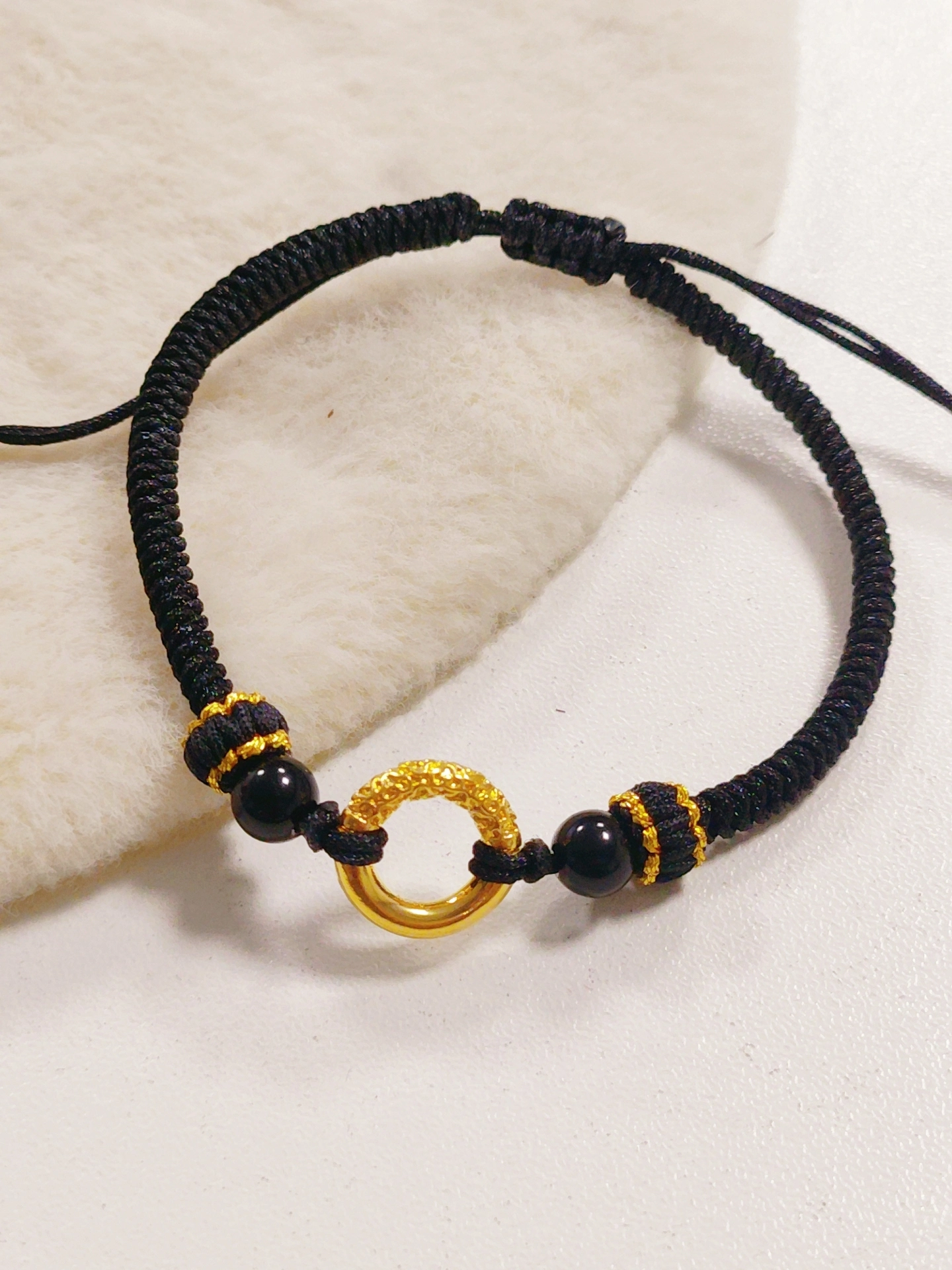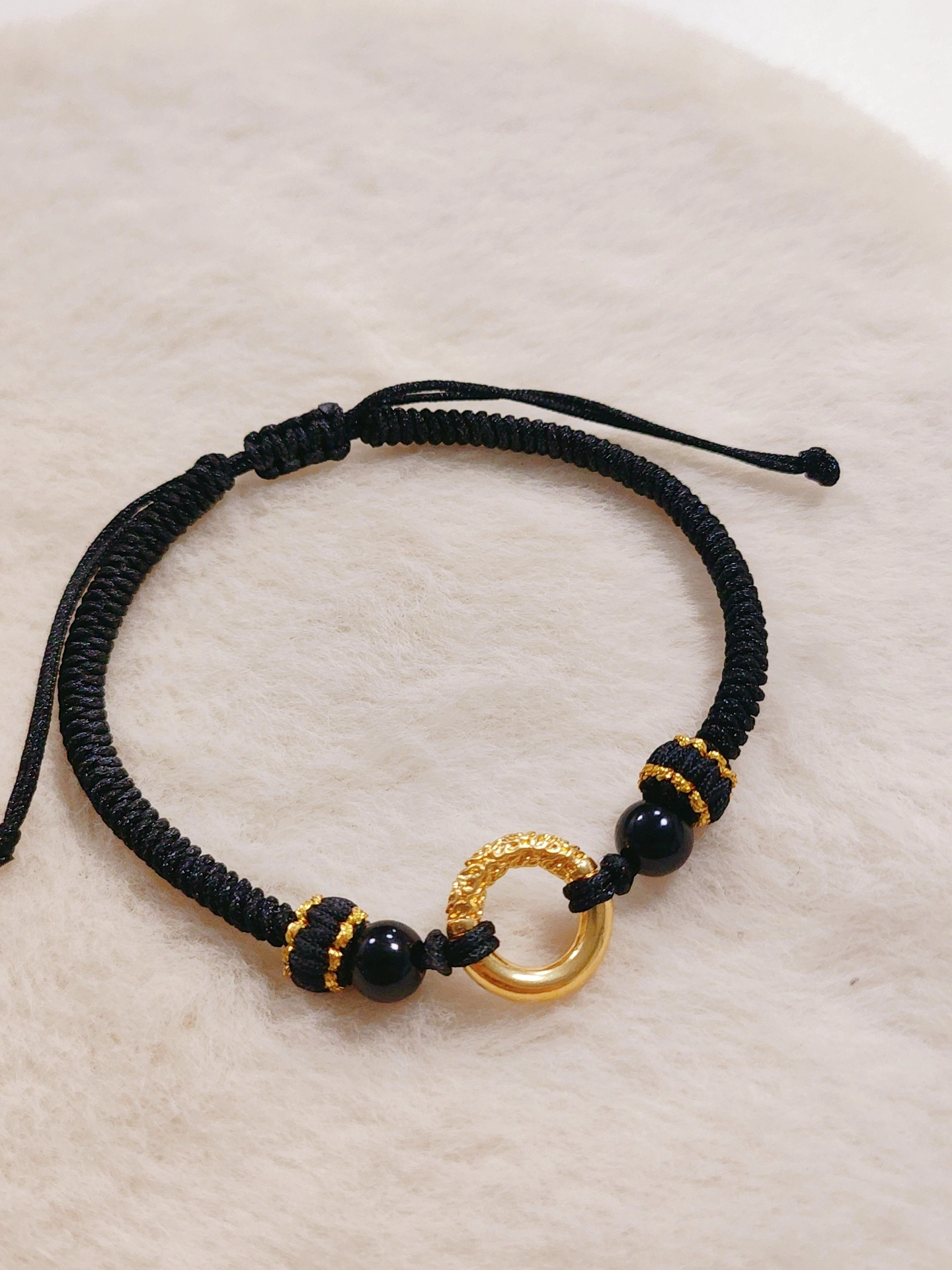 我发现这新中式手绳好有氛围感!黑金配色复古又大气,足金平安扣和黑曜石搭配,戴手上很显质感~而且是可调节的,情侣戴都合适~不过手绳是编织款,夏天出汗多了得注意清洁🧼 不管是当爱情礼物还是自己戴,都很有仪式感,咱中国人的浪漫还得是这种新中式配饰哇🥰