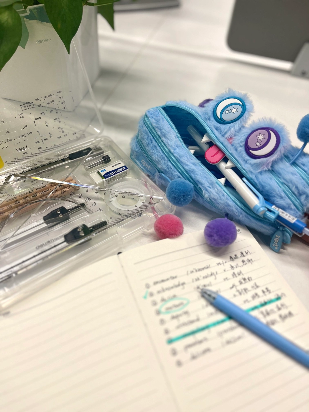 高中学习又累又枯燥😩 但这套文具让我快乐学习啦~得力制图工具画图偏差少,知识点更清晰📐;二合一记号笔标注单词超方便,背诵效率up📝;毛绒笔袋好rua又治愈,学累了揉一揉超解压🥰 不过要是笔袋容量再大点就更完美啦~