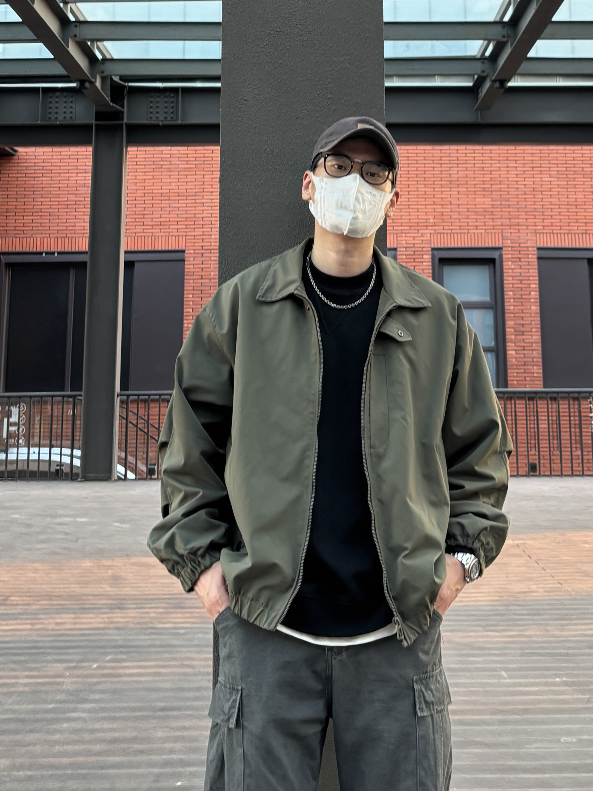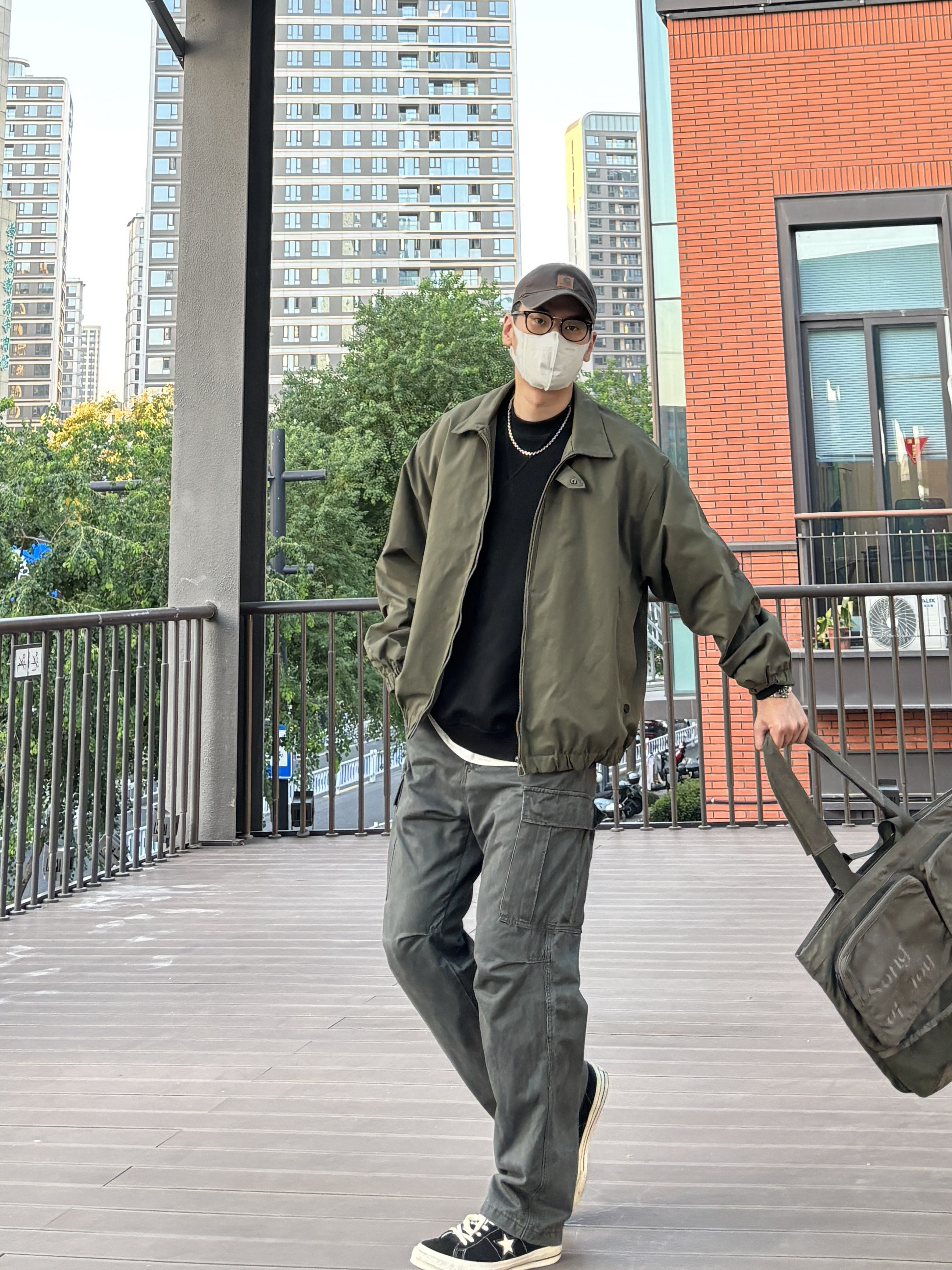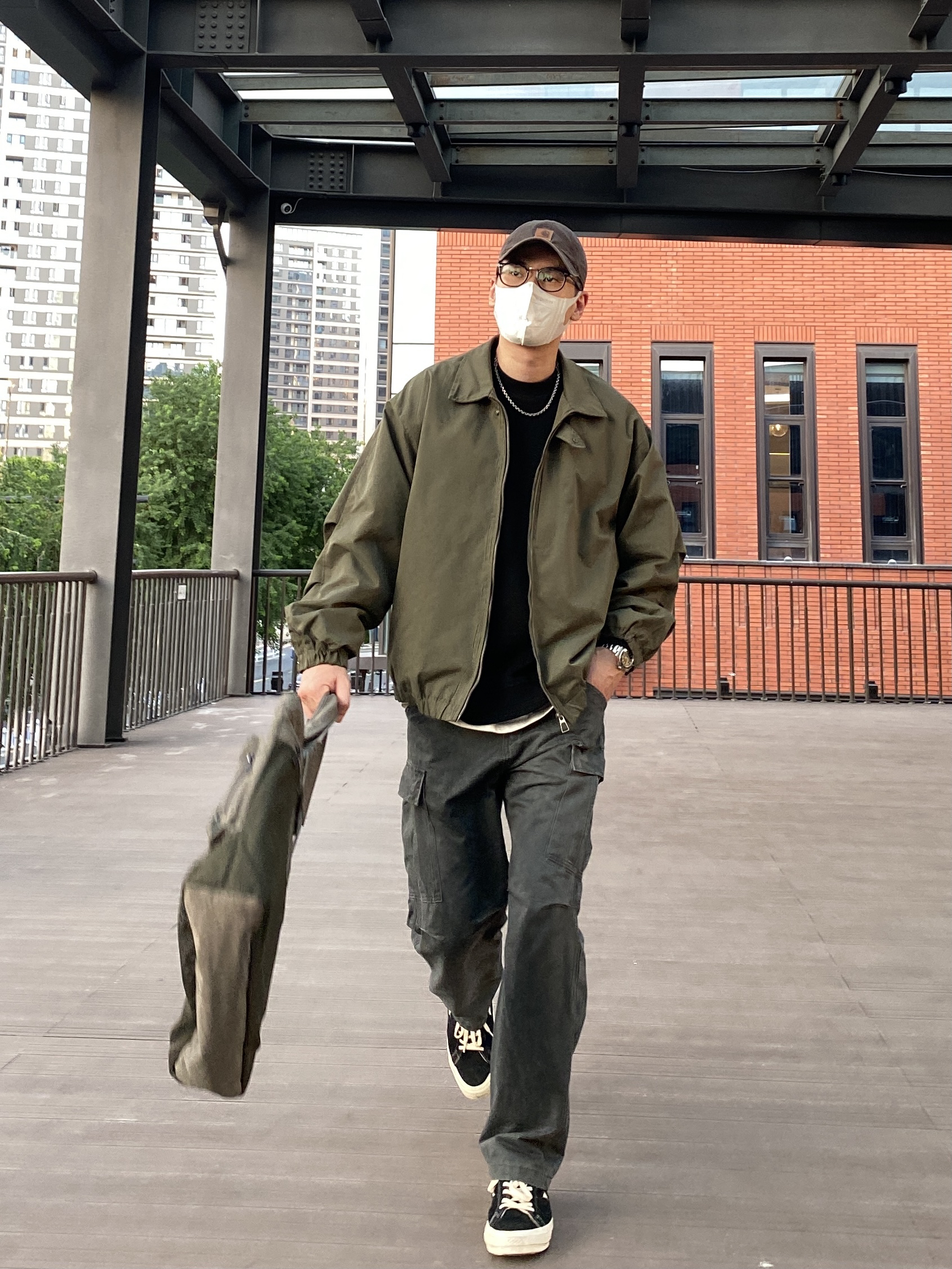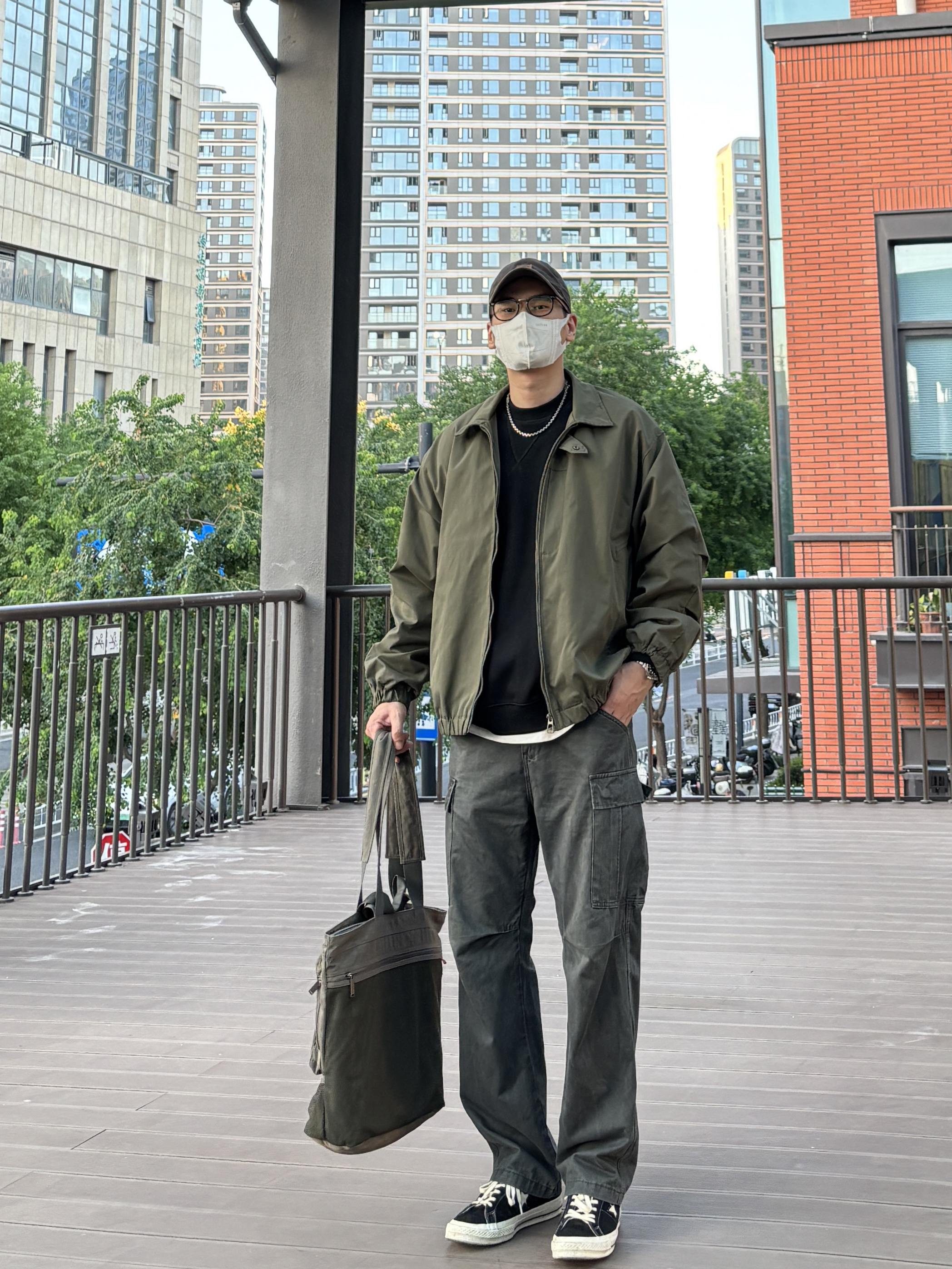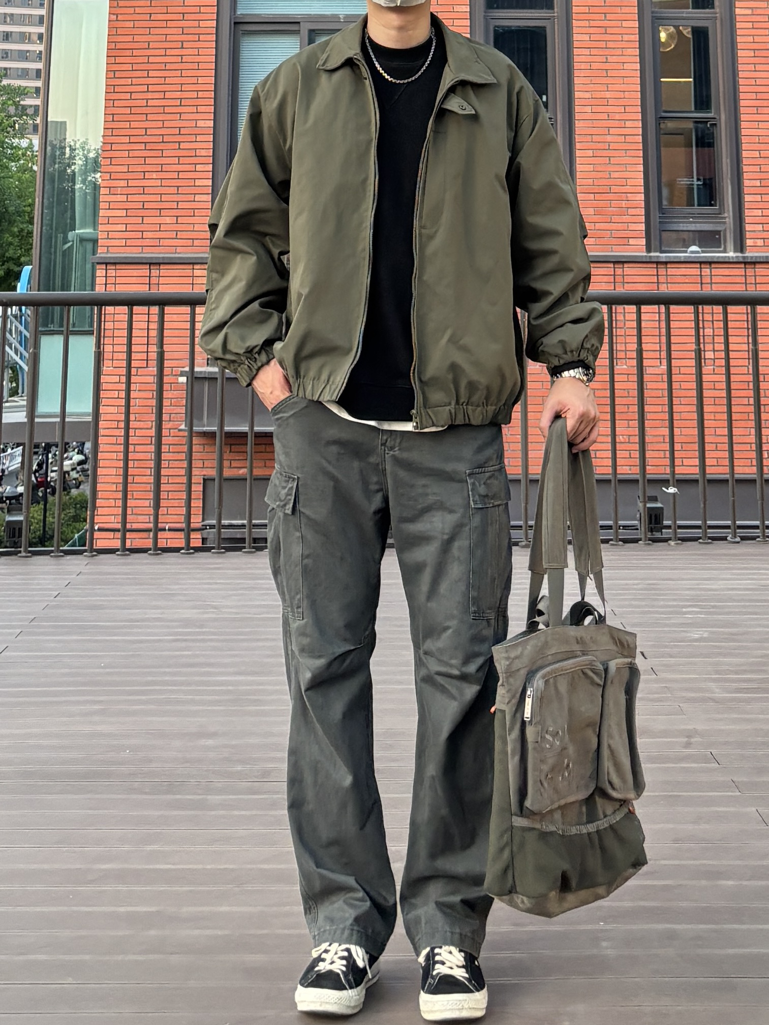 今天选择黑色圆领卫衣搭配绿色阔版飞行夹克,再搭一条深灰色工装裤,最后穿双经典百搭的匡威one star,复古又休闲😎 - 衣服裤子:NICE LILI 鞋子:匡威one star