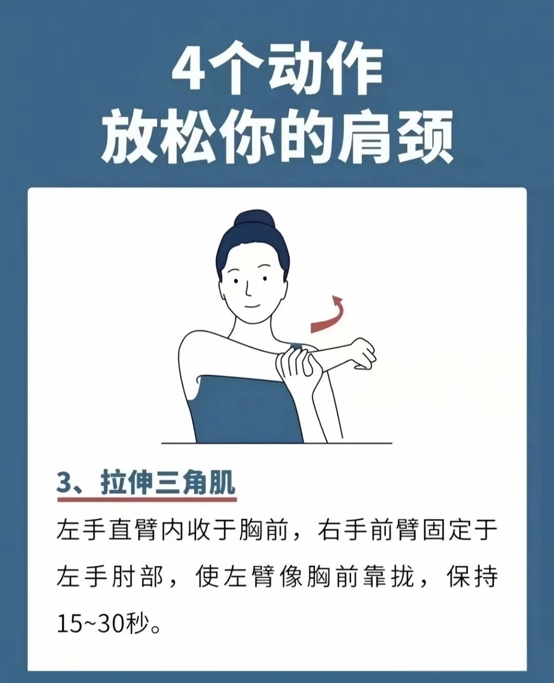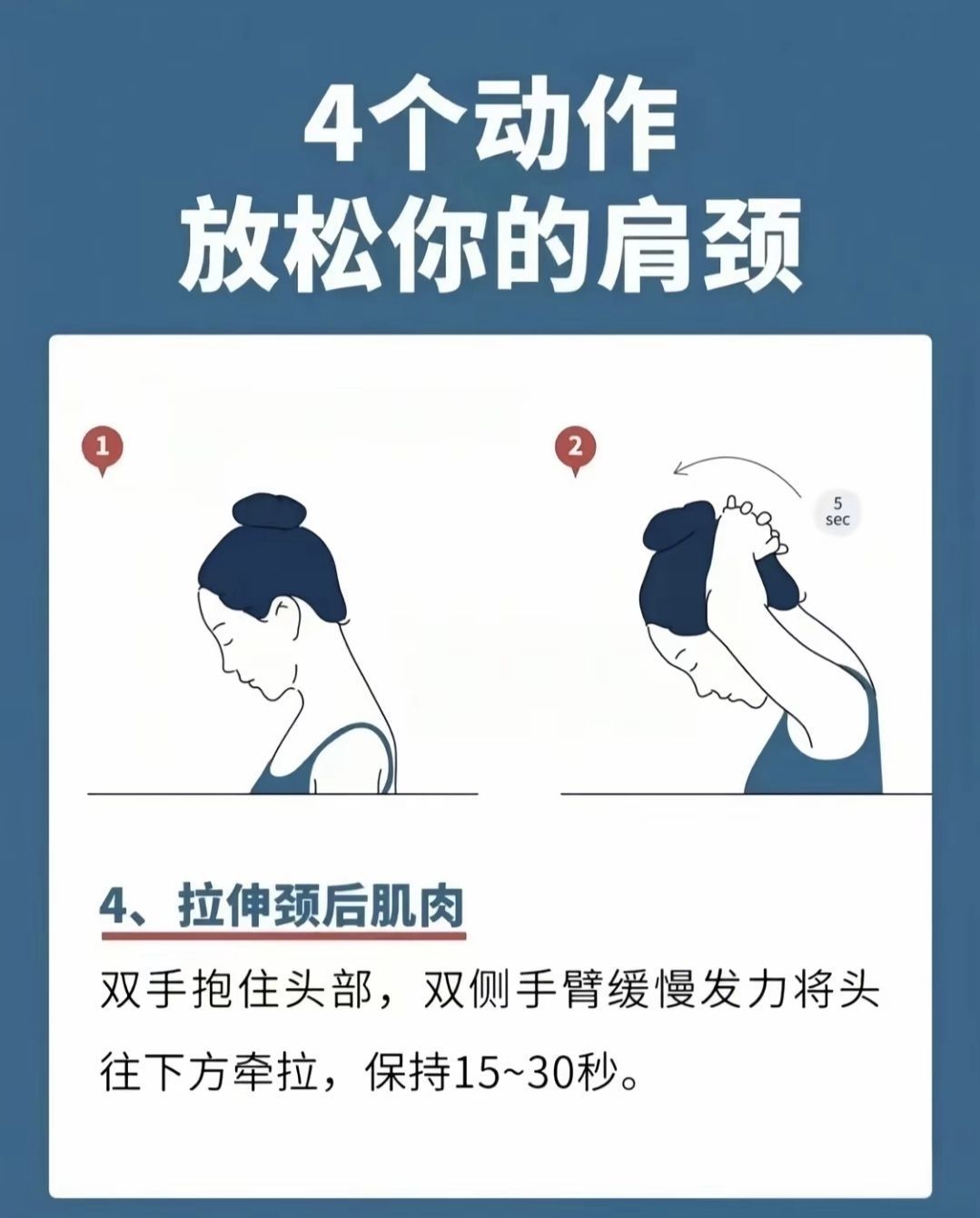 今天给大家带来 4个颈椎拉伸动作 每个动作 作15-20秒 做3组到5组 刚开始从小力度开始 然后慢慢加 如果有严重不适 请您不要 参考请勿随意