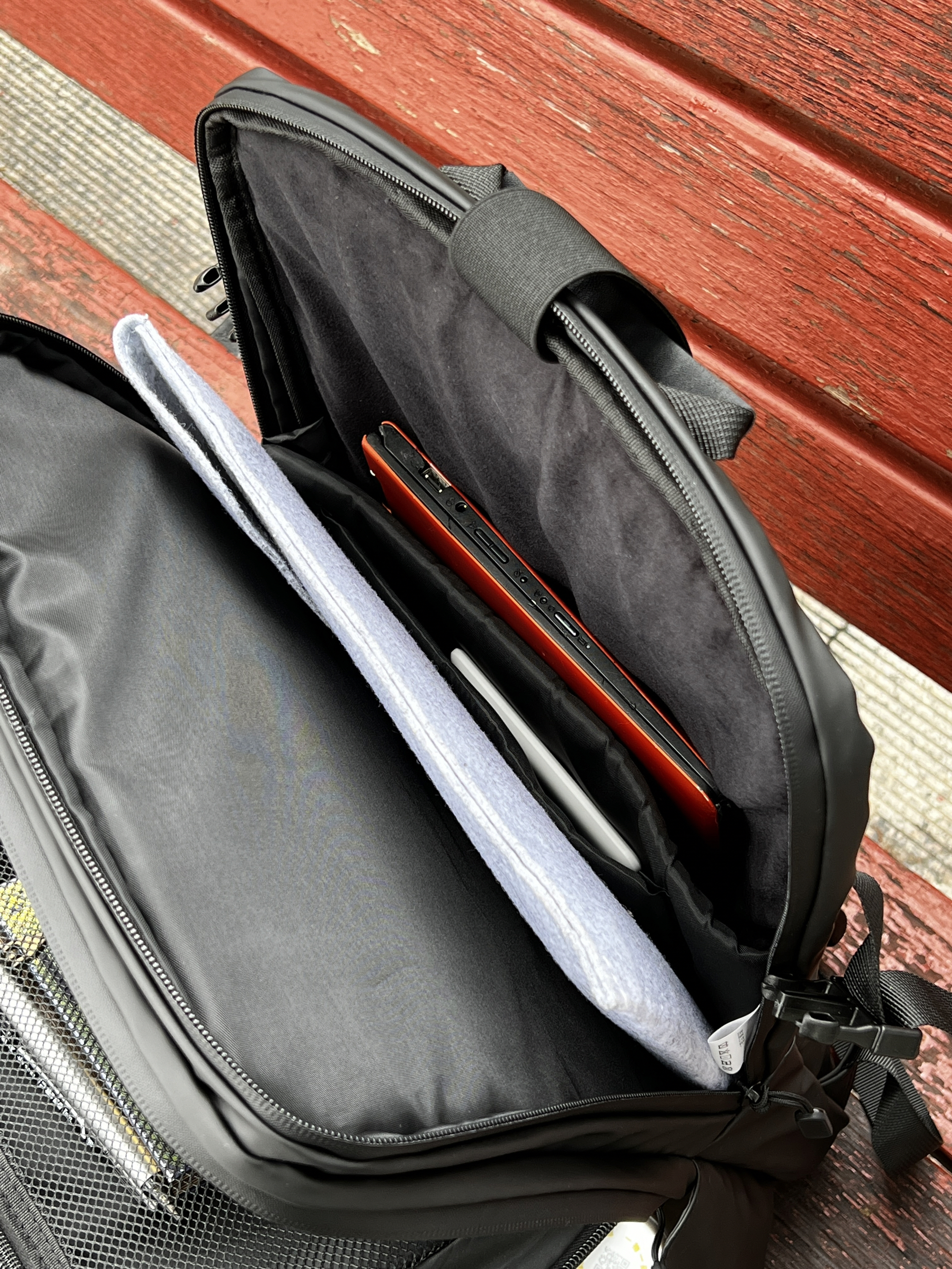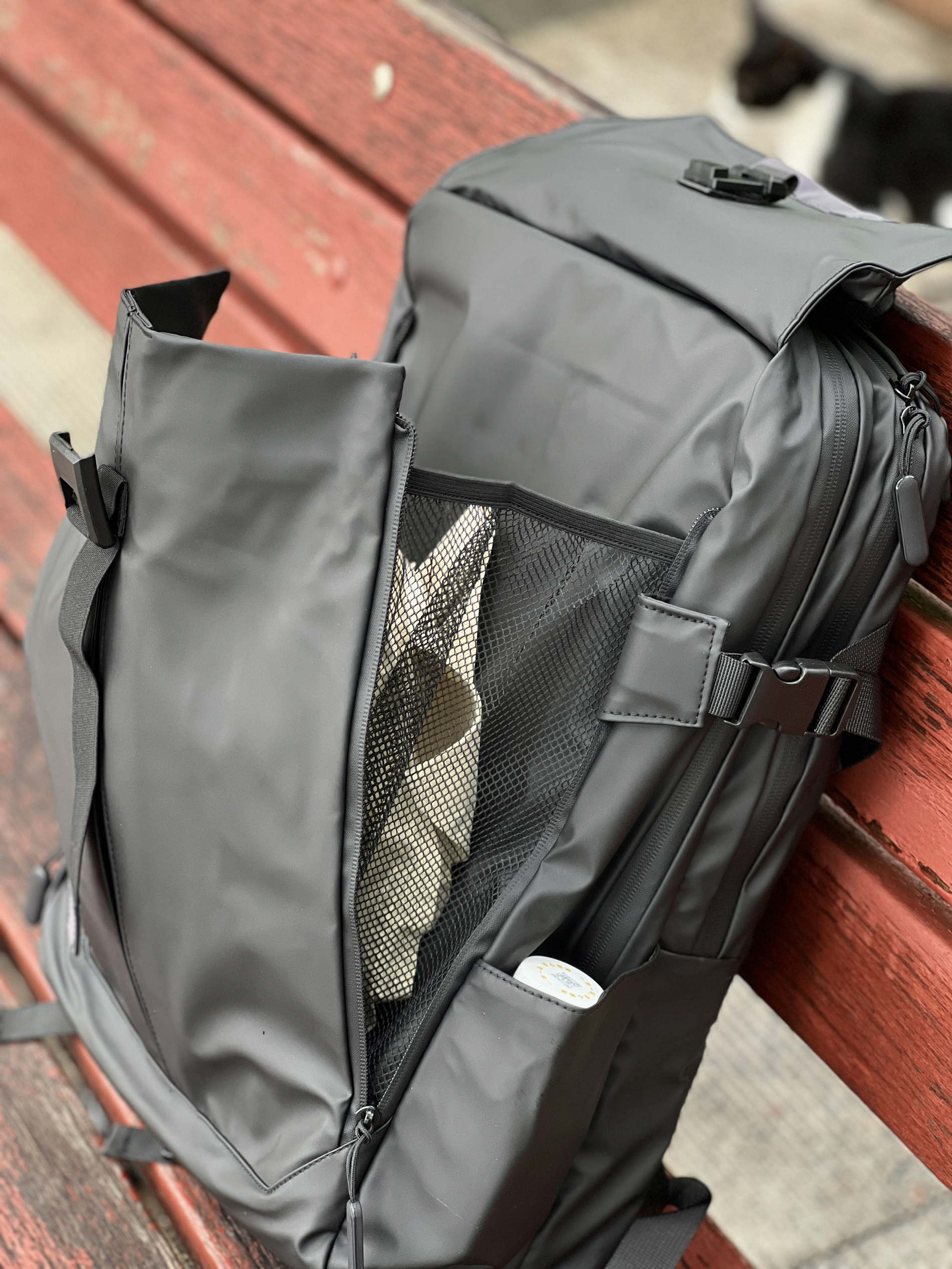最近爱用分享,出去玩、出差经常背这款双肩包🎒整体容量能满足我的使用需求。 做工不错,颜值我也很😍中意。 电脑💻和平板/Kindle都有单独减震位。 最外面的夹层可以扩容,在外面玩🌡️温差大多带一件薄外套,放在这里刚好,包型依然硬挺不拖沓,磁吸扣单手就能操作。 最吸引我的点是,有干湿分离层的设计,太贴心了,下雨多的天气雨伞☔️也能放。