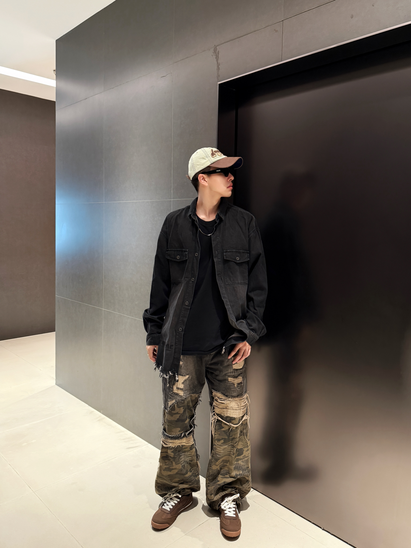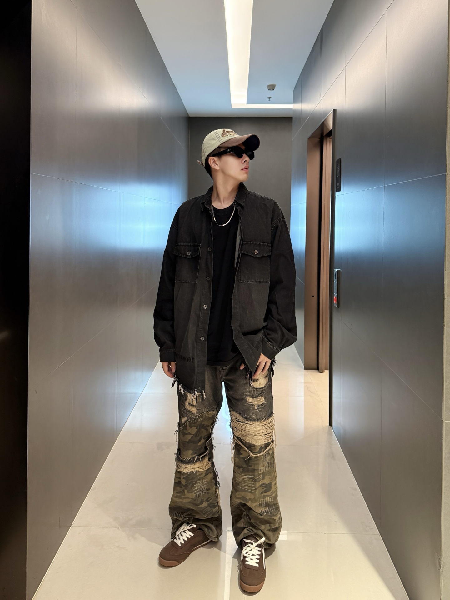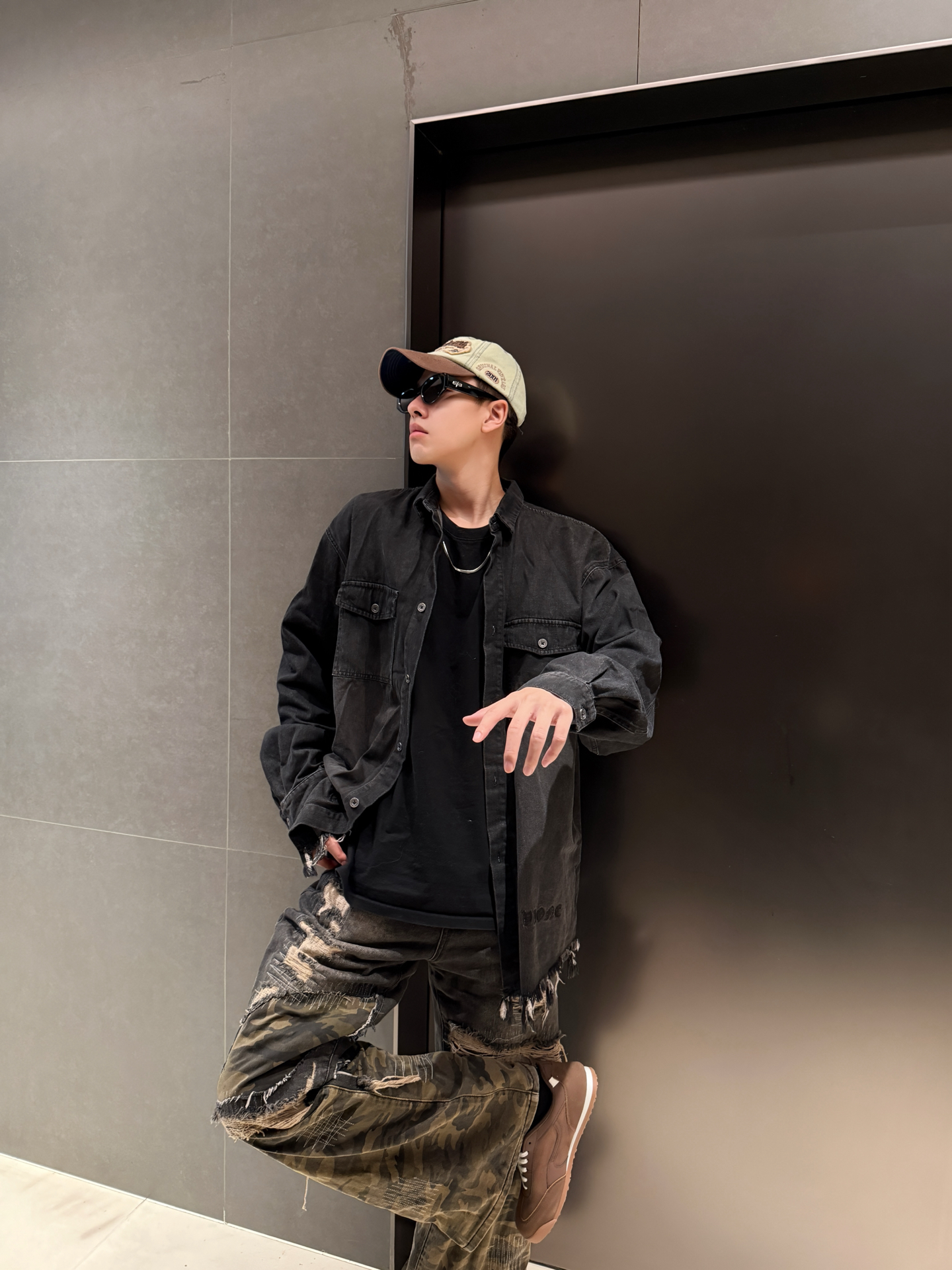 家人们谁懂啊!这套复古风穿搭直接戳中我的心巴💥 做旧黑牛仔衬衫版型巨宽松,美式工装感拉满,内搭黑T+金属项链,层次感这不就来了~ 裤子也是超绝迷彩+破洞+做旧的拼接设计,简直是复古潮人的天菜👍 裤型宽松还显腿长,走在街上回头率直接拉满!脚上这双棕色复古鞋也很绝,来自 #TCELLARS 的设计和整体风格完美呼应,复古感瞬间拉满~ #Tcellars #预热一下秋冬穿搭 #请把这双鞋焊在脚上 ...