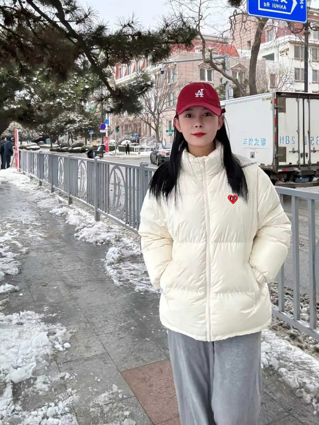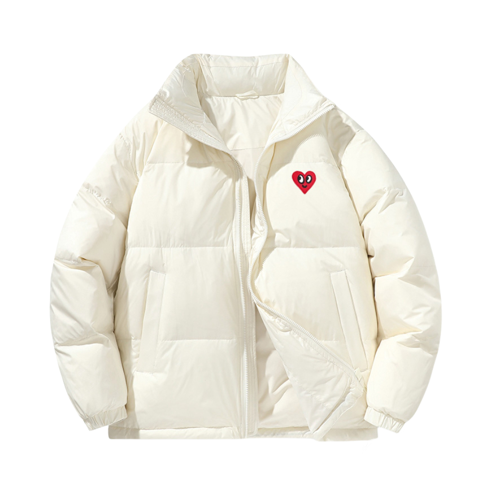 查尔斯桃心立领款,90 白鸭绒填充保暖性拉满,早上套上就能冲去教室,冷风完全吹不透~ 米白底色显干净,随便配条运动裤、直筒裤都好看,胸口小桃心 logo 是隐藏亮点,上课不张扬,放学约饭又有记忆点✨