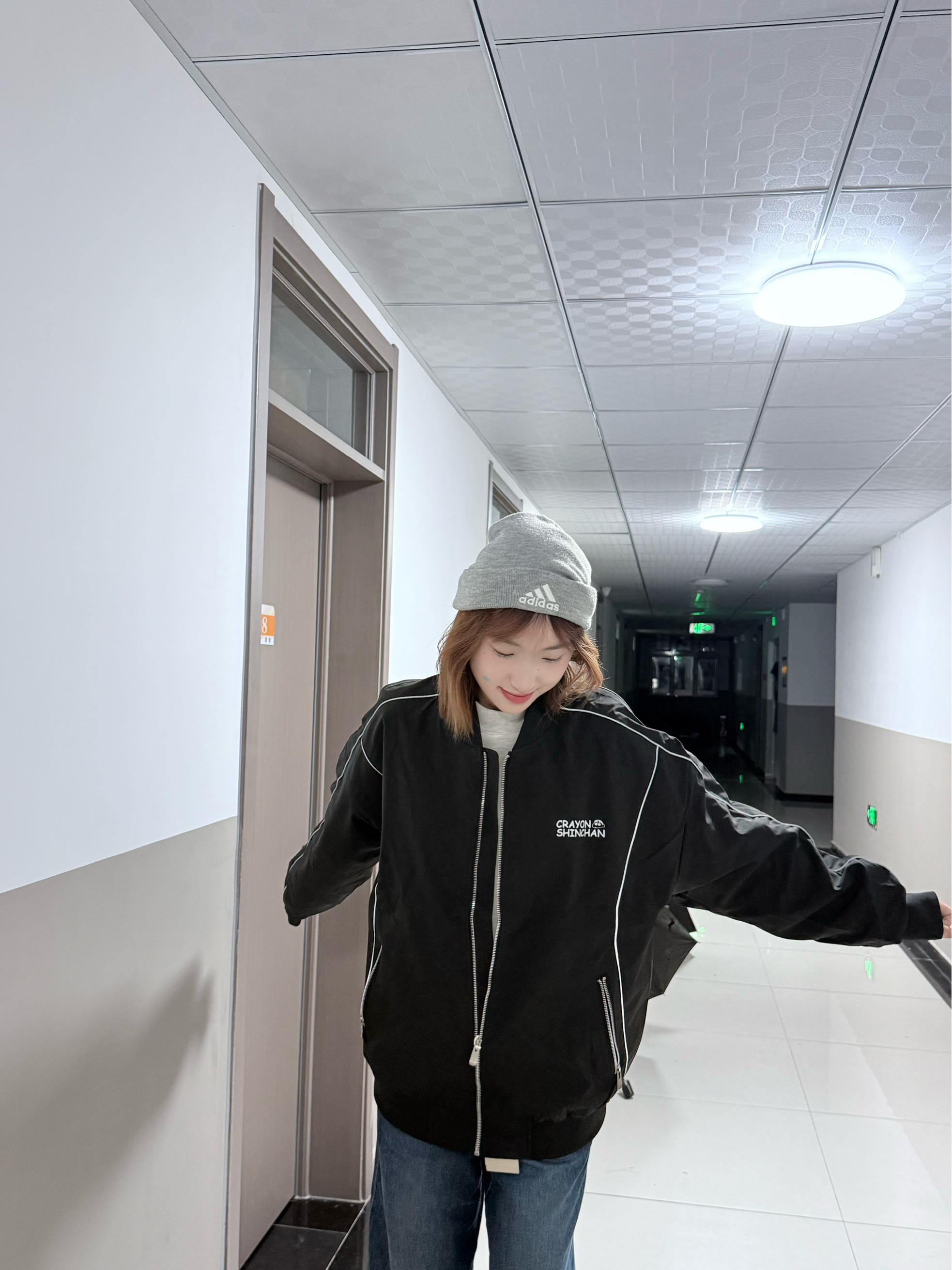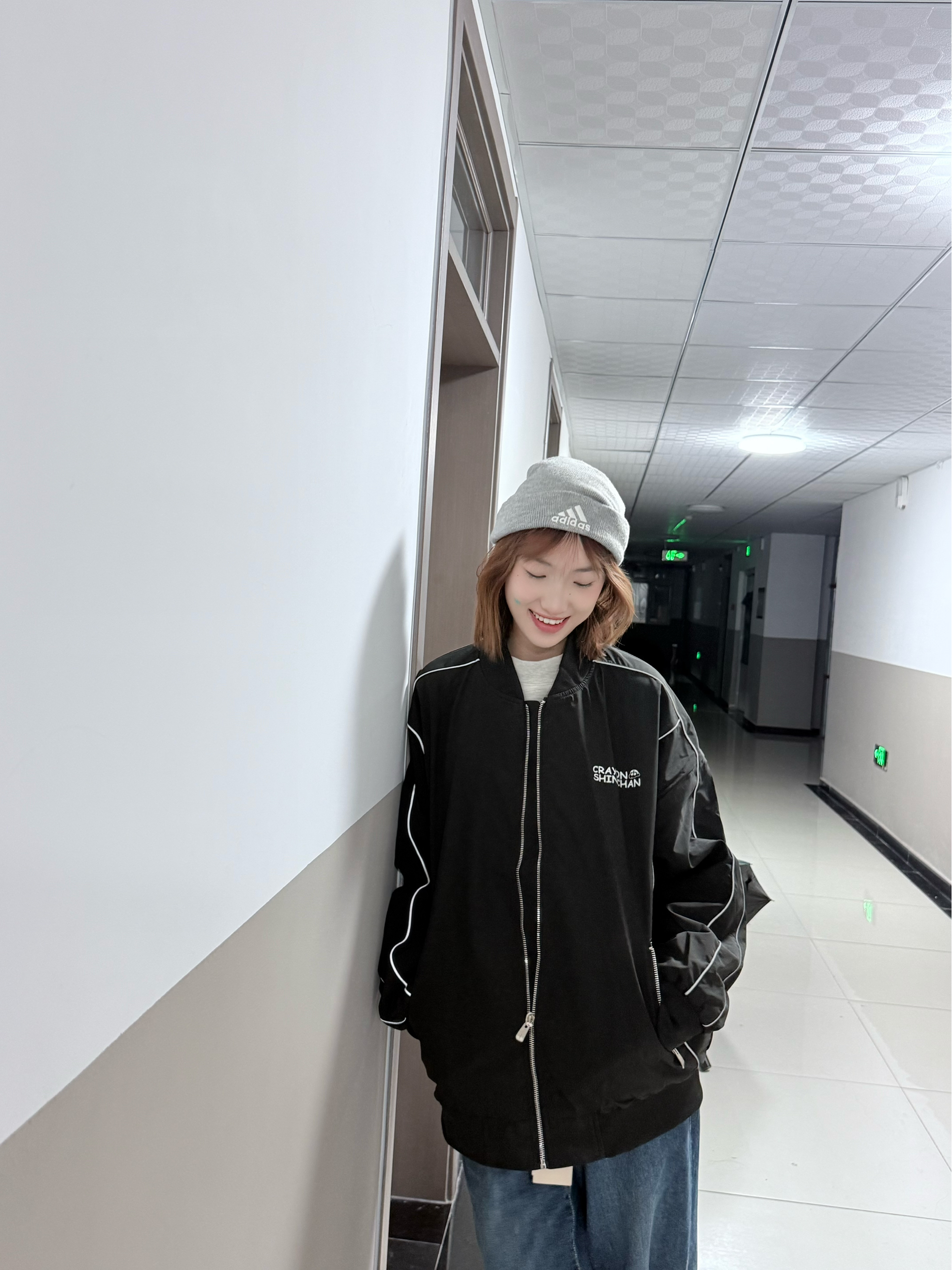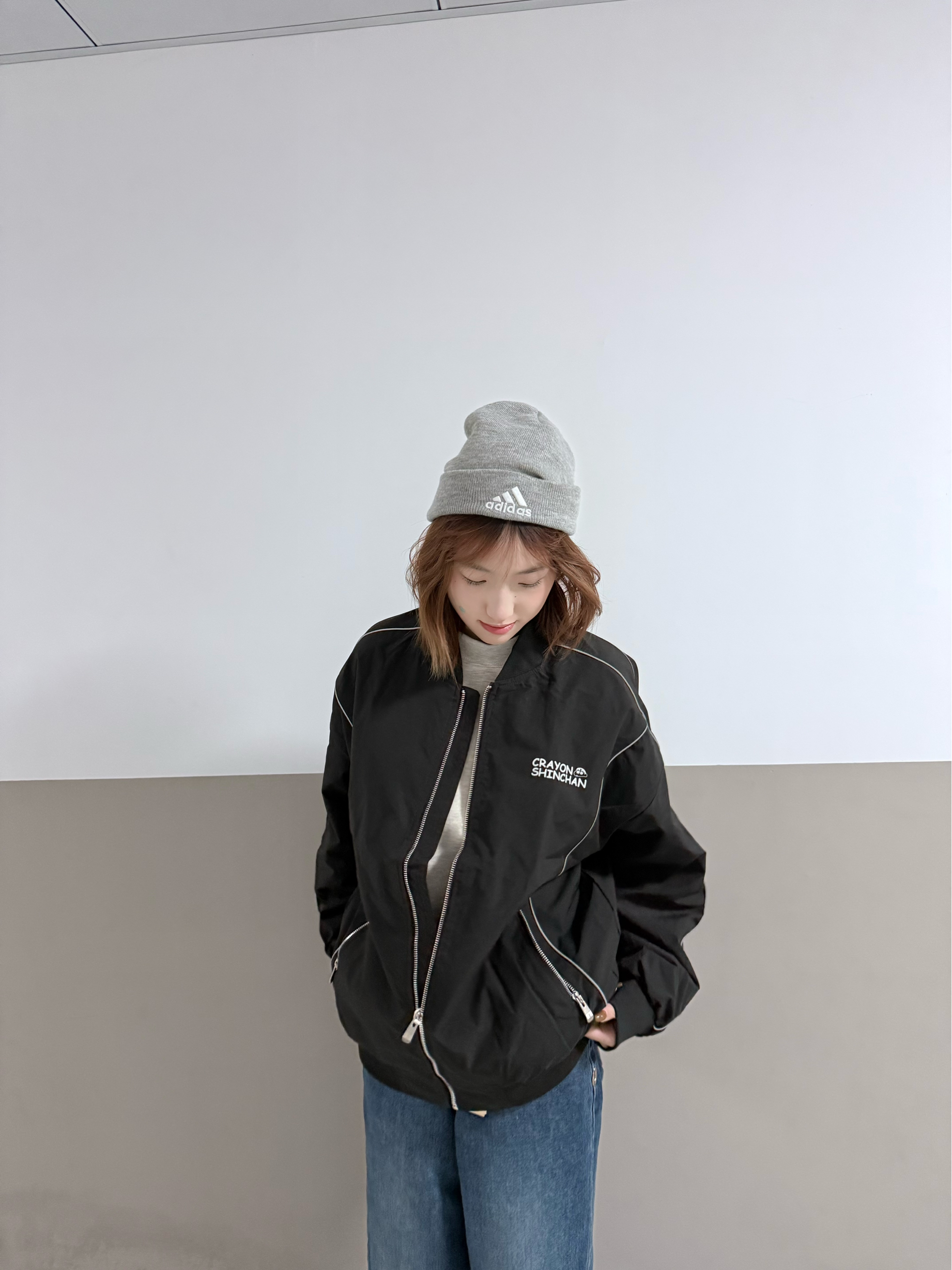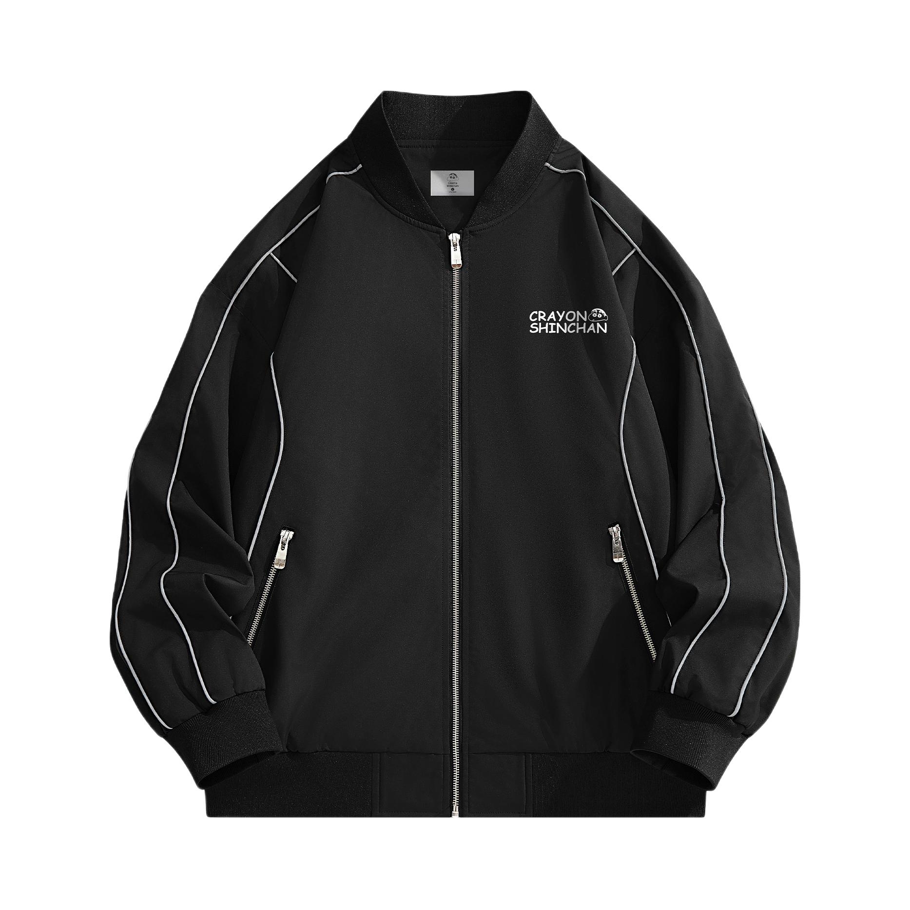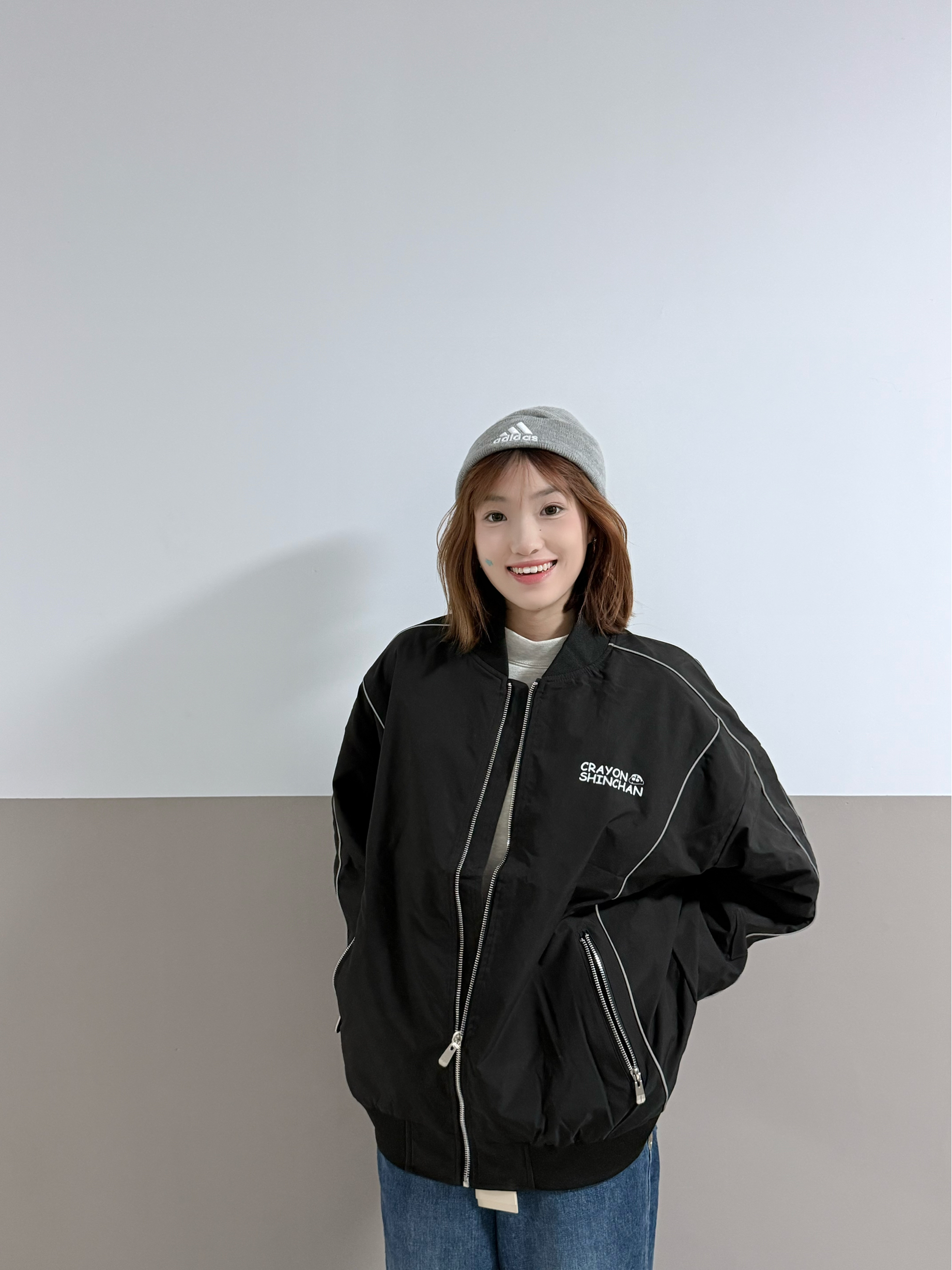 👕 Crayon Shinchan蜡笔小新拼接反光条纹简约卡通字母印花休闲宽松棒球领夹克外套男女同款 🧢adidas 品牌徽标字母 - 帽子 男女同款情侣款 浅灰色