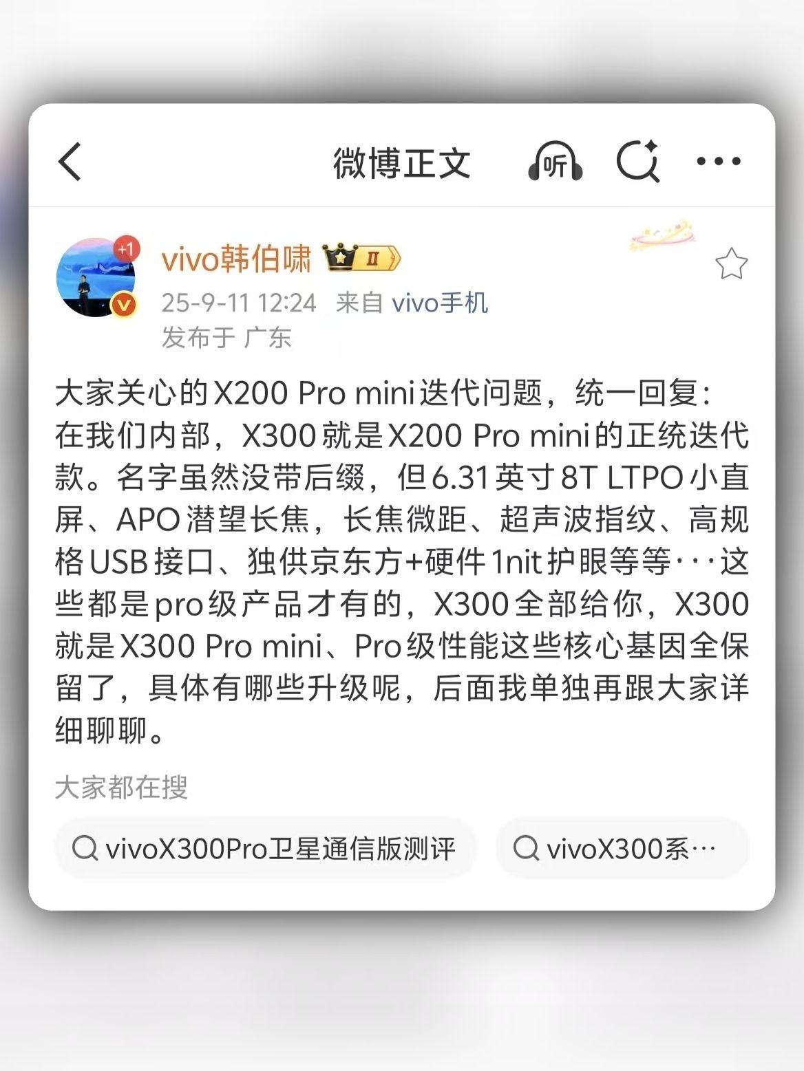 没对比没伤害,竟然vivo X300实际是X300 Pro mini,定价大概为4699起售 伴随着昨天10月10日vivo全新系统OriginOS 6的正式发布,今天vivo韩伯啸继续爆料实锤肯定了「X300就是X200 Pro mini的正统迭代款」。 与此同时,再对比现在市面上四款主流小屏旗舰可知:X300更方面参数标准都十分的优秀,妥妥拥有Pro级产品体验。 另外,再细致对比上一代X200...