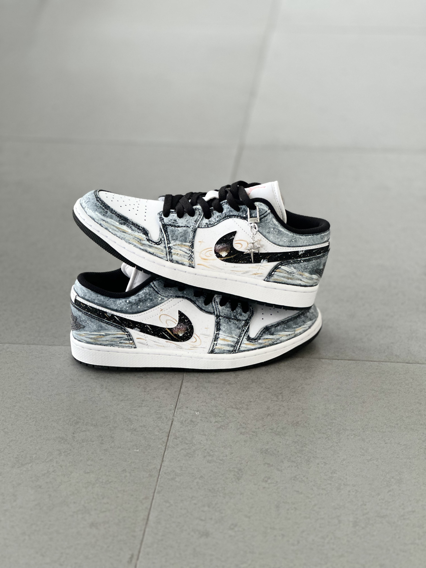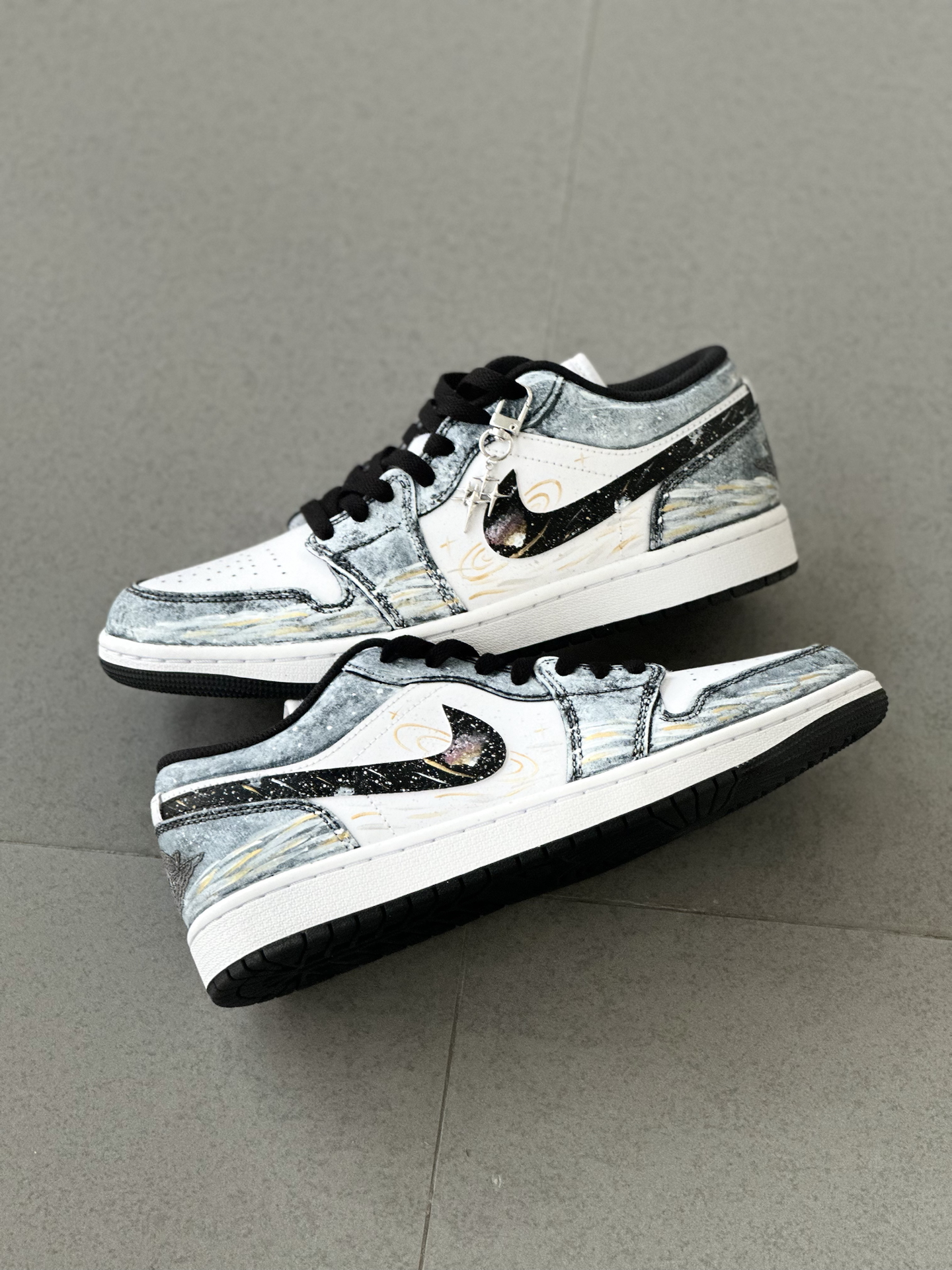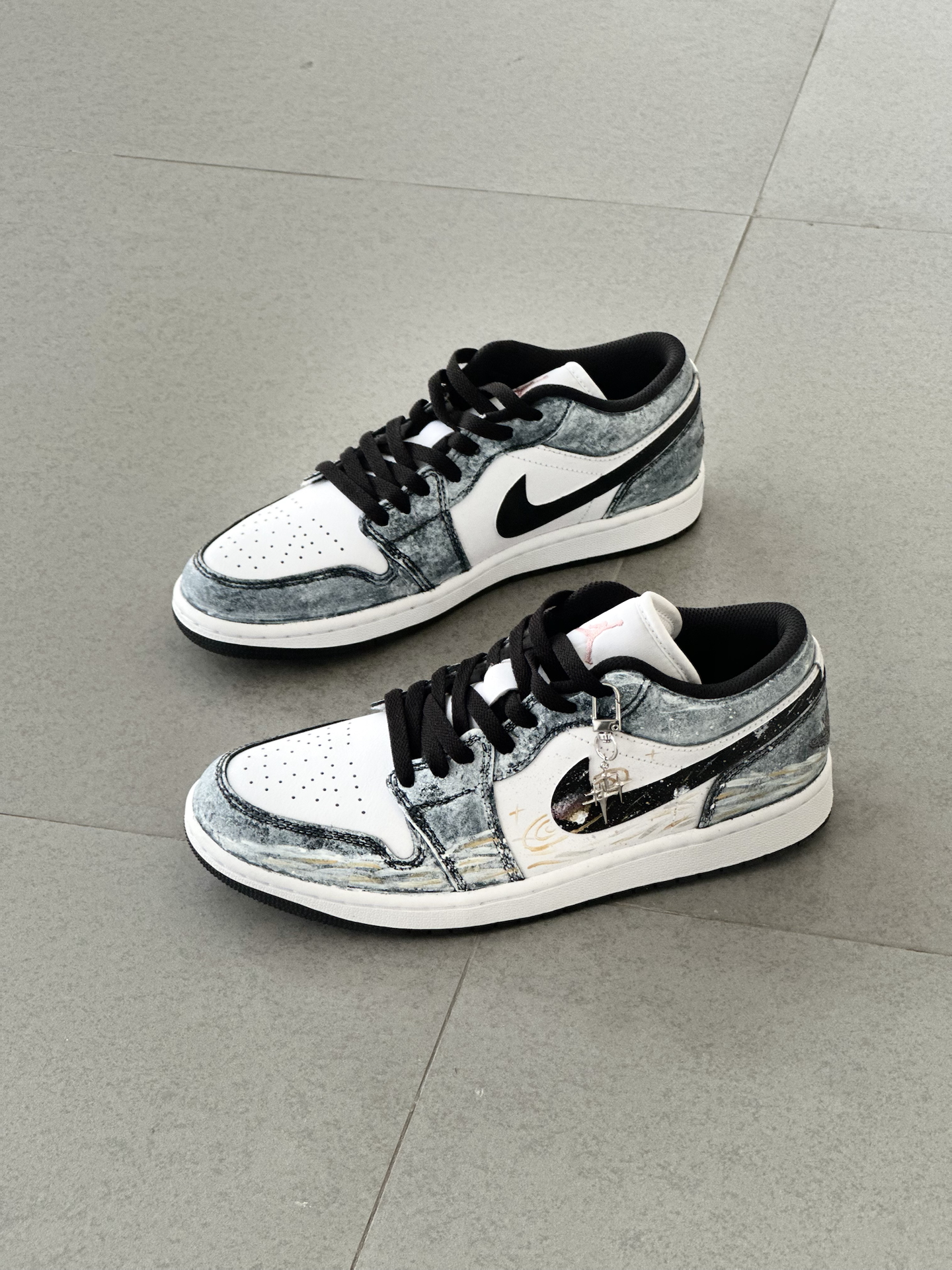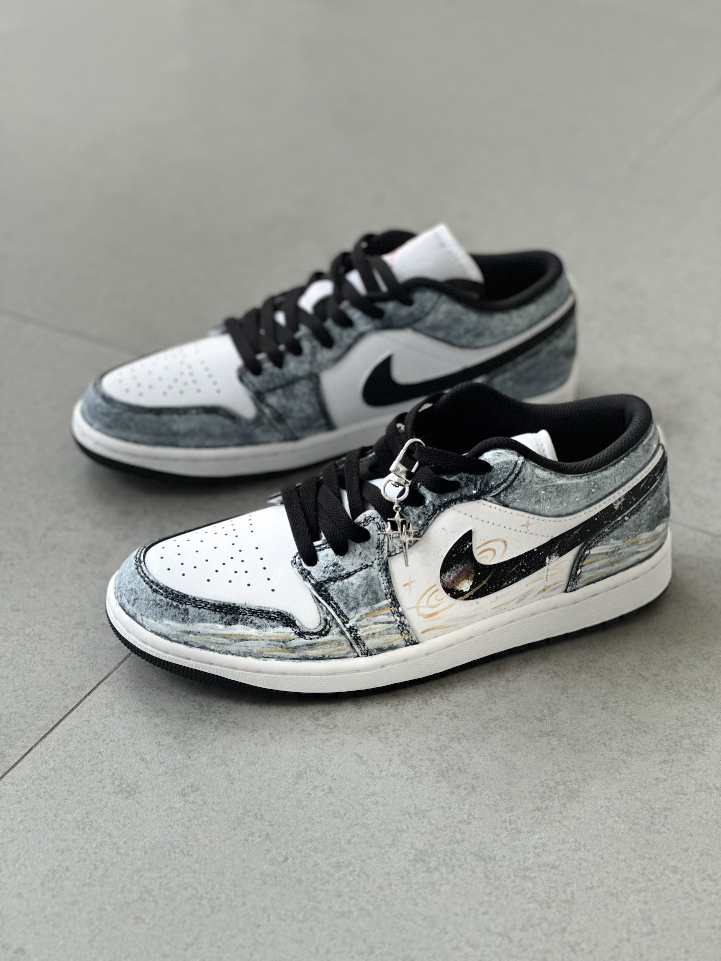 👟:【定制球鞋】Jordan Air Jordan 1 Low “星海漫步” 低帮复古板鞋 男女同款 黑白金 Hello,这里是Sam爱球鞋!今天给大家分享一款梦幻感拉满的定制AJ1板鞋 整双鞋就像把梵高的《星月夜》穿在了脚上,深邃的丹宁蓝💙鞋面搭配细腻的白金双色泼墨,仿佛将整片星空银河洒落在鞋面。独特的晕染笔触勾勒出星云的层次感,鞋带处悬挂的星星✨挂饰更添浪漫气息。 对于日常通勤穿搭来说,...