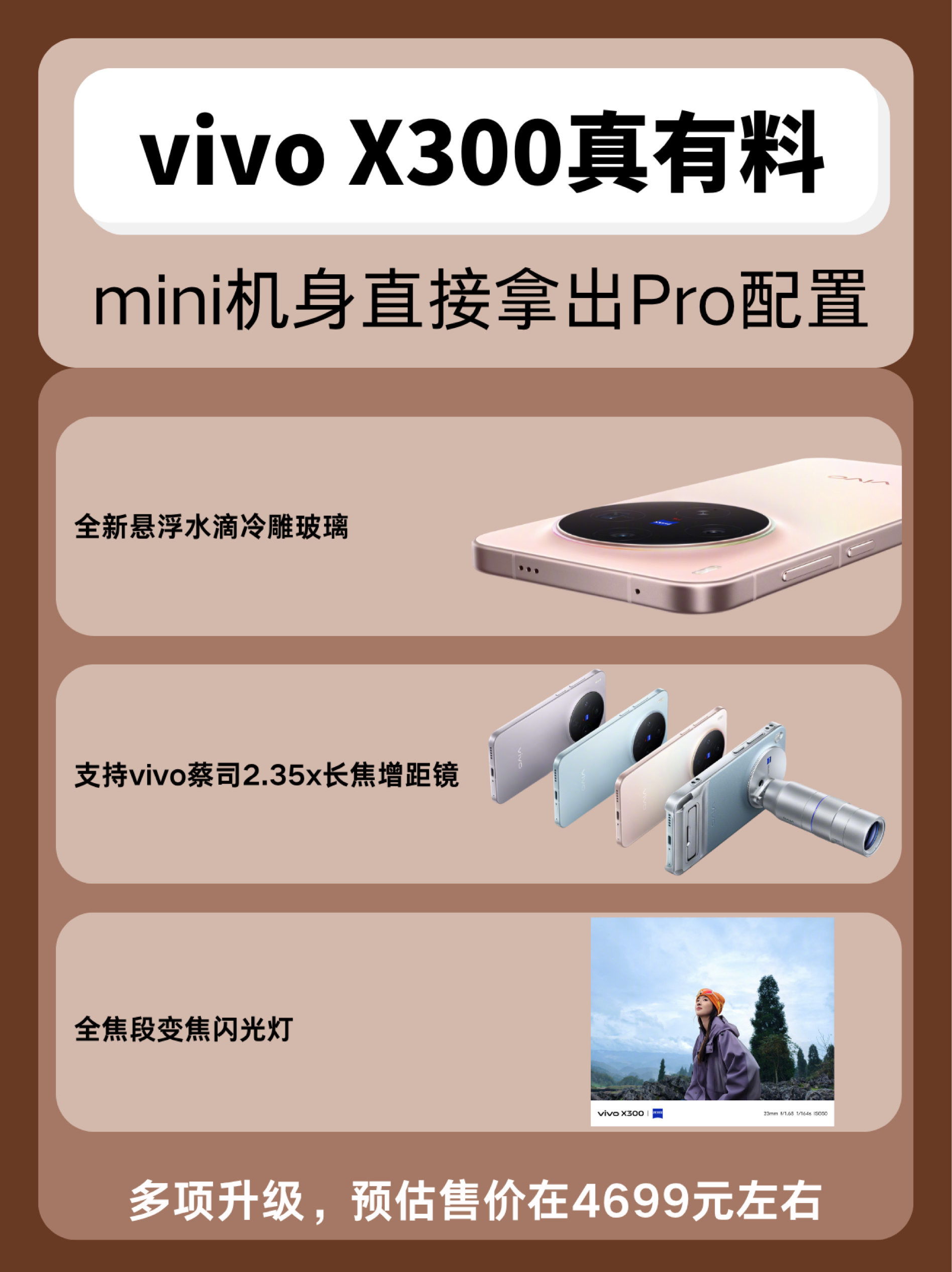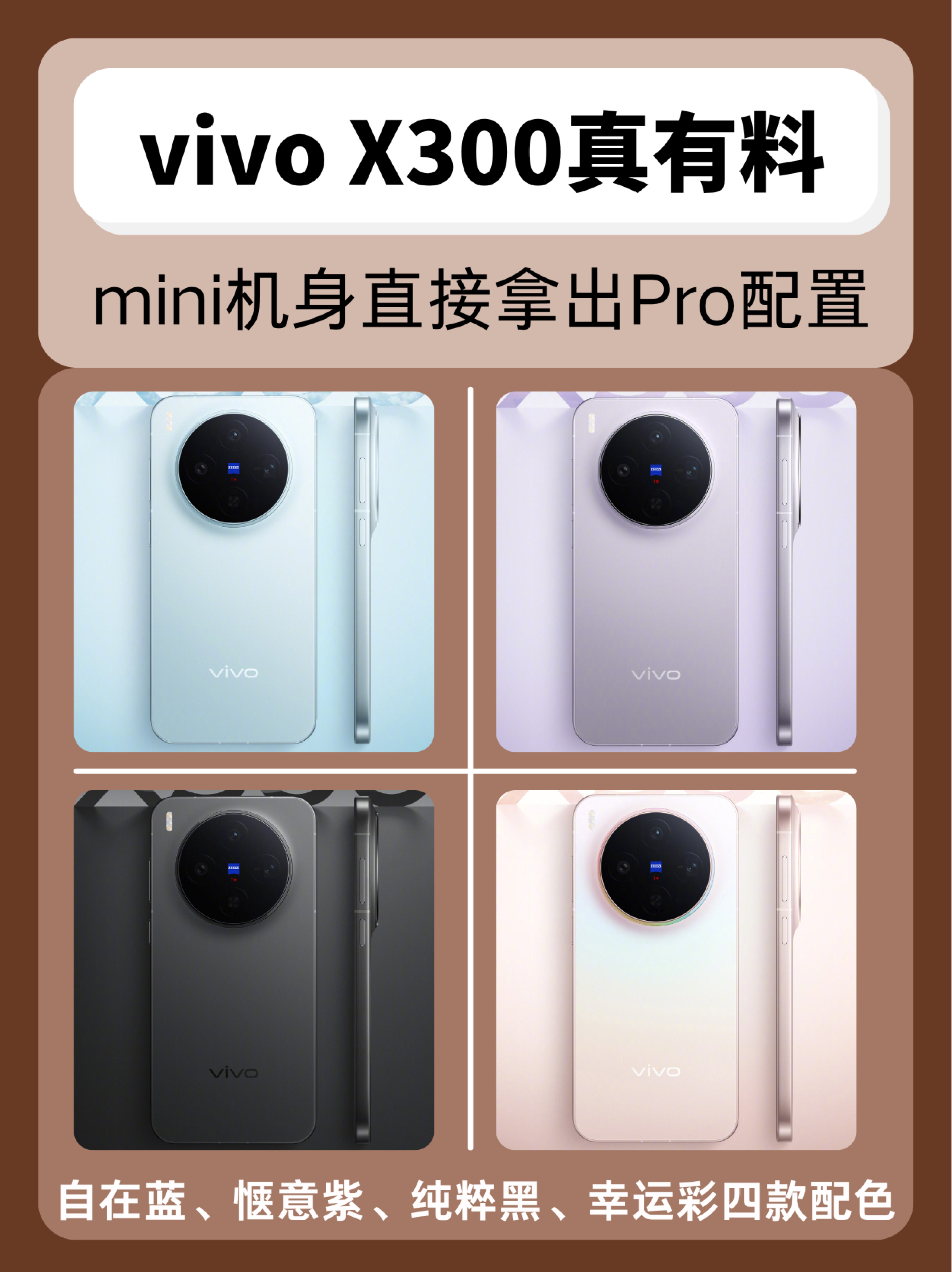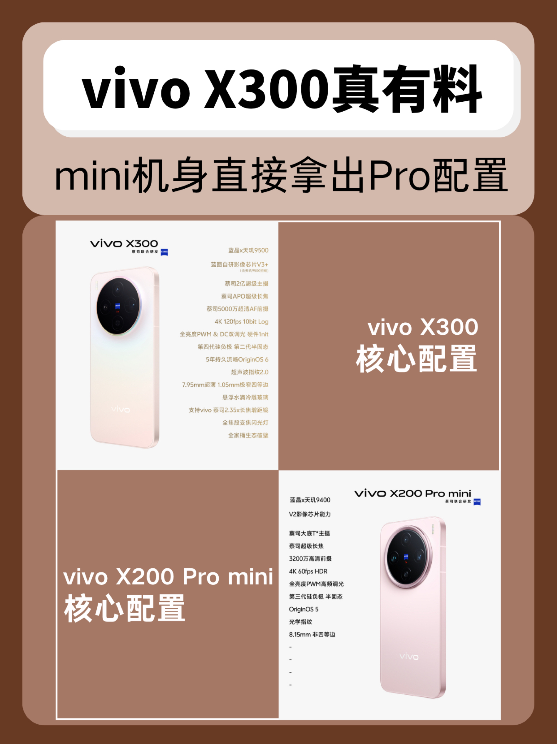 谁说标准版不能做点Pro级体验! 最近研究了下vivo X300,一直觉得它更像是上代Pro mini的延续,配置超有料! 果然,vivo产品副总裁黄韬摊牌了,X300就是X300 Pro mini 具体来看 📷X300有定制款2亿像素HPB传感器、V3+影像芯片、长焦增距镜、变焦闪光灯,其中高像素意味着高清晰度,能还原更多细节,影像芯片和增距镜则增加了出片率,拍照已经摸到了Pro的门槛,...