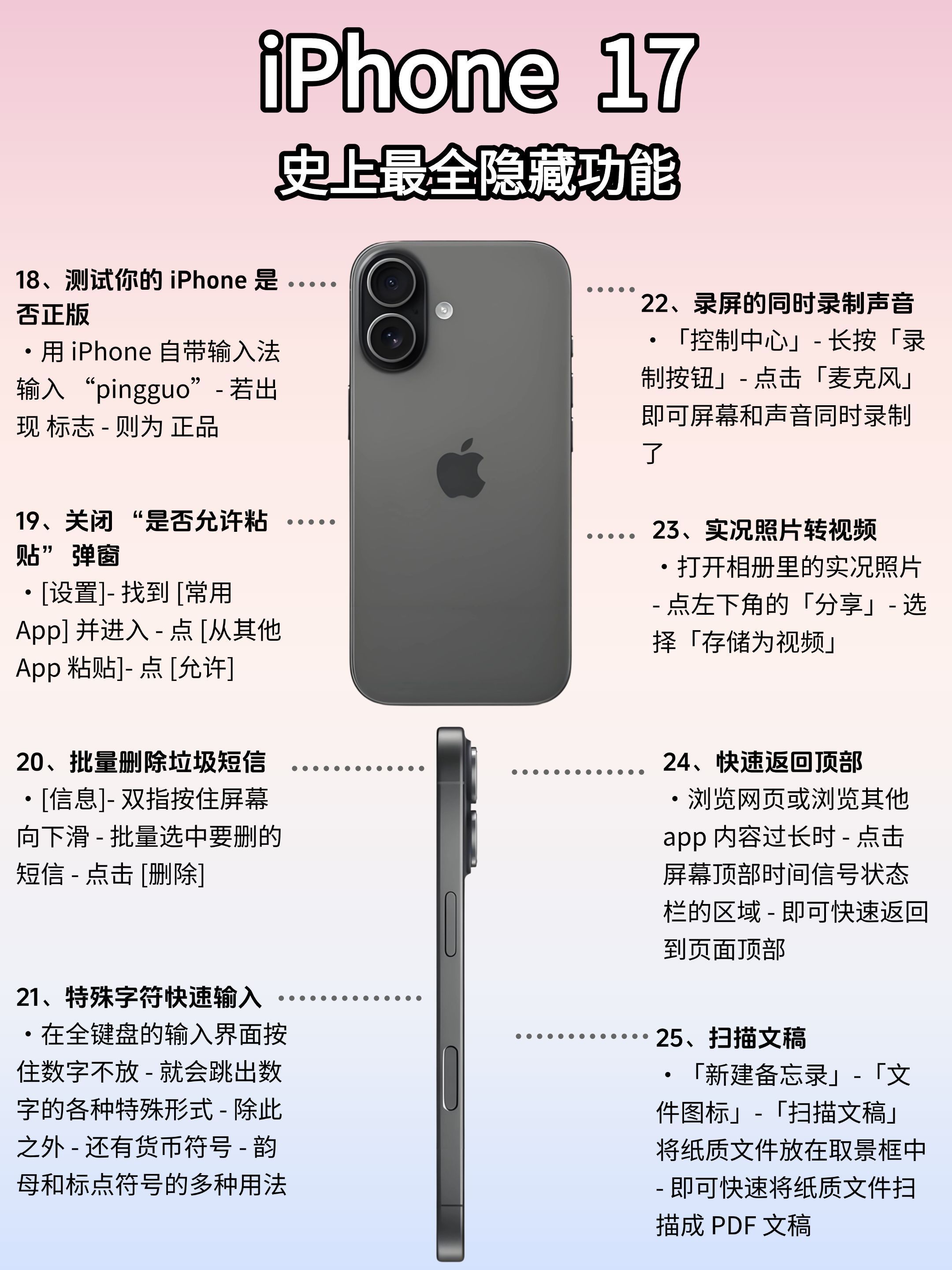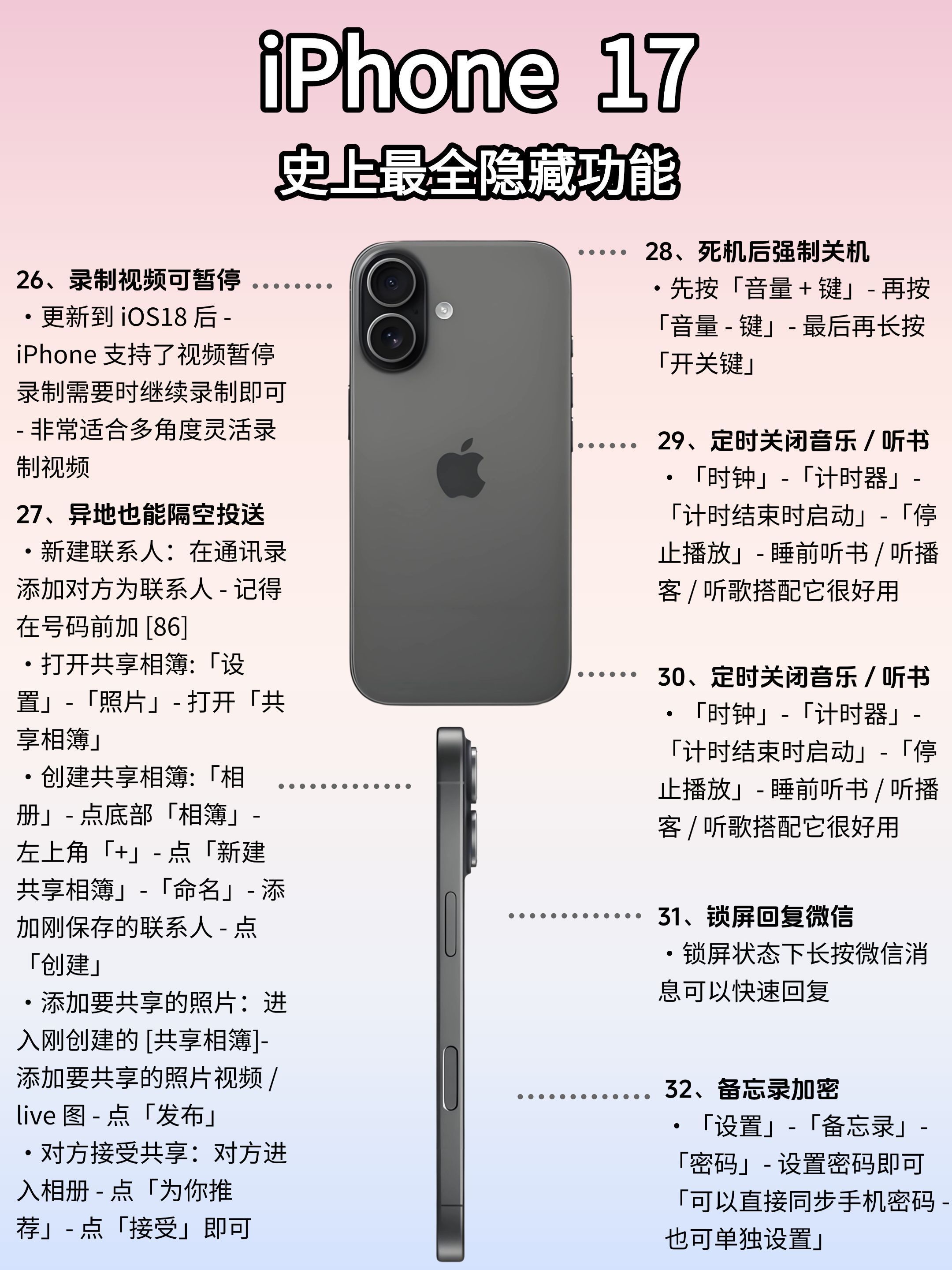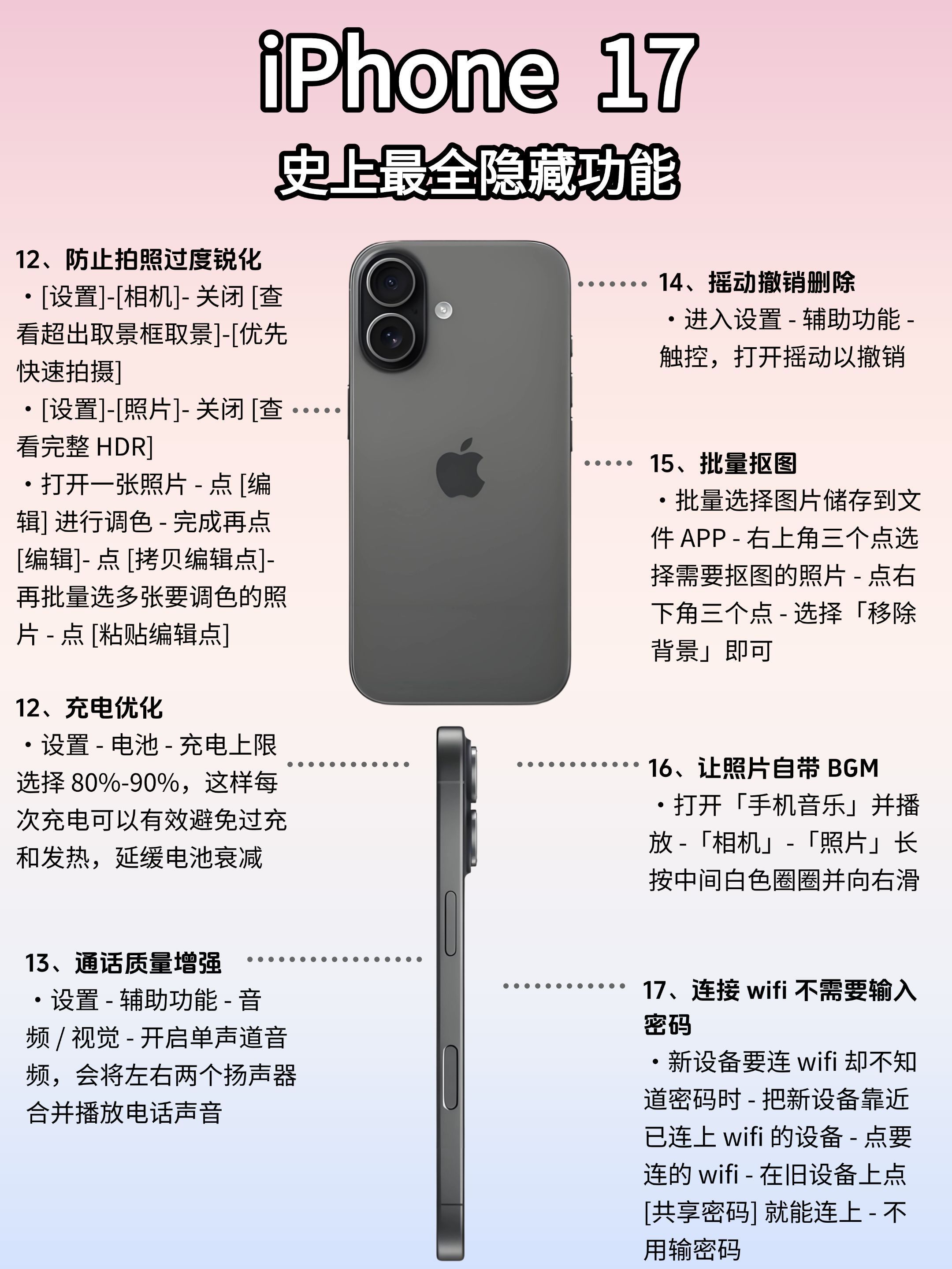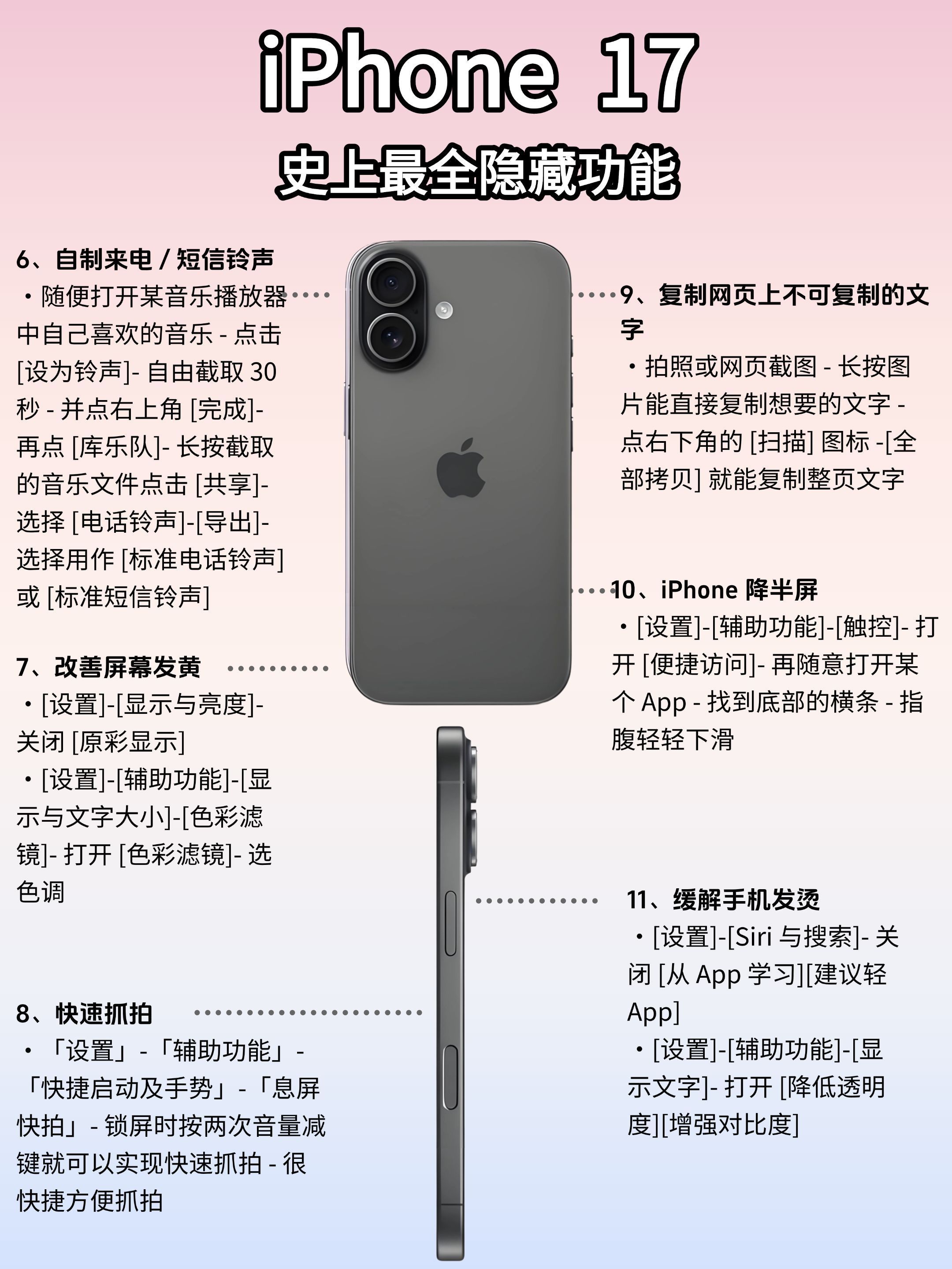 📱小白必码‼️iPhone17隐藏功能全解析(附保姆级攻略) 宝子们!今年iPhone17的升级真的杀疯了‼️ 想换机的姐妹看过来——除了颜值能打,这波隐藏功能才是真·王炸!从新手入门到进阶玩家,一篇给你扒明白,看完直接解锁手机使用新姿势🔥 💡手残党也能秒变操作大神! 这次新增的「智能场景模式」能根据使用习惯自动调校设置,刷社交/打游戏/办公文档自动切最优显示方案;「跨应用快捷指令」更是效率王者,...