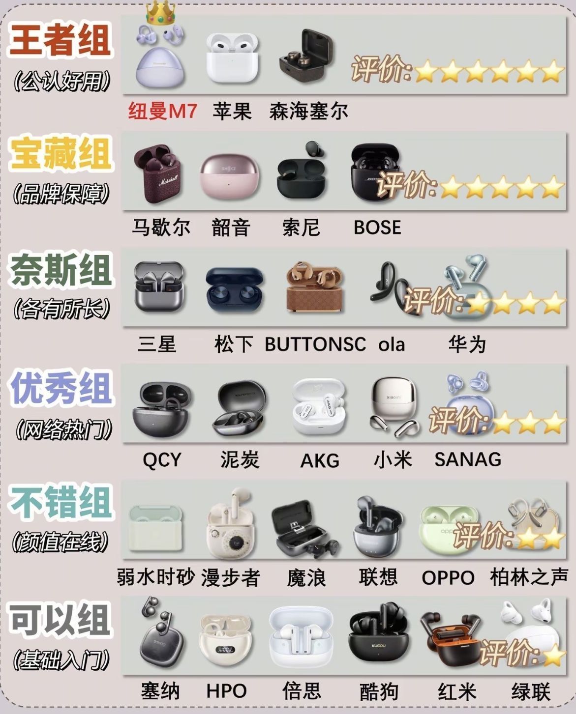 无线耳机选购图鉴:从王者到入门,总有一款适合你 想入手无线耳机却被琳琅满目的型号搞晕?这张「耳机梯队图鉴」帮你快速锁定目标! 🔝 王者组(公认好用,闭眼入不踩雷) 以纽曼M7、苹果AirPods、森海塞尔为代表,综合音质、佩戴舒适度、续航能力等维度登顶“全能王者”,预算充足且追求极致体验的玩家可优先选择。 ✨ 宝藏组(品牌硬实力,品质兜底) 马歇尔、韶音、索尼、BOSE四大品牌...