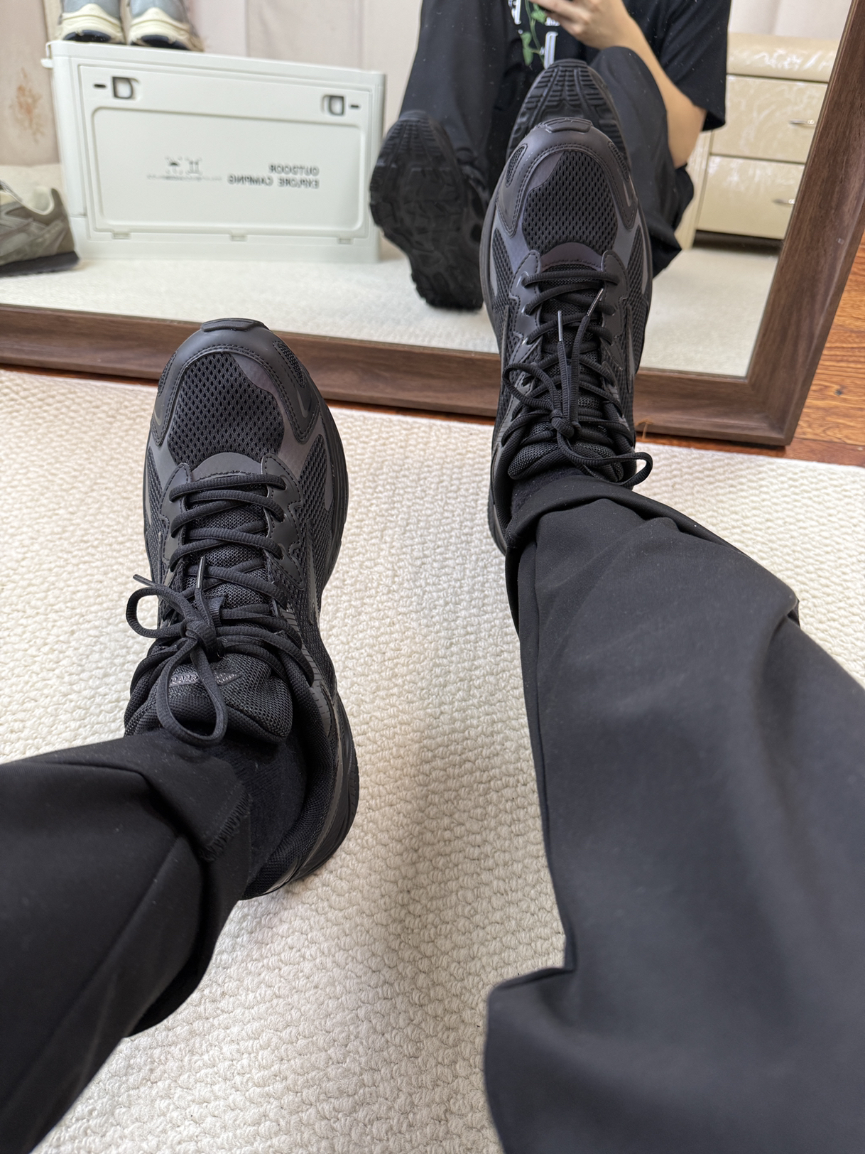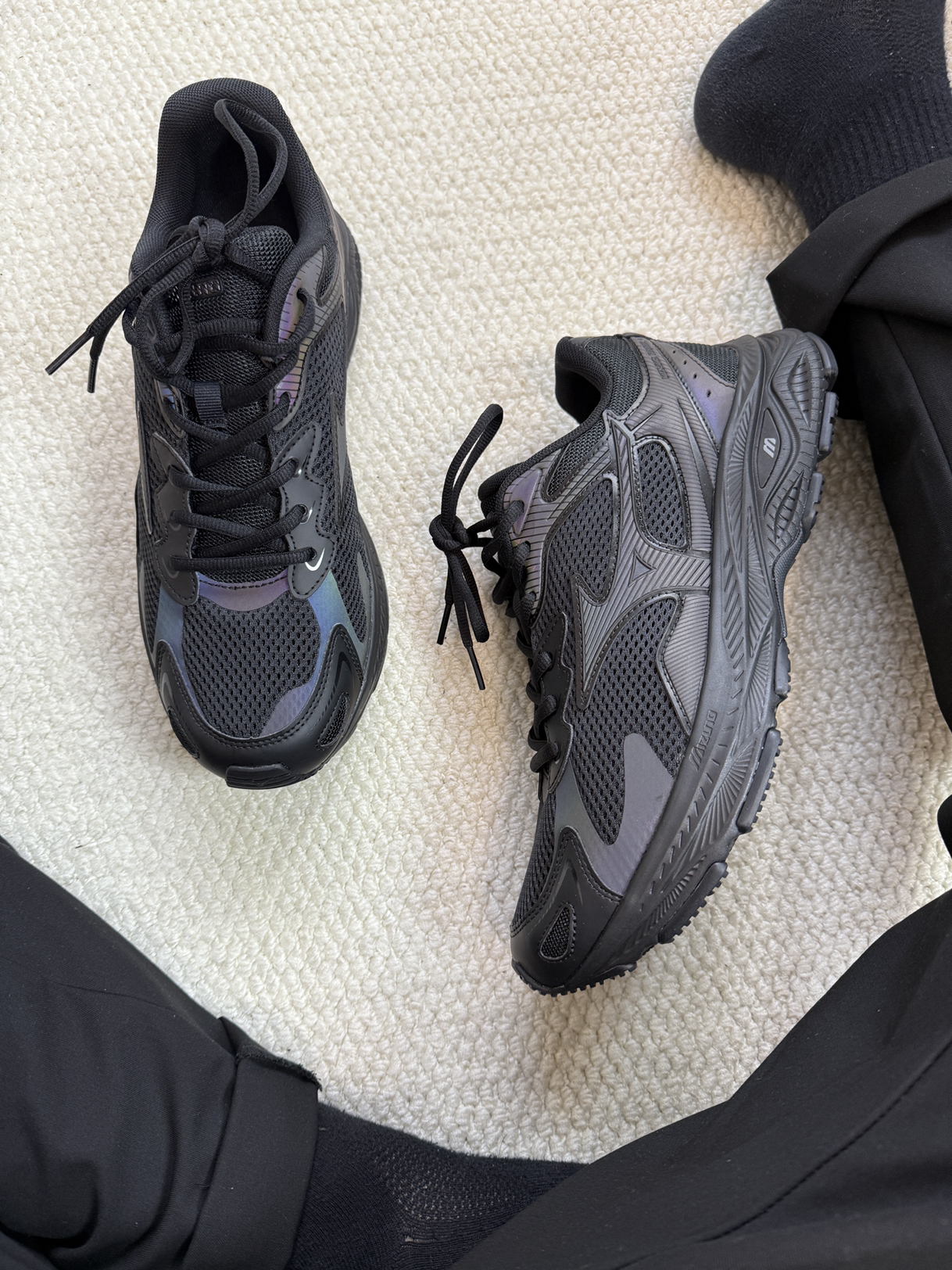 真的一双好看的鞋子会发光啊,这双美津浓的黑色鞋子会发光,而且脚感特别明显,走路踩屎感明显!黑色的鞋子百搭又好看,真的非常不错!