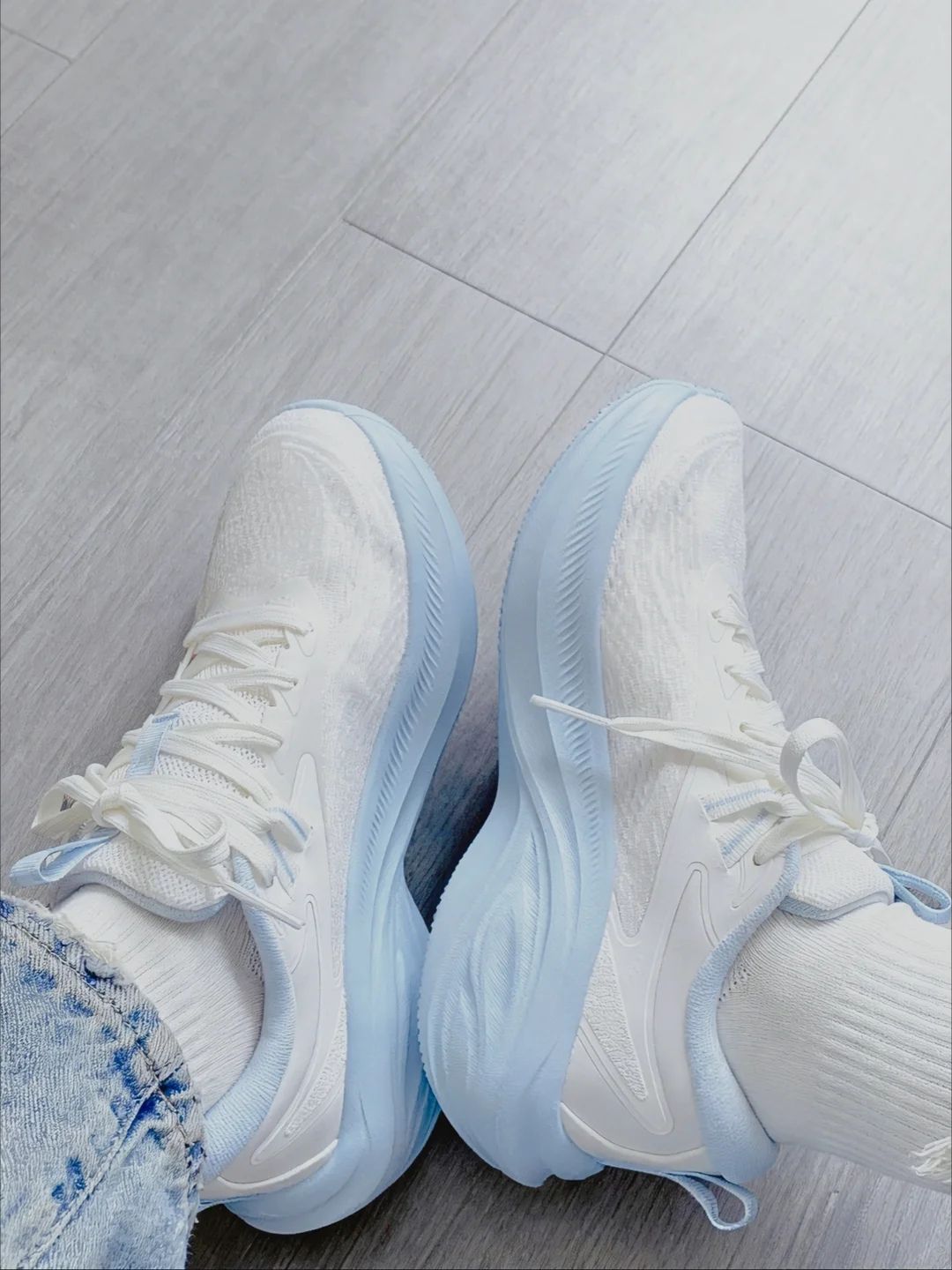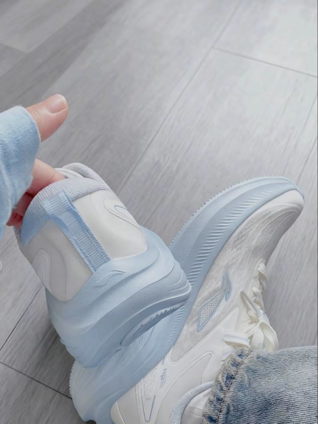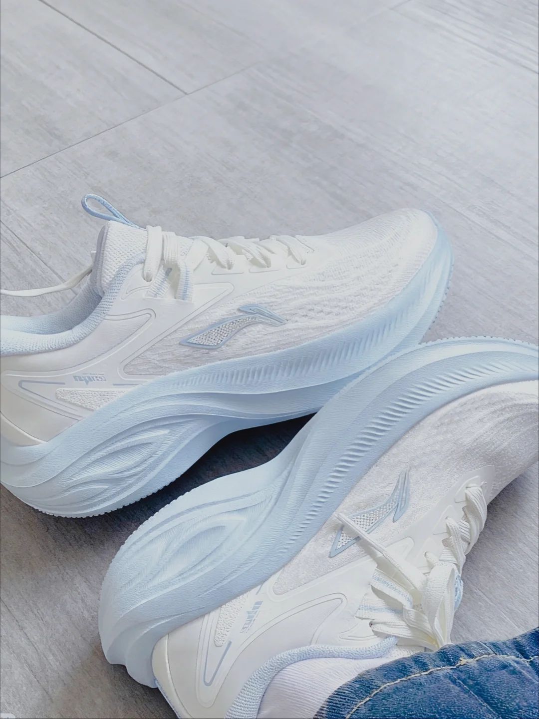 我尊嘟太爱这双李宁的浅蓝色运动鞋了~ 白色和浅蓝色的搭配 看起来很温柔诶 而且穿在脚上也很舒服 不怎么闷 这个鞋也比较轻 跑起来也不累脚