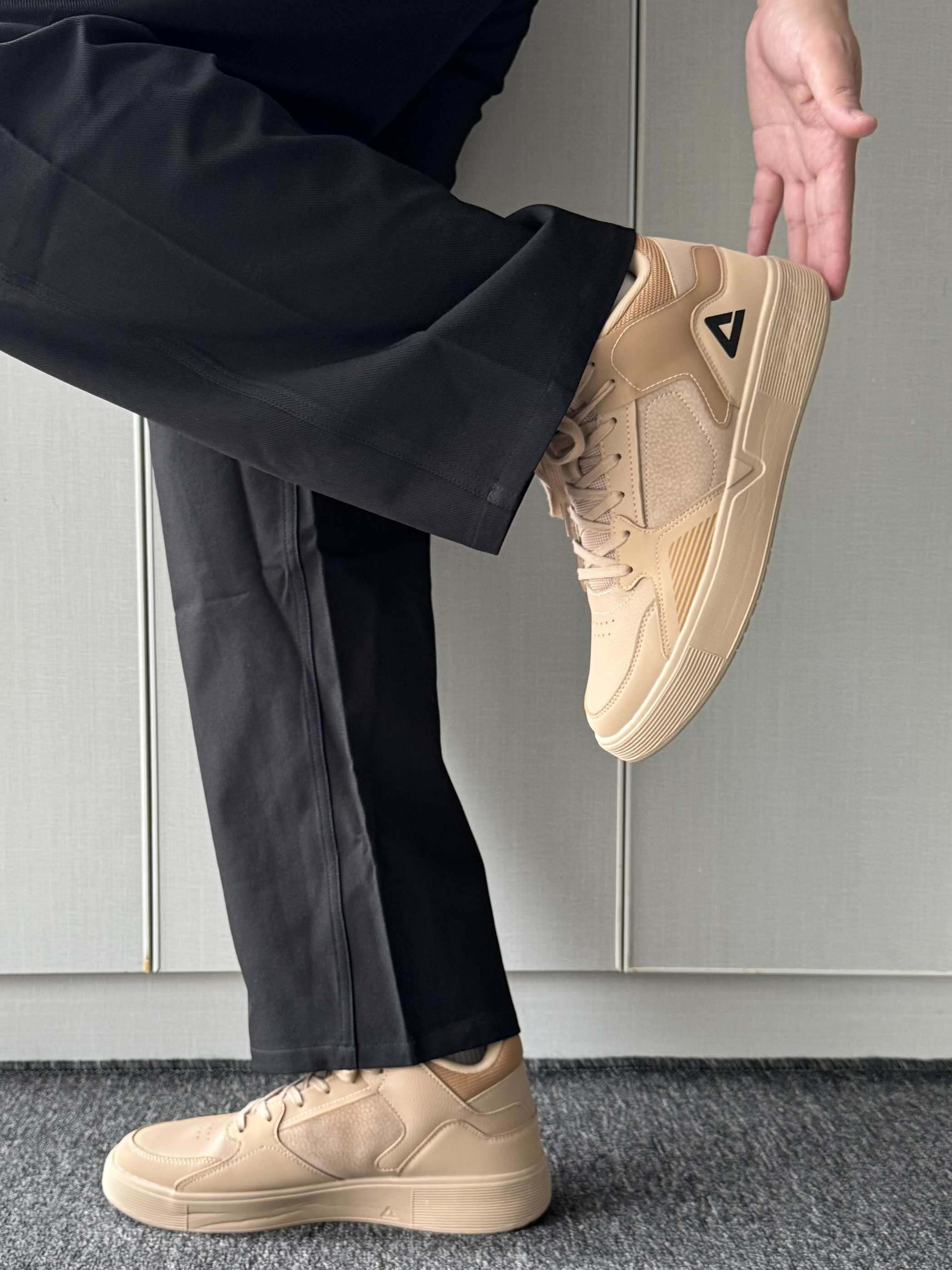 嘿嘿😁,我是阿玖 今日分享一款匹克板鞋👟 鞋身外观以小麦色🌾为主 在鞋后侧有一个黑色三角logo点缀 整体看着还比较有复古的气息🍂 同时辨识度也比较高✨ 鞋面采用多种皮革➕织物拼接 层次感丰富,而且触感柔软细腻 中帮的设计和轻量化发泡🧼的中底 整体穿在脚上包裹感比较好,而且脚感轻便 平时穿牛仔裤、工装裤、休闲裤都还不错👍 尺码也不偏码,但脚背高的建议大一码选✅
