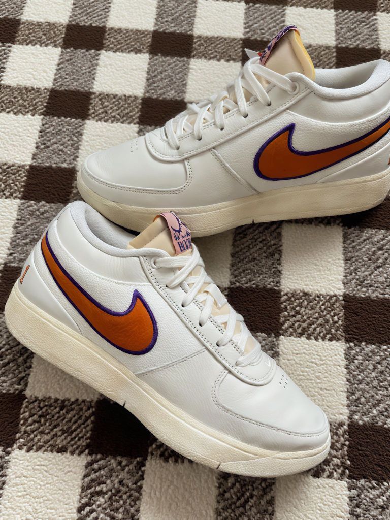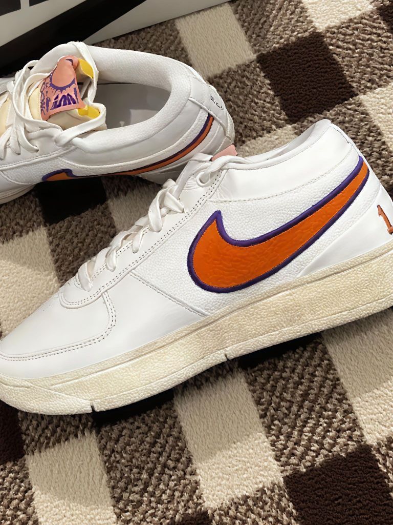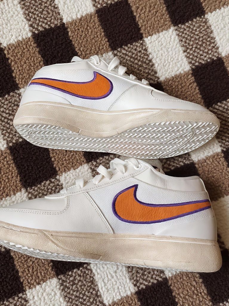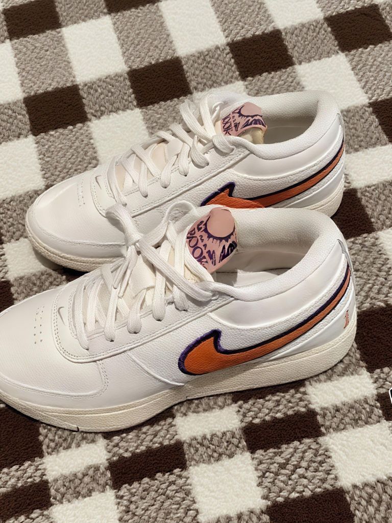 这双耐克板鞋颜值好高呀✨!主体是白色,搭配橙色和紫色的Swoosh标志,色彩搭配很亮眼,鞋型也很经典,看着就很有活力。材质是皮革的,摸着质感不错,也比较好打理~ 上脚的话,包裹性还可以,走路挺舒服的。搭配方面,不管是牛仔裤还是运动裤,都能搭出不错的效果,休闲又时尚,日常出街或者上学穿都很合适🥳。 不过有个小缺点,刚穿的时候,鞋帮那里有点硬,磨脚踝,得穿几次才慢慢适应。但整体来说,还是很喜欢...