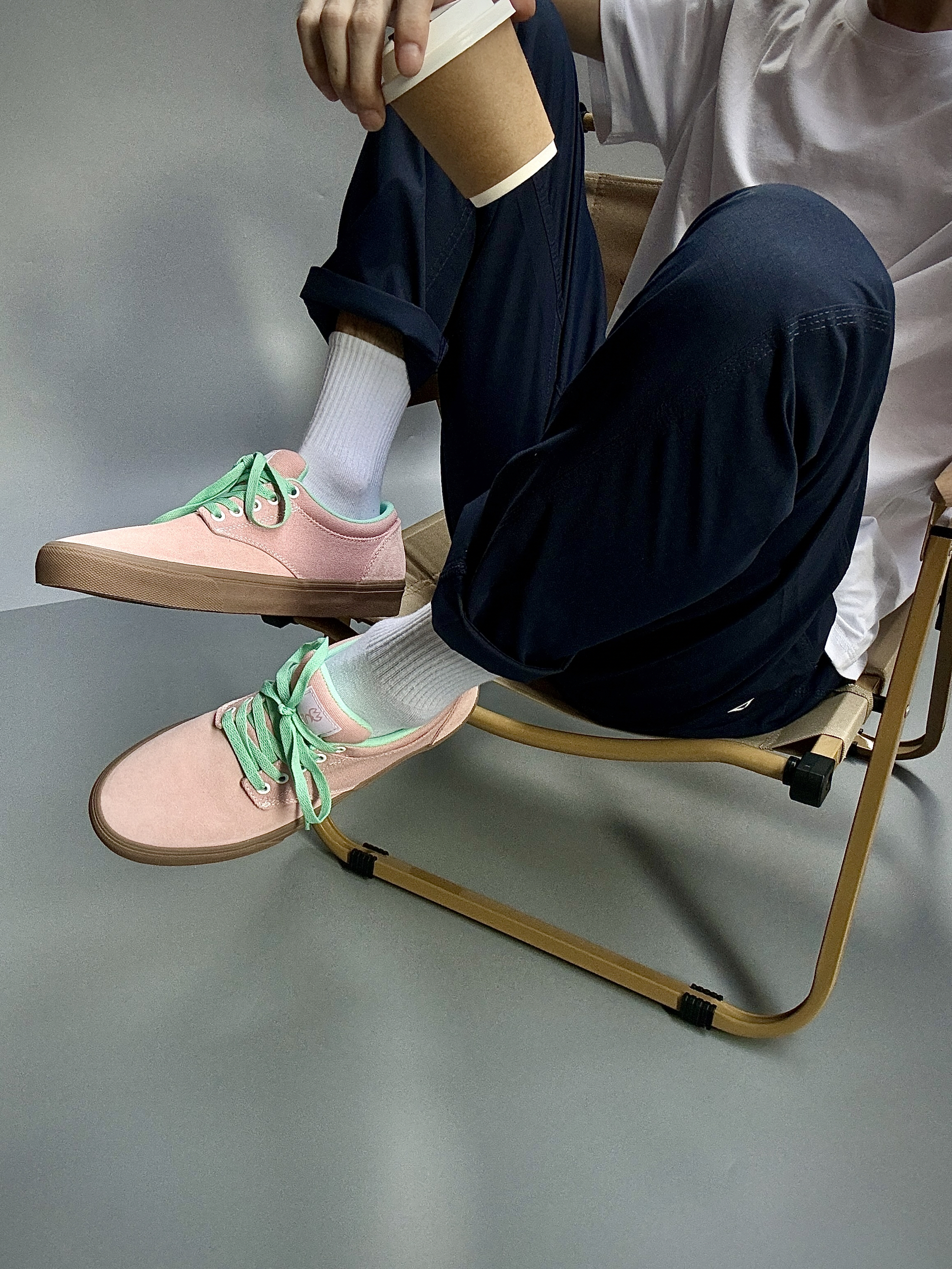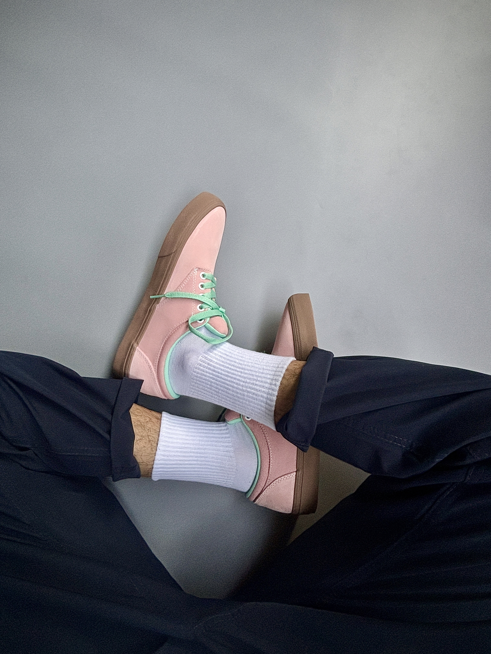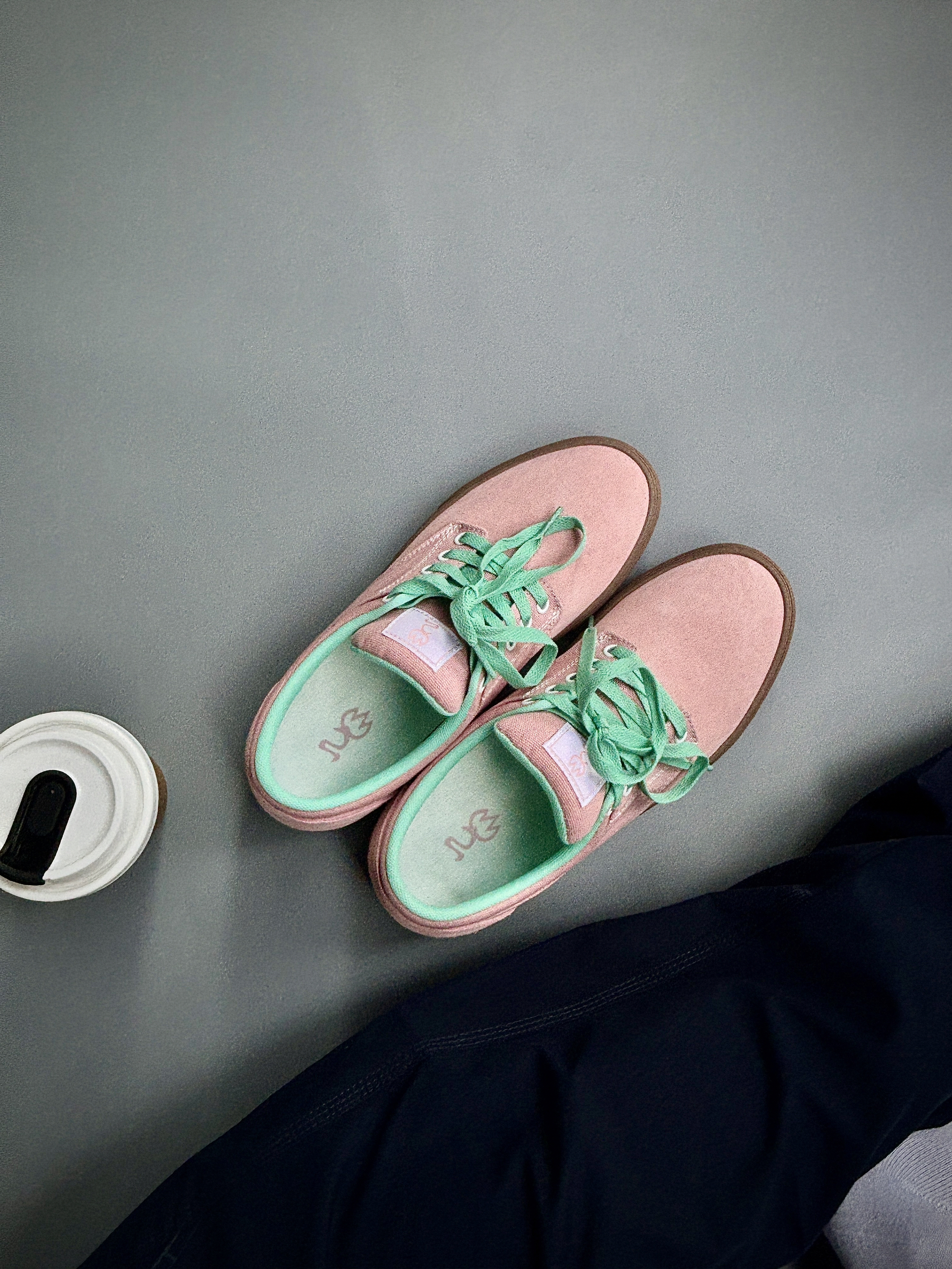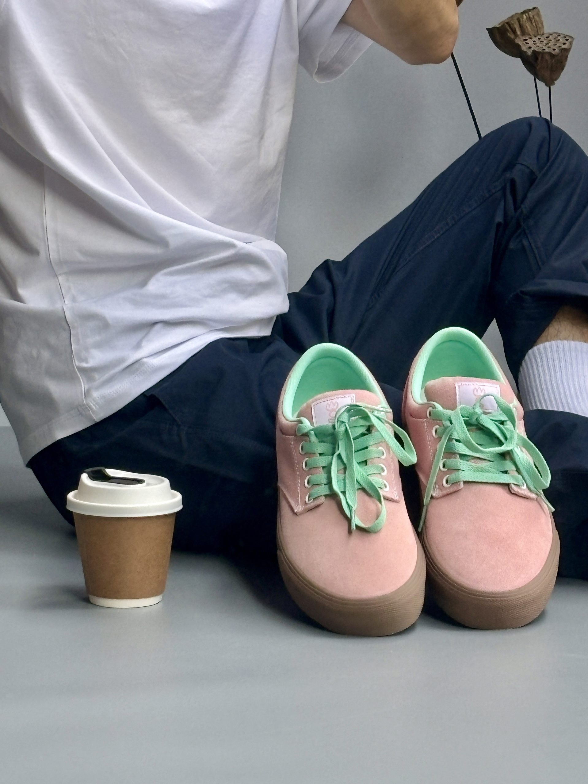 第一次尝试穿粉色鞋子,怕不好搭衣服,但这双柔粉色真的绝了!是那种很温柔的粉,一点不显黑,男生女生都能穿! 鞋面是翻毛皮+帆布的,摸起来质感特别好,而且透气不闷脚。鞋底软硬适中,穿去逛街走半天都不累~ 最惊喜的是这鞋才一百多块,做工细节很yYYDS😂 今日搭配: ▪️藏青色工装裤+白T