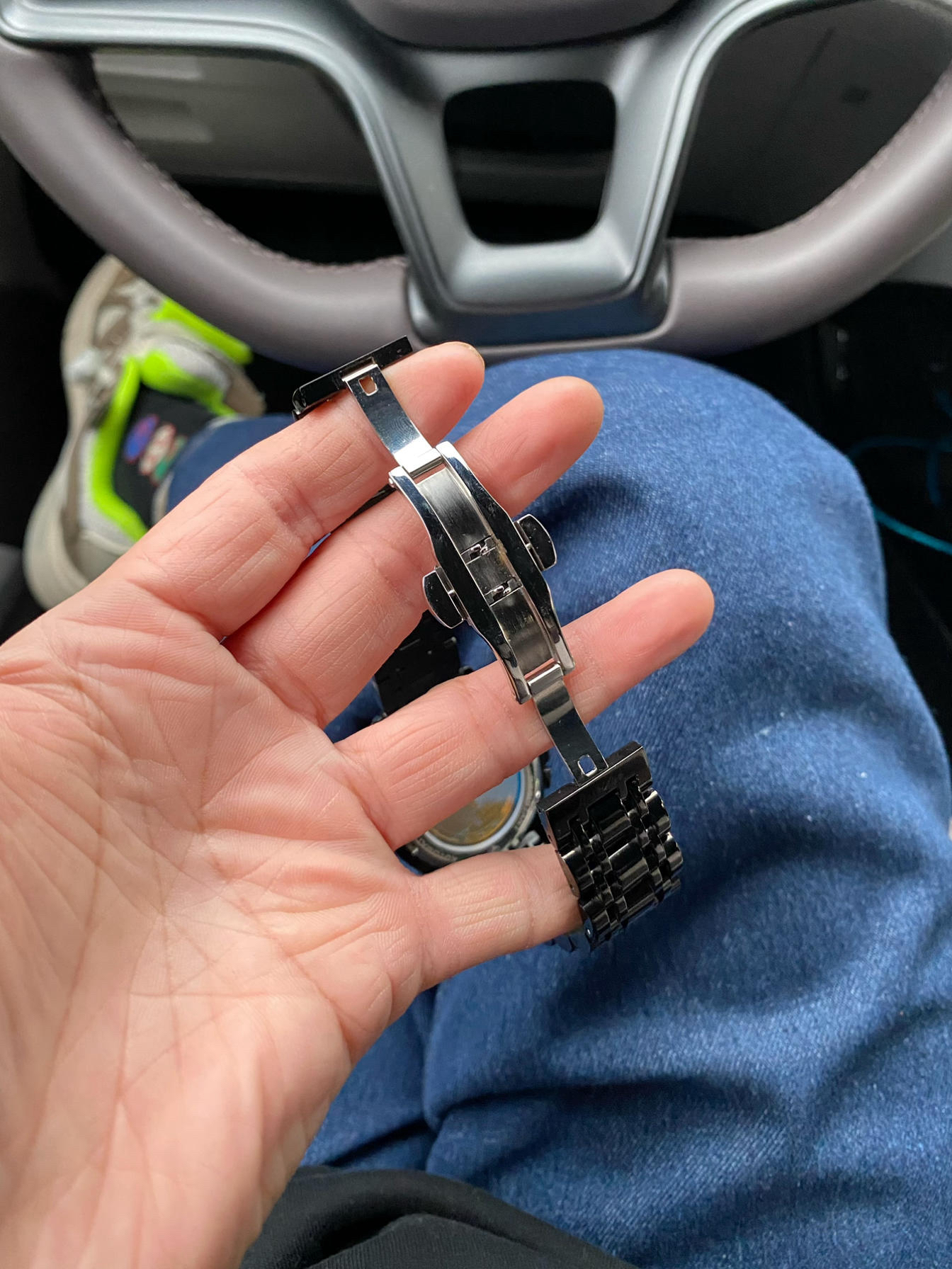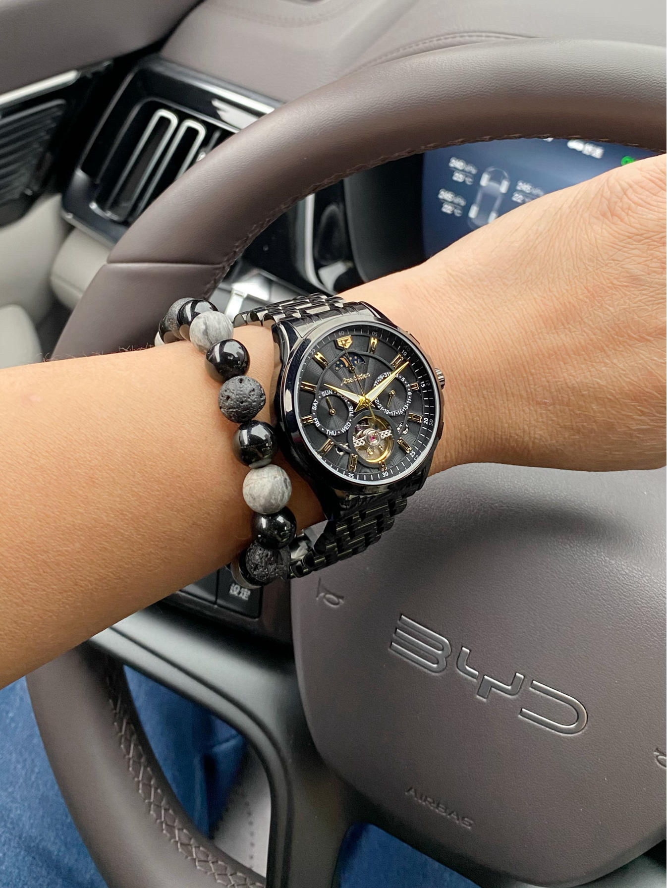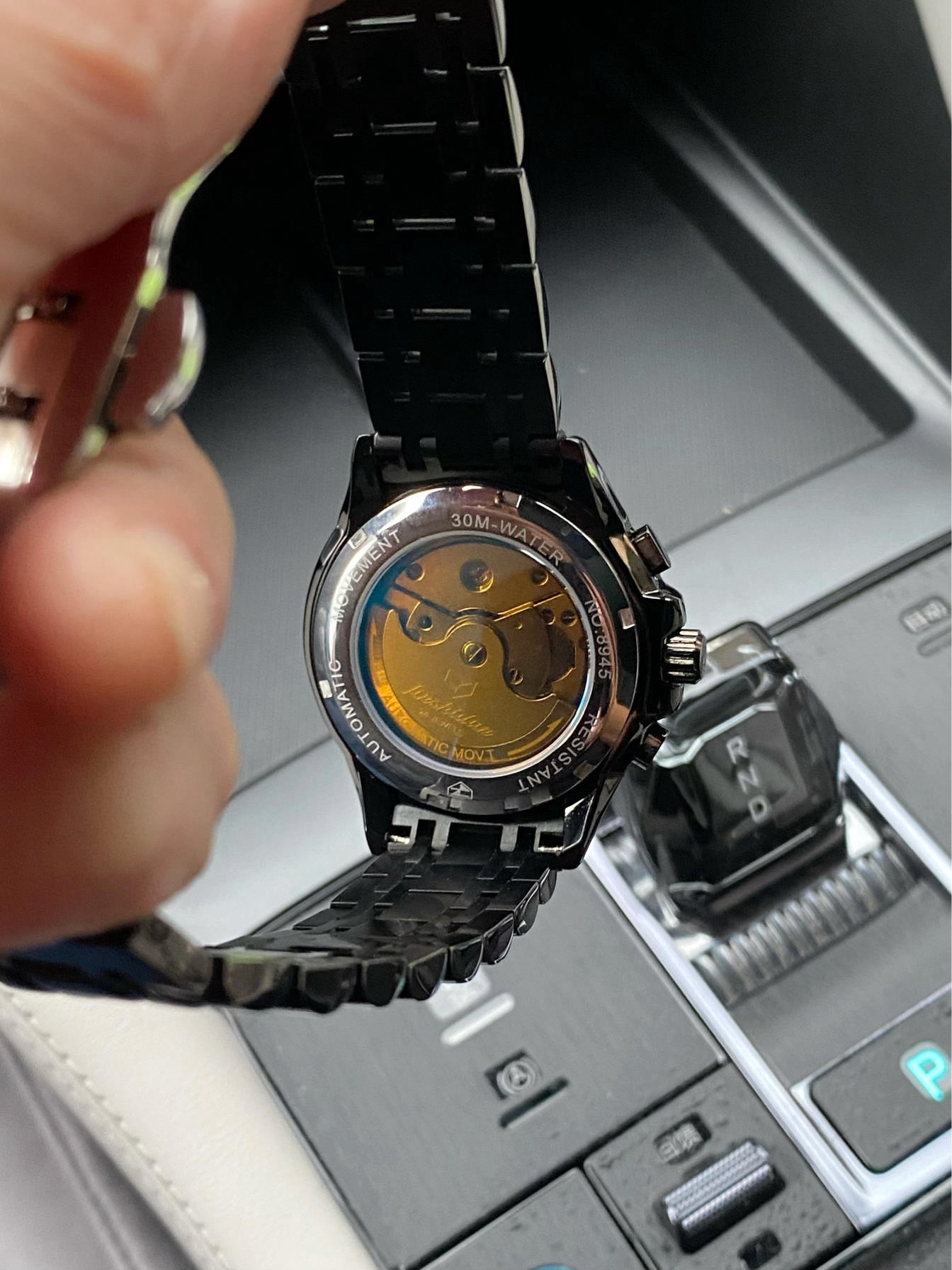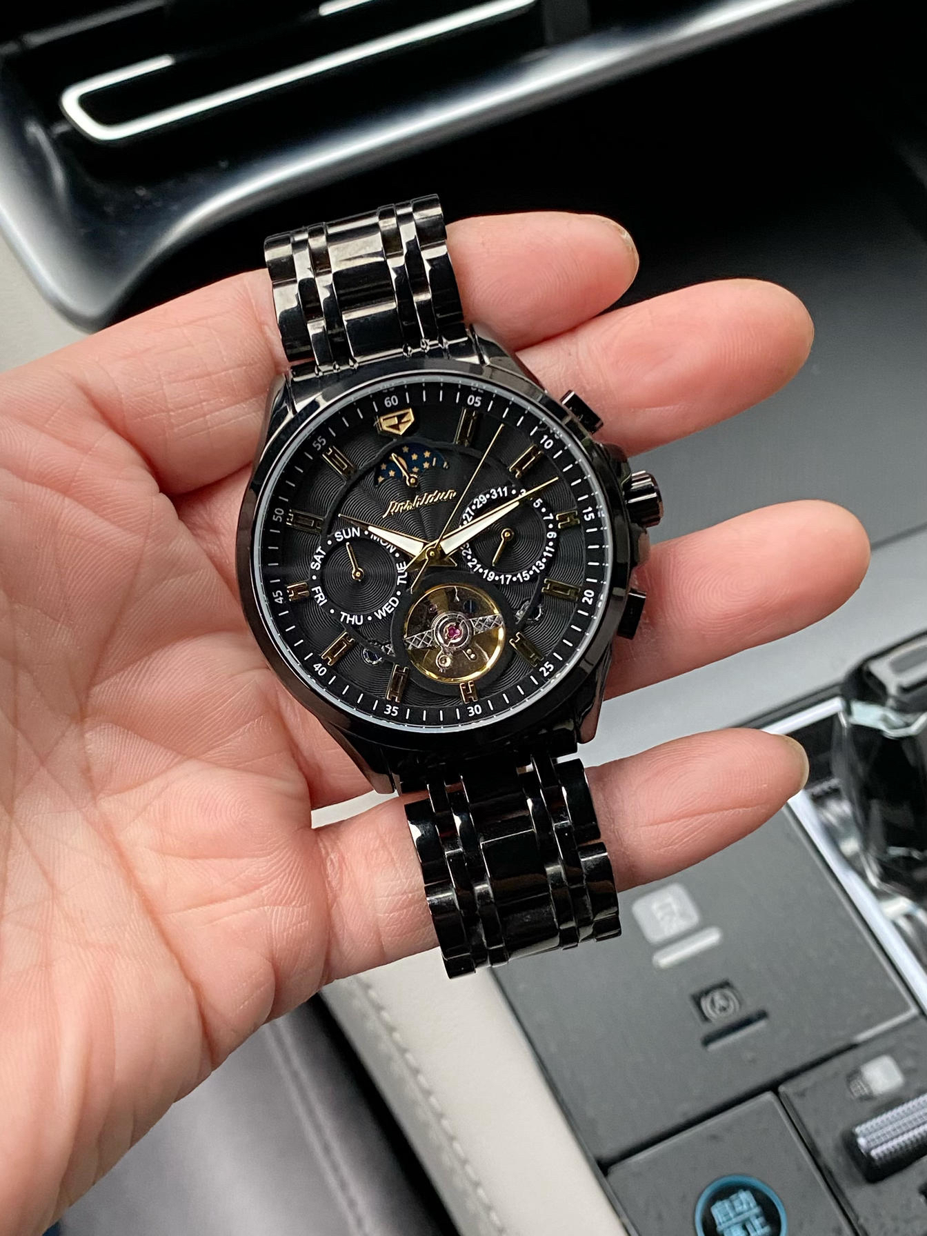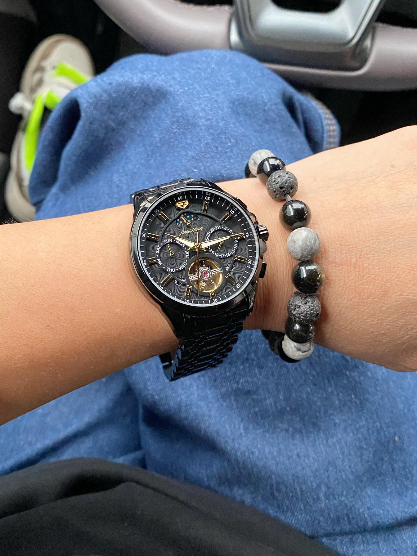 这块表我真的爱惨了 全黑的金属表带锃亮锃亮的, 表盘能看到金色的机械结构, 又酷又有质感, 不管是上班戴还是出去玩戴都合适