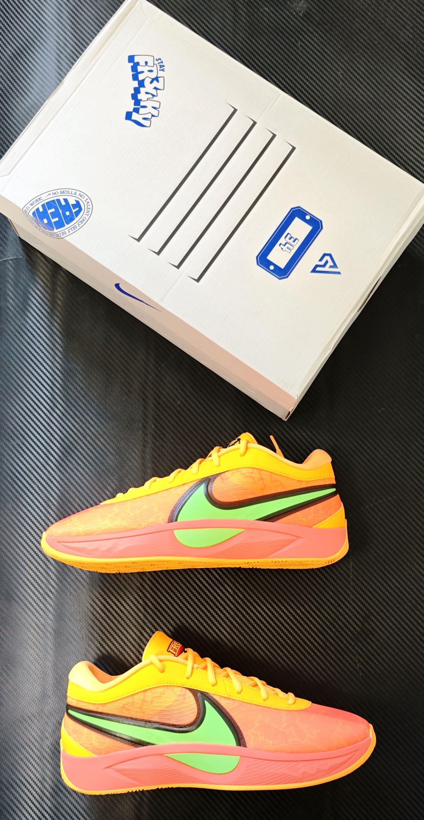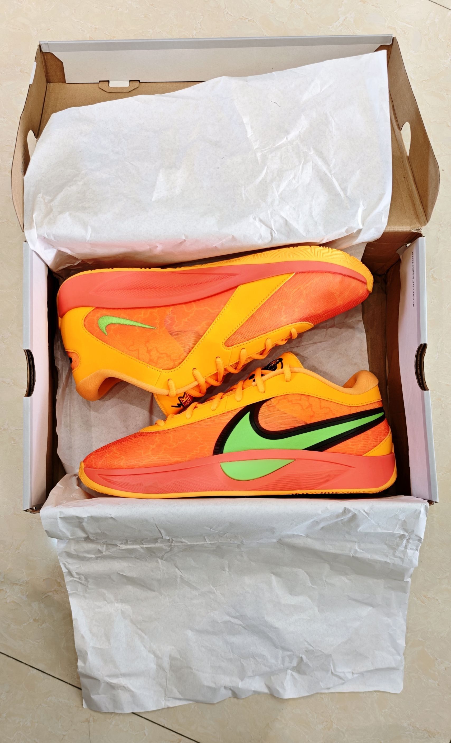 Nike Giannis Freak 6 “Orange Blaze”球鞋评测 一、 开箱印象:高能配色,细节拉满 开箱瞬间即被亮橙主色+荧光绿Swoosh的视觉冲击力吸引。鞋面采用编织材质,搭配黑色线条勾勒层次感,后跟字母专属logo细节满分,整体设计兼具潮流感与实战属性线条流畅。 二、实战感受 1. 抗扭与支撑 - 中足内置抗扭片,配合特殊编织鞋面,在急停变向时提供刚性支撑,脚踝包裹...