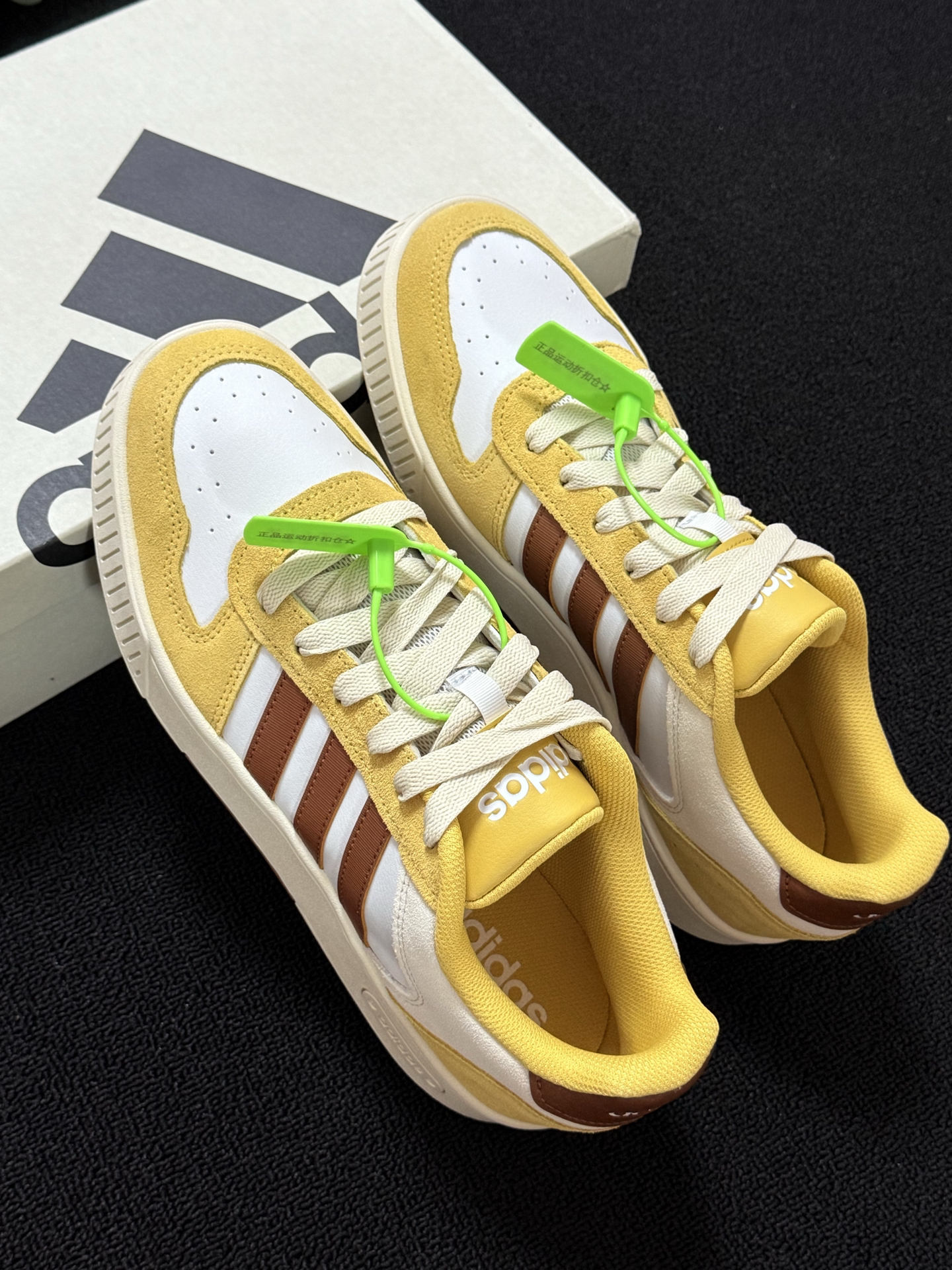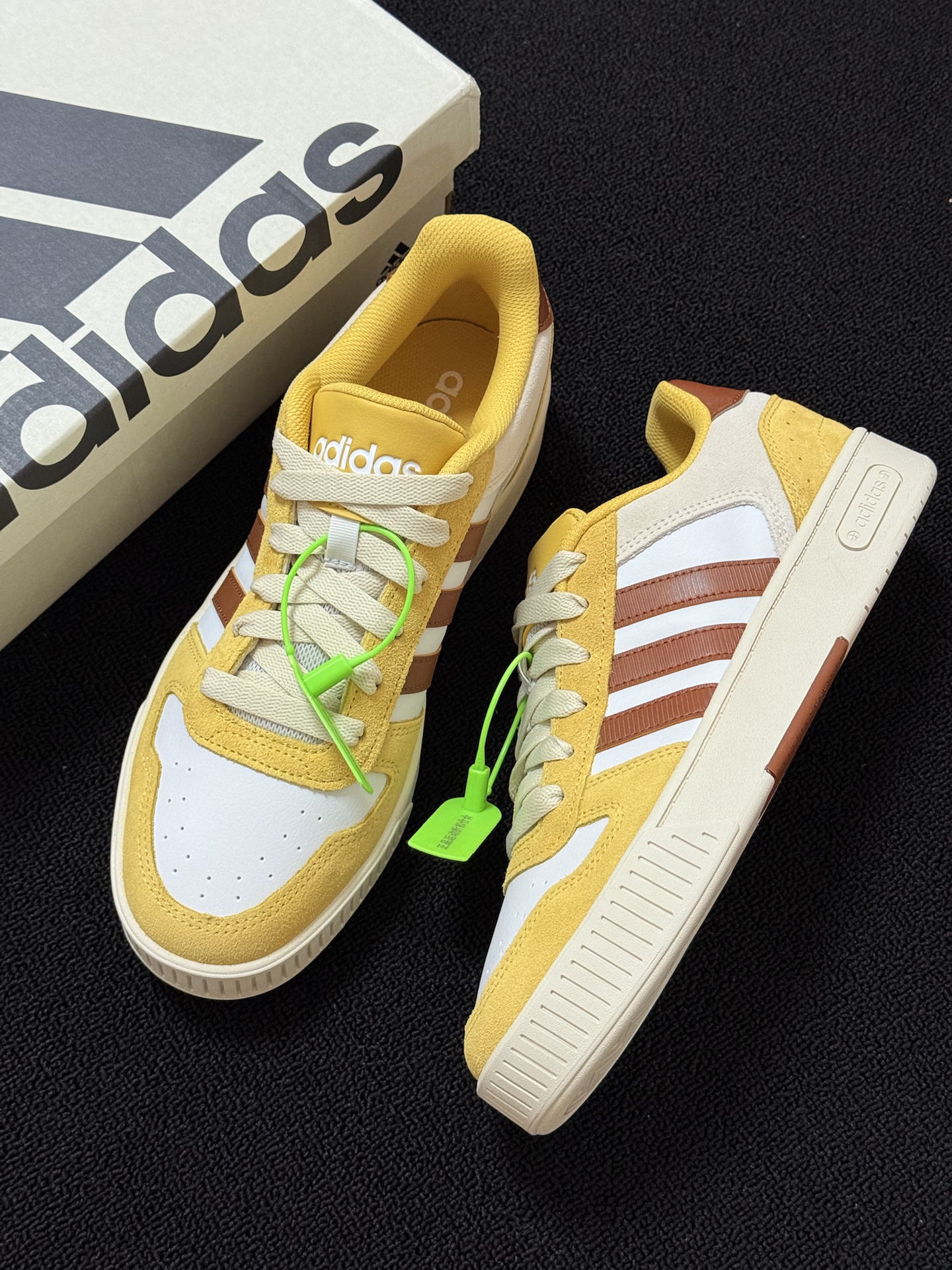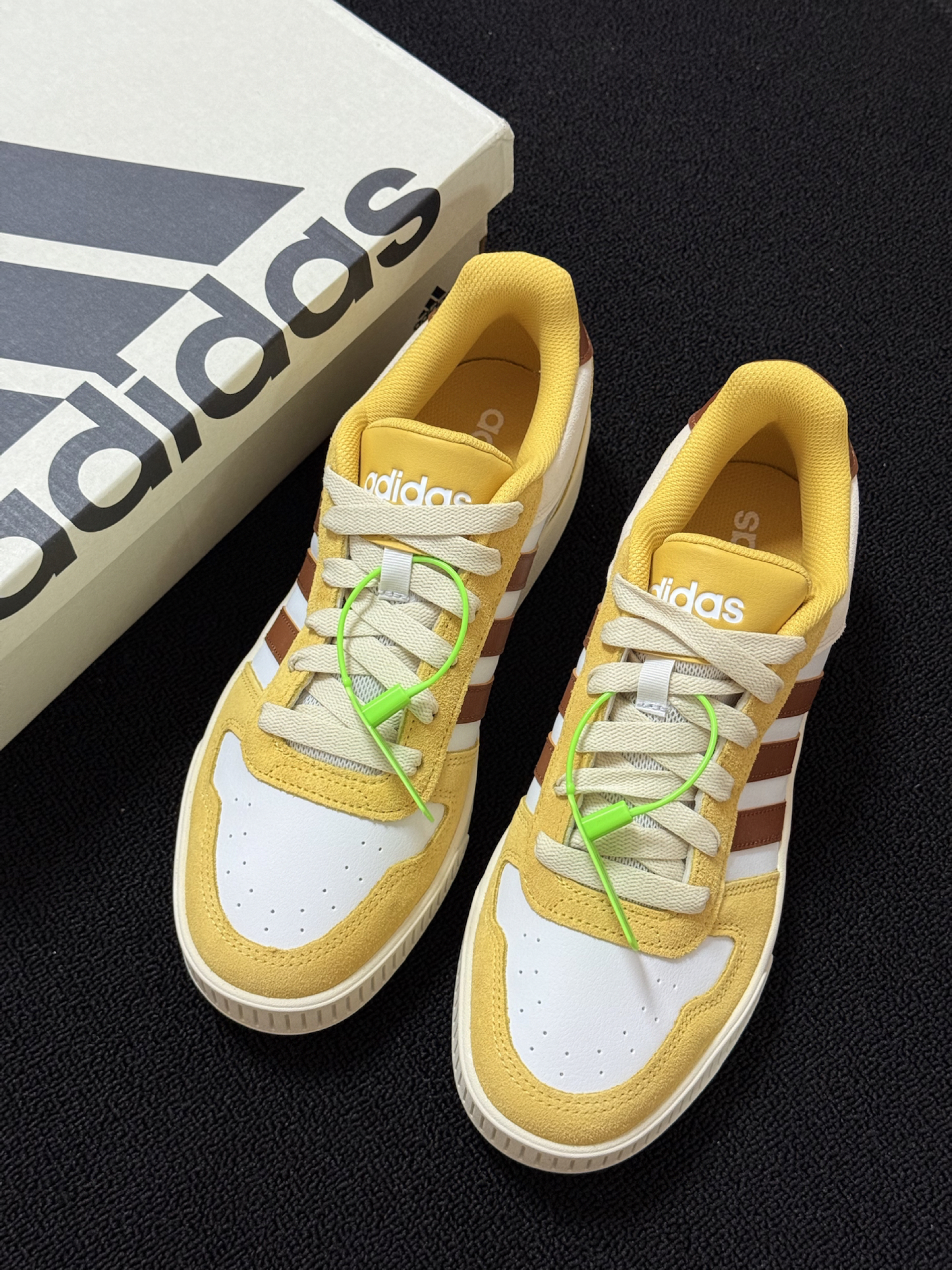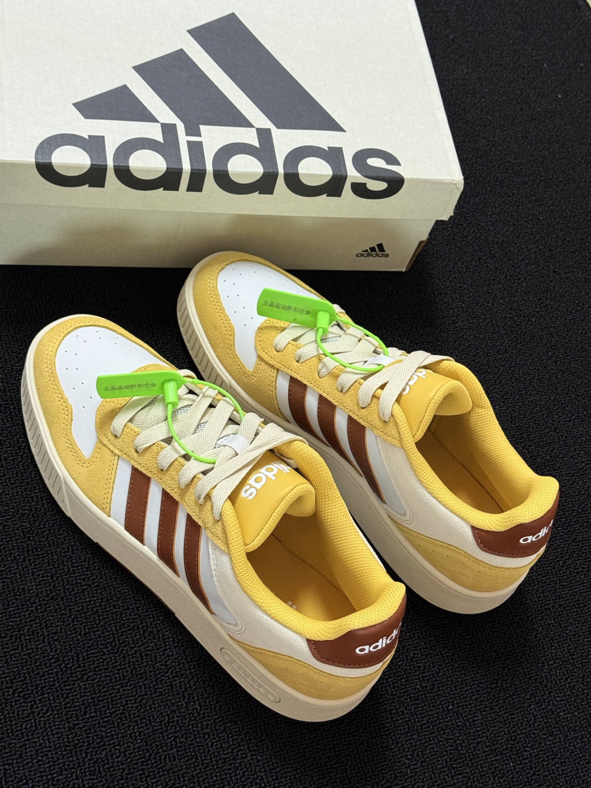 今日分享一双复古感阿迪达斯板鞋 拿到手这个配色真的惊艳到我了 黄色的外观与秋季的贴合度极高 鞋面采用了翻毛麂皮和皮革材质结合 有质感看起来也有档次 鞋底采用结实的橡胶材质 防滑又耐磨 我上脚试了一下 感觉jio感还蛮不错滴 走路感觉软软的 不板脚 尺码标准